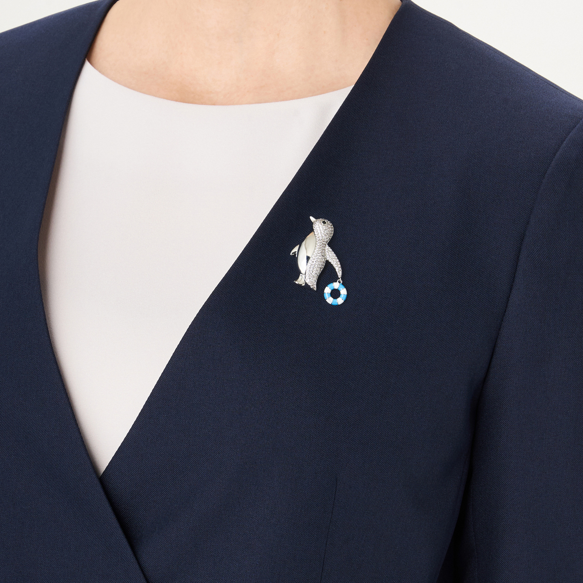 水の中へ向かうペンギンが、装いにワクワク感を添えてくれるブローチ。眺めているだけでも心が和み、身に着ければ、元気をもらえそうな明るく愛らしいデザインです