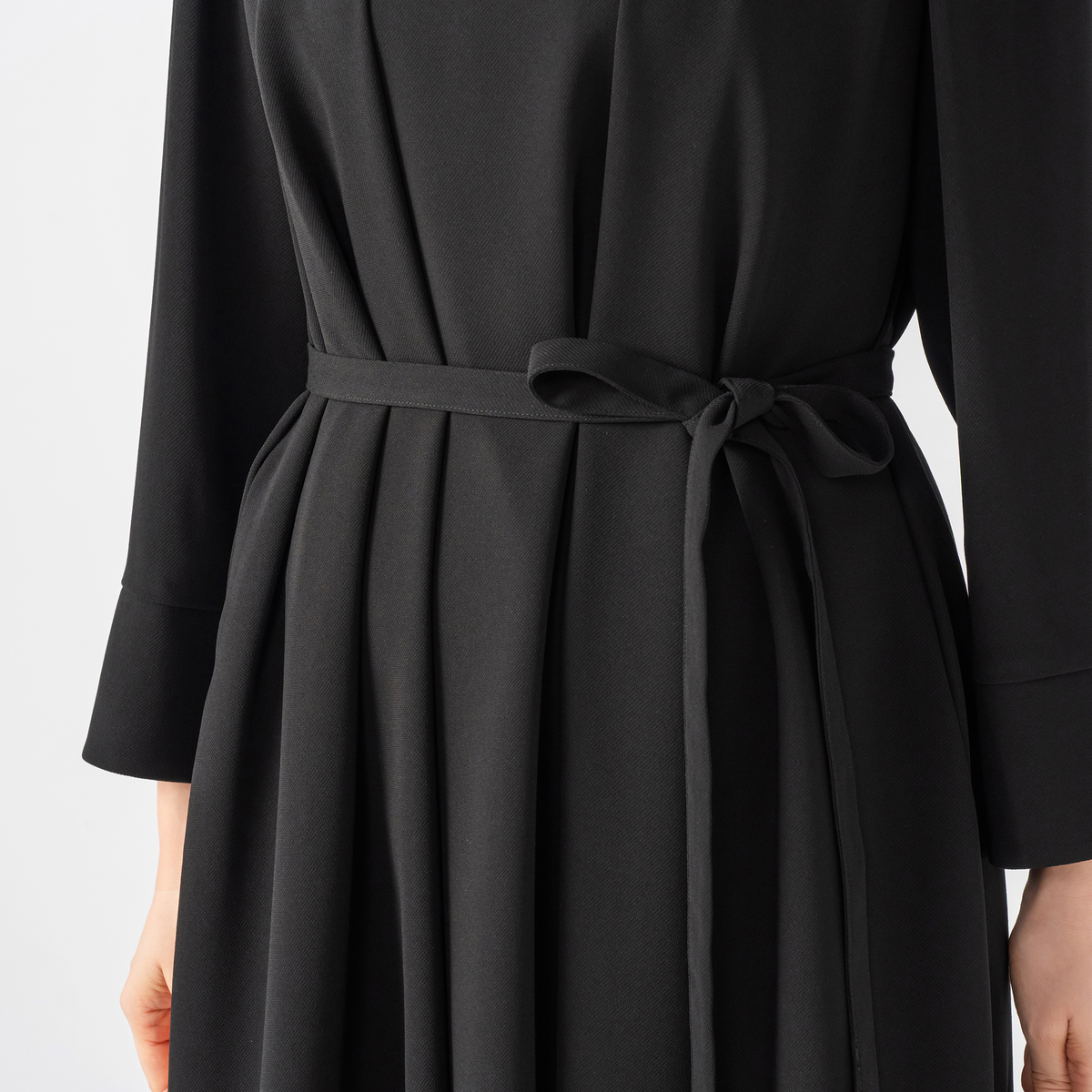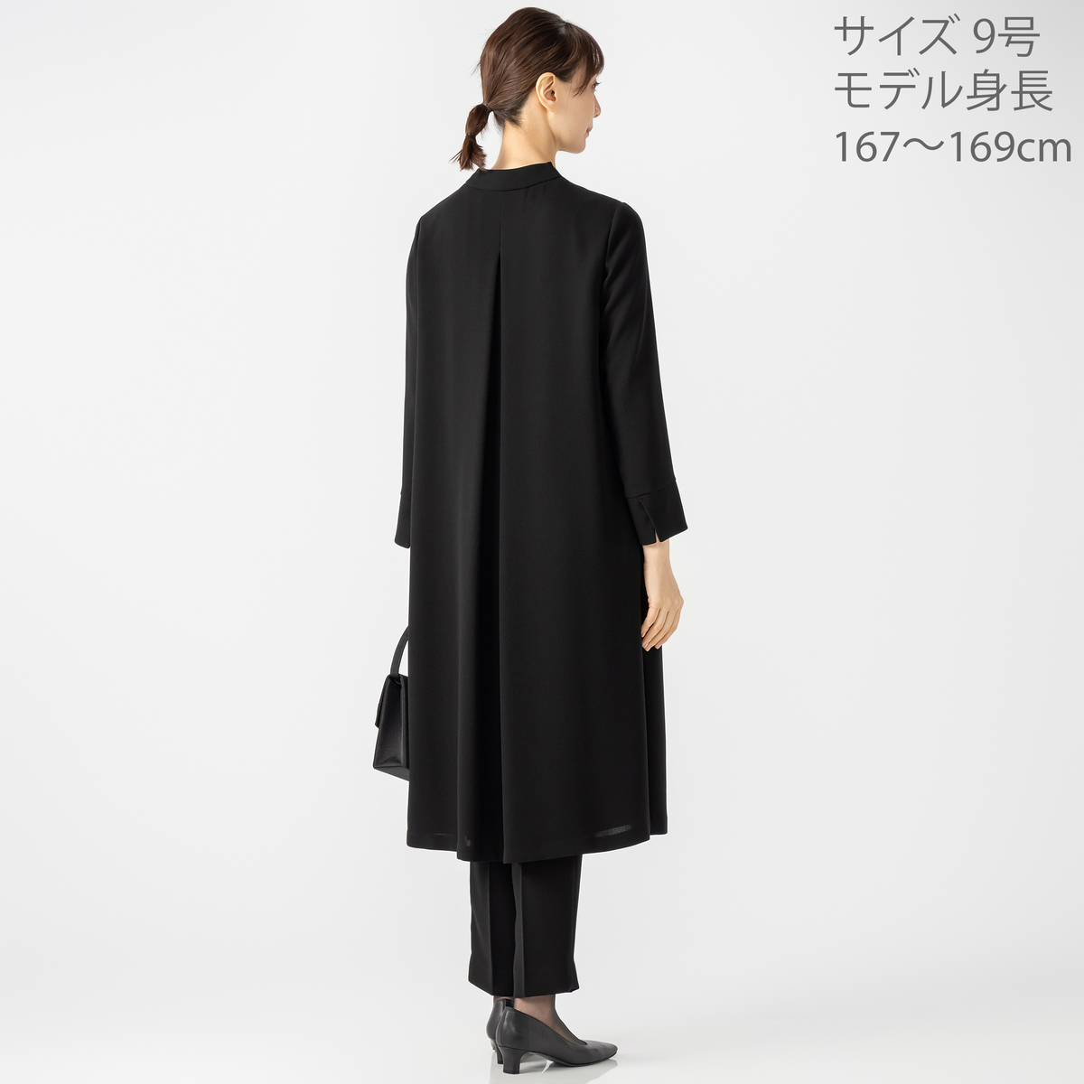 たっぷりとした分量感で体型をカバーしつつ、直線的なラインで視覚的にすっきり見えるシルエット。共布ベルトでウエストを絞ればスタイルのアレンジも。前ファスナー開きで着脱もラクに。取り外し可能なブラックパール調チョーカーネックレス付きです