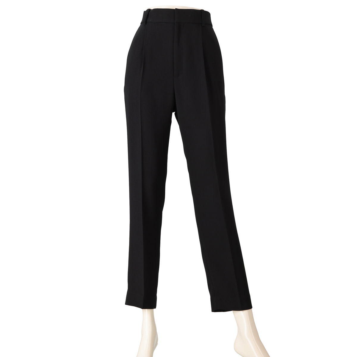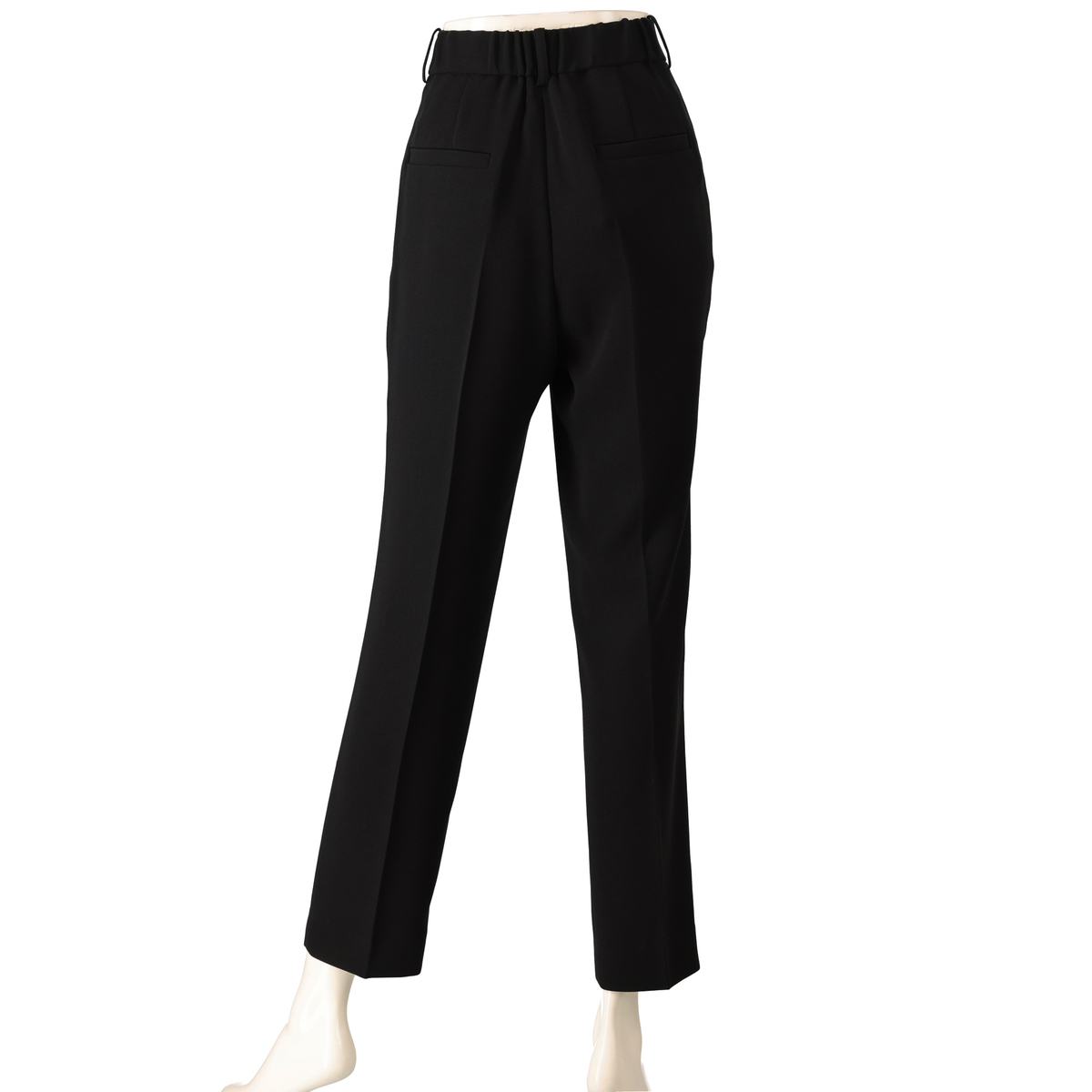テーパードパンツは深めの股上とウエストタックでお腹周りをカバー。後ろ一部はゴム仕様のラクな穿き心地。裾に向かって細くなるシルエットとプレスの縦ラインで、よりほっそり見えが叶います