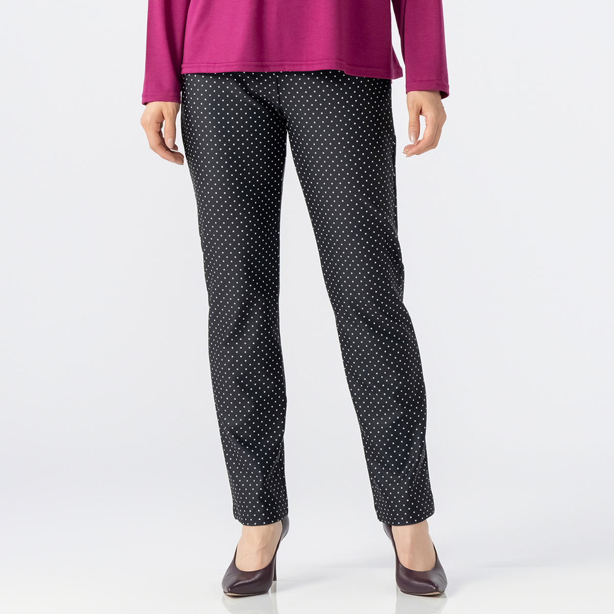 レギンスとステテコを組合せたレギテコパンツ。リアルな写真調のプリントやドット柄など、様々な柄を転写プリントで施しました。カジュアルからきれいめスタイルまで幅広く活躍してくれます
