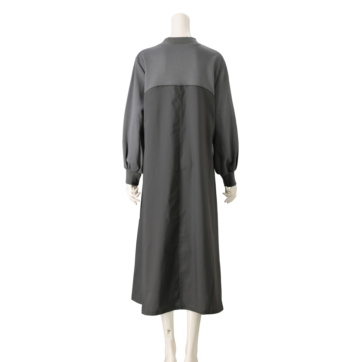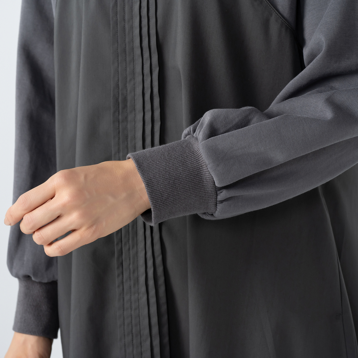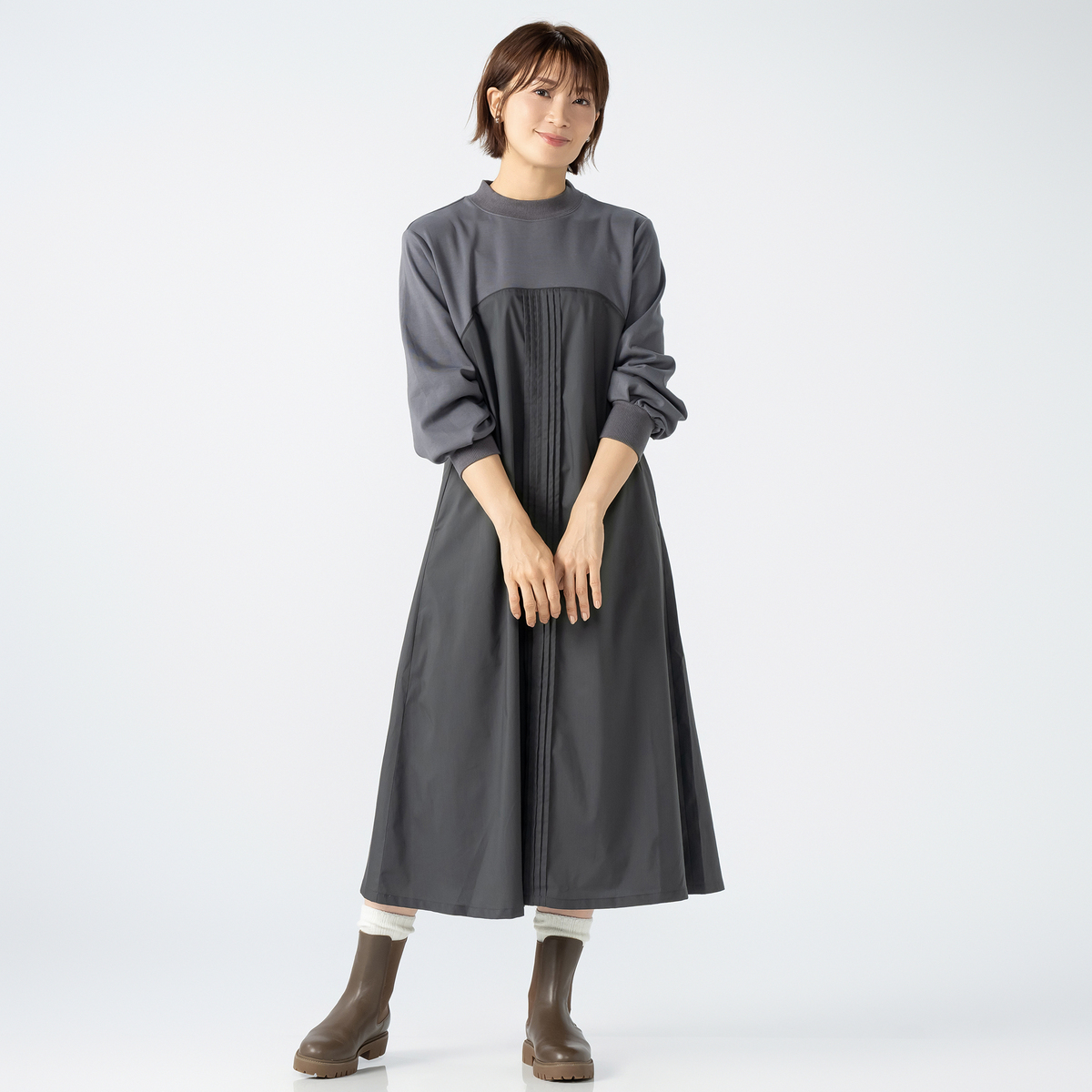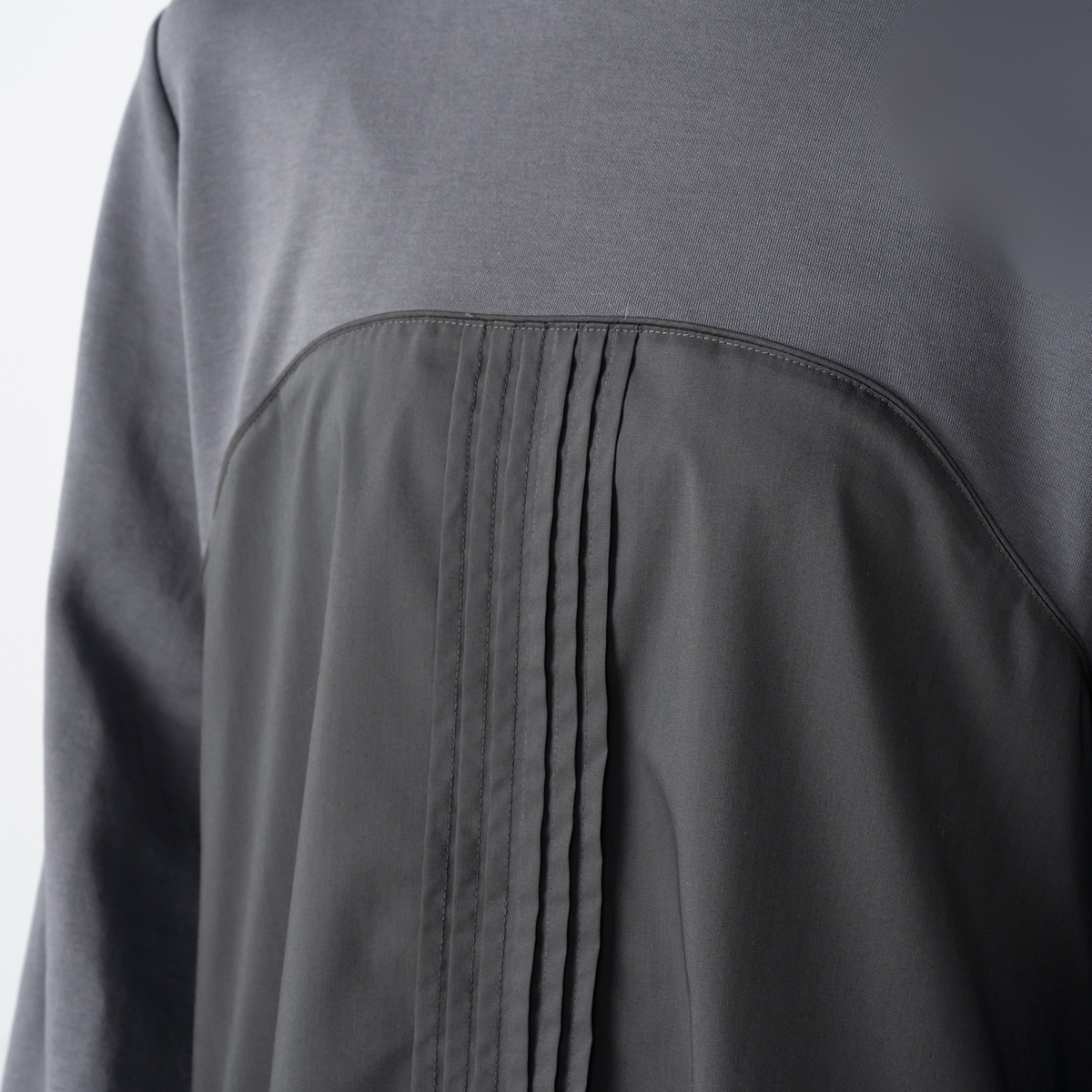 綿の裏毛とストレッチ性のある布帛を組合せたワンピース。ビスチェ風の切り替えにパイピングテープを挟み、前中心に6本のピンタックをかけて、デザインポイントにしました