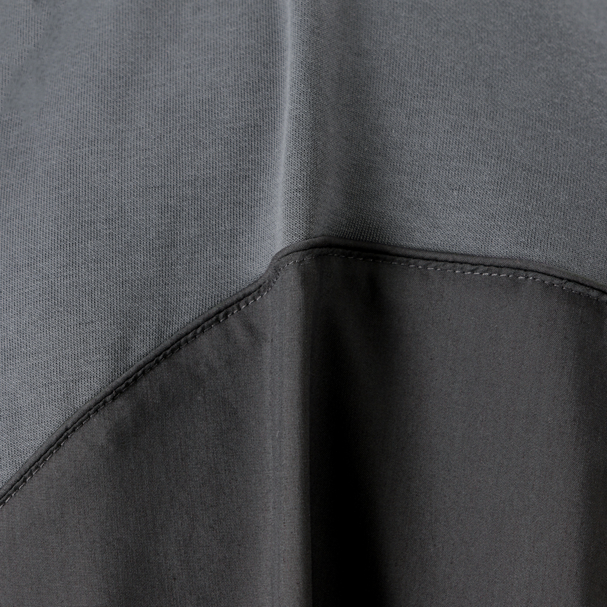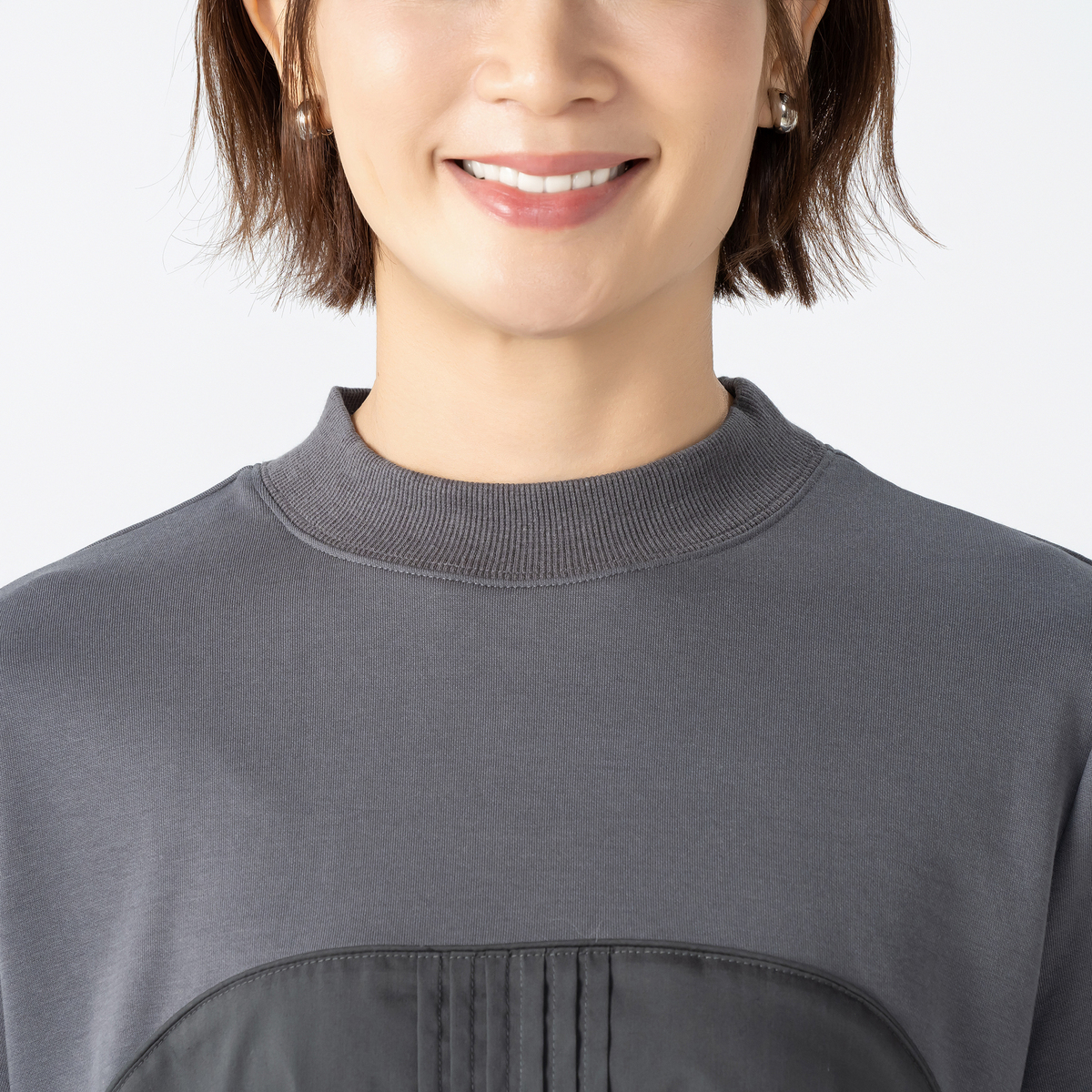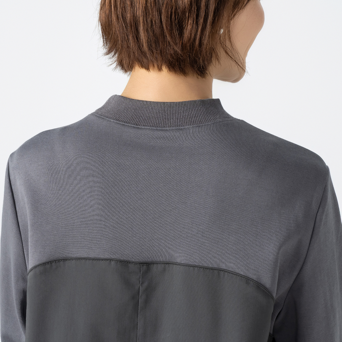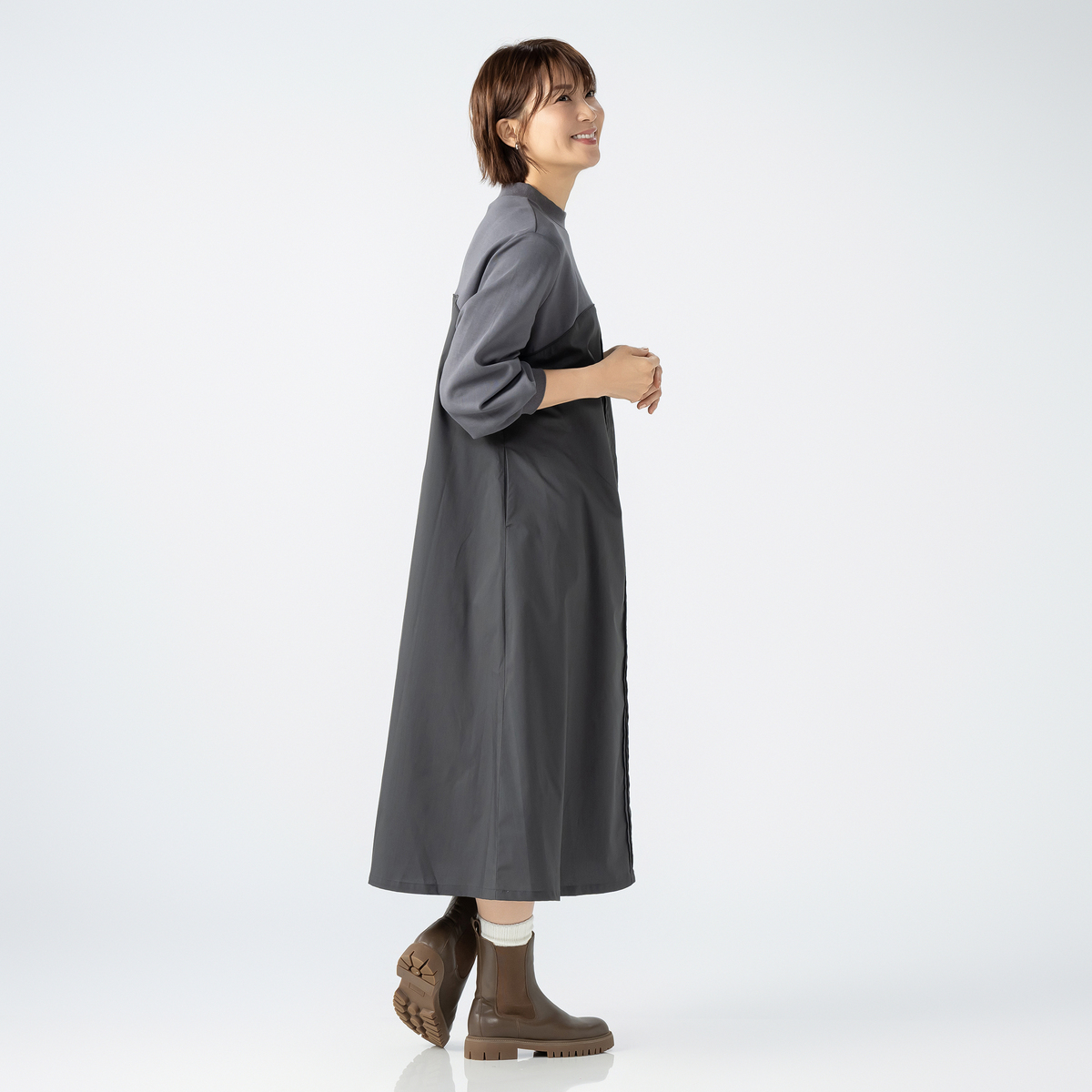 綿の裏毛とストレッチ性のある布帛を組合せたワンピース。ビスチェ風の切り替えにパイピングテープを挟み、前中心に6本のピンタックをかけて、デザインポイントにしました