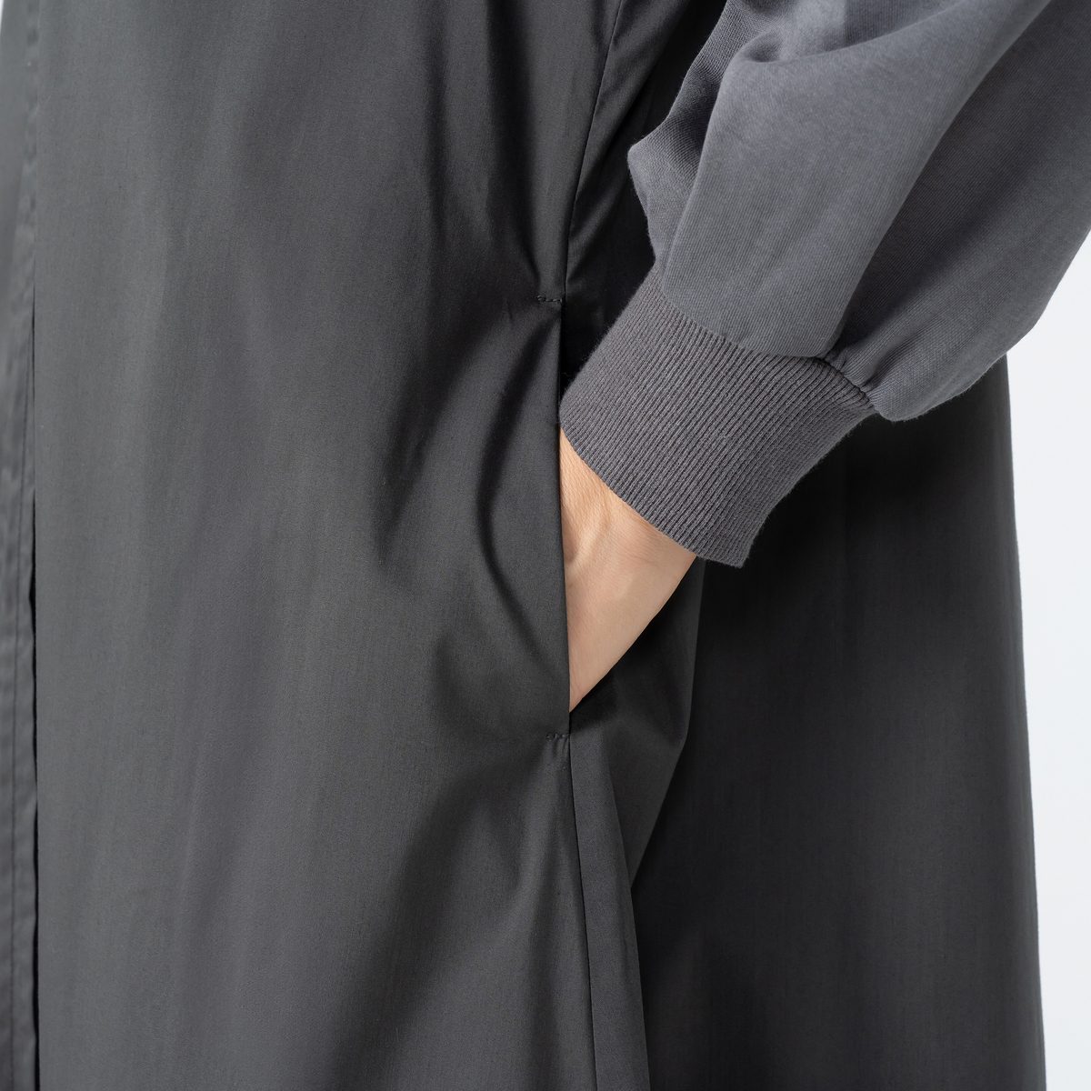襟元と袖口にリブニットを配し、やわらかで程よいカジュアル感をプラス。リラクシーで、日常のお出かけにもぴったりな一着です