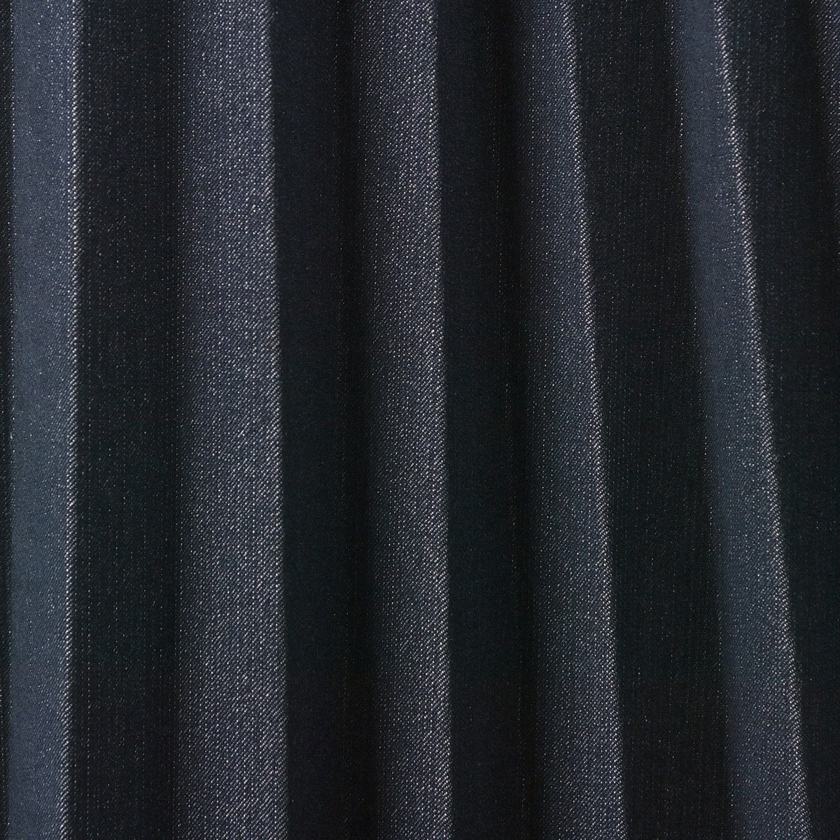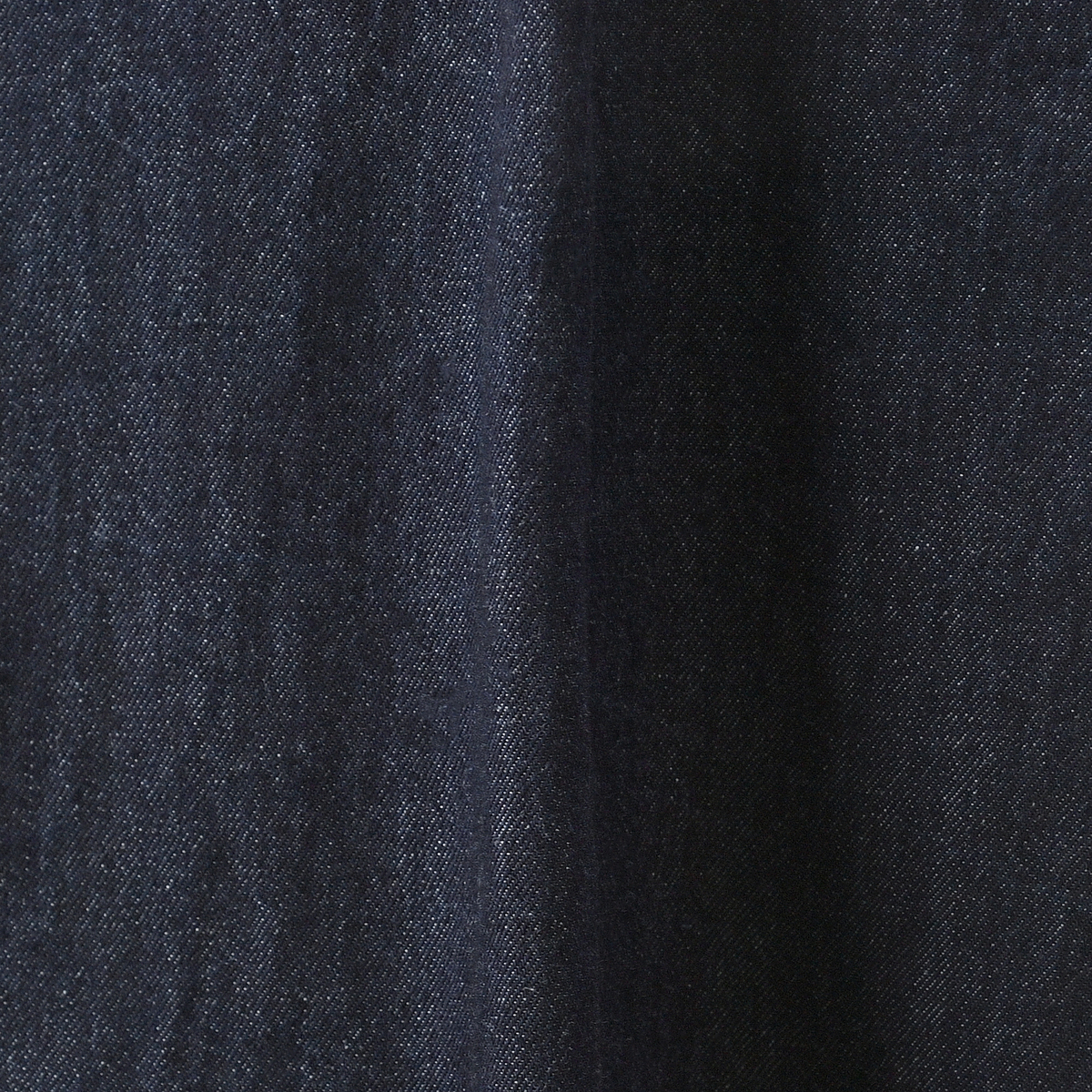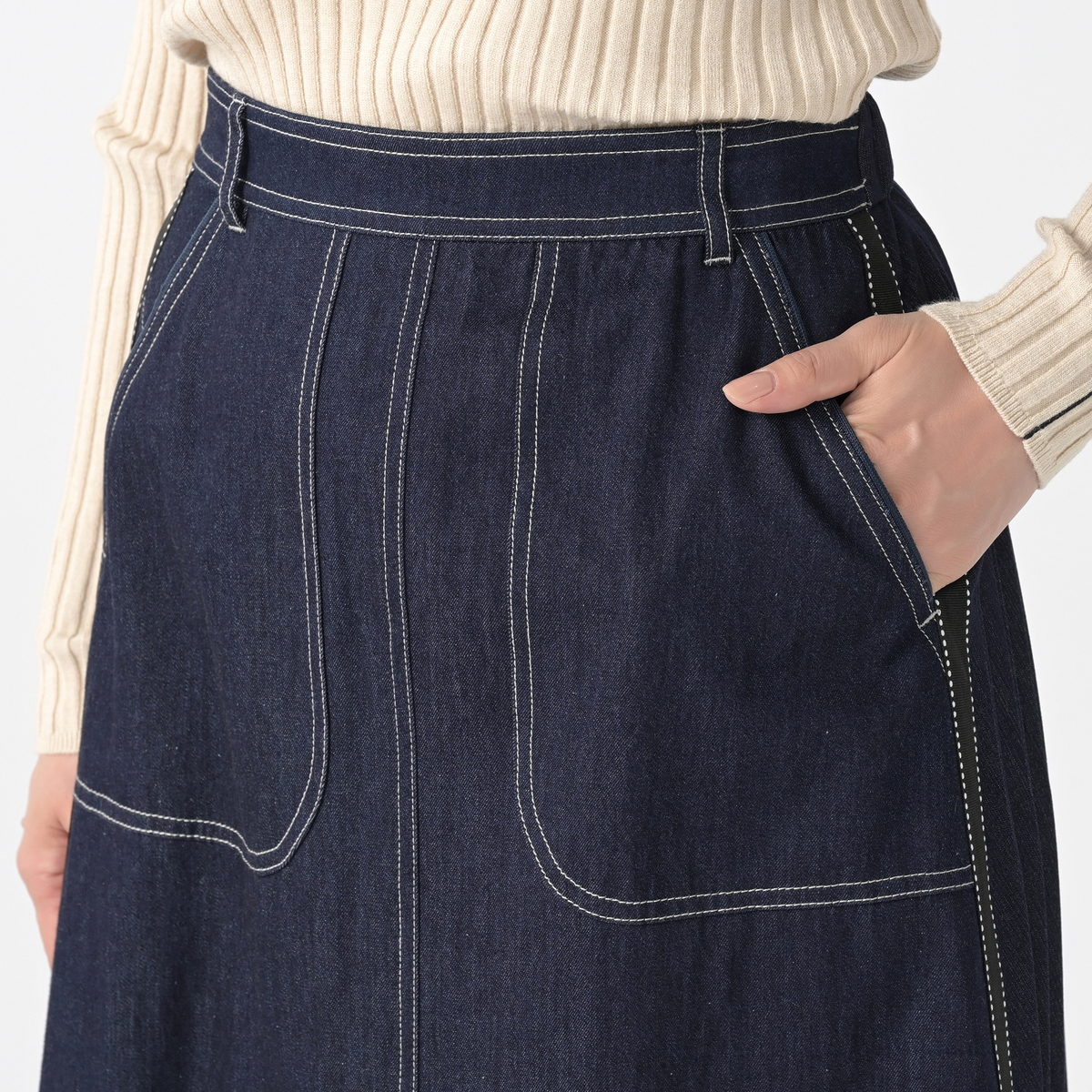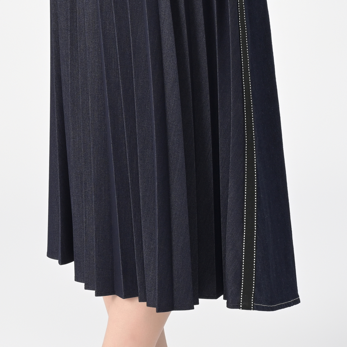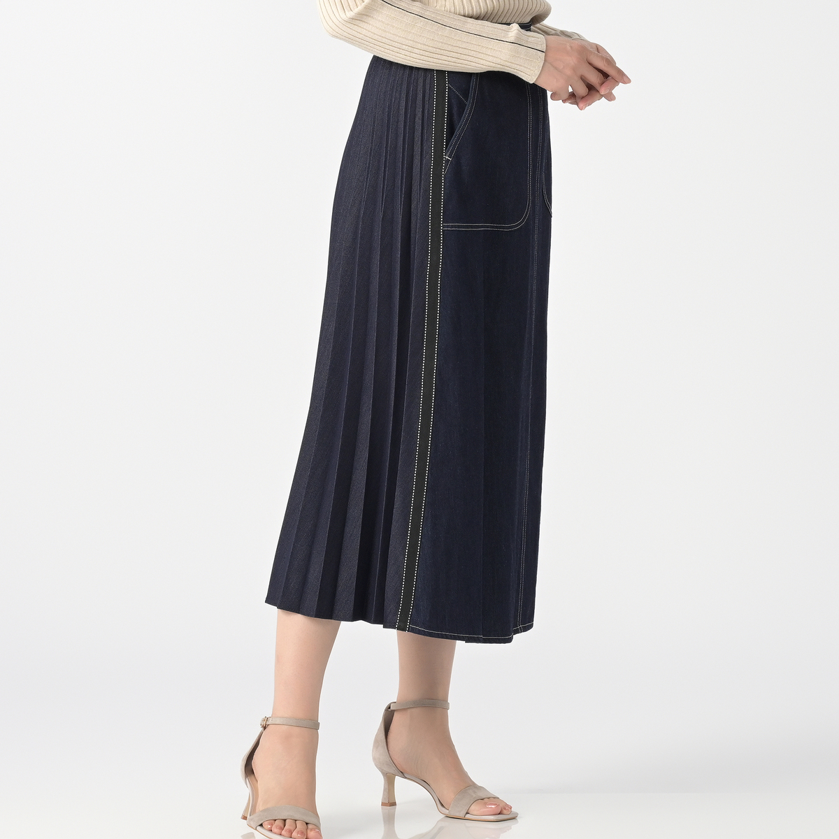 前スカートにはデニムの生地洗い、後ろスカートには合繊のデニムにプリーツをかけてデザイン。前後で印象の異なるカジュアルなスカートです。脇にあしらったストレッチの効いたグログランテープがアクセントになっています