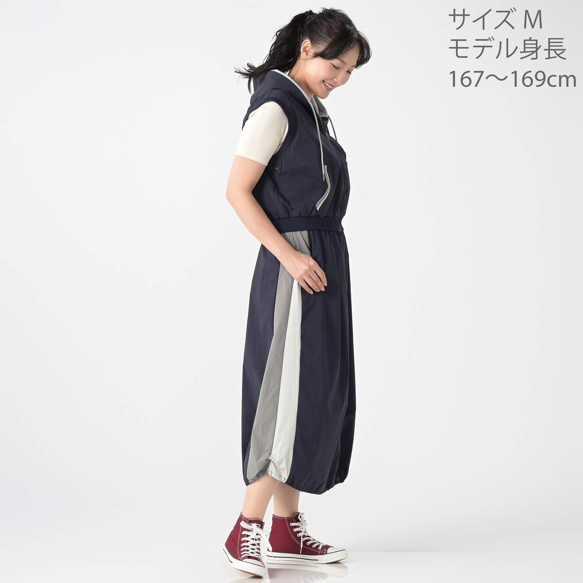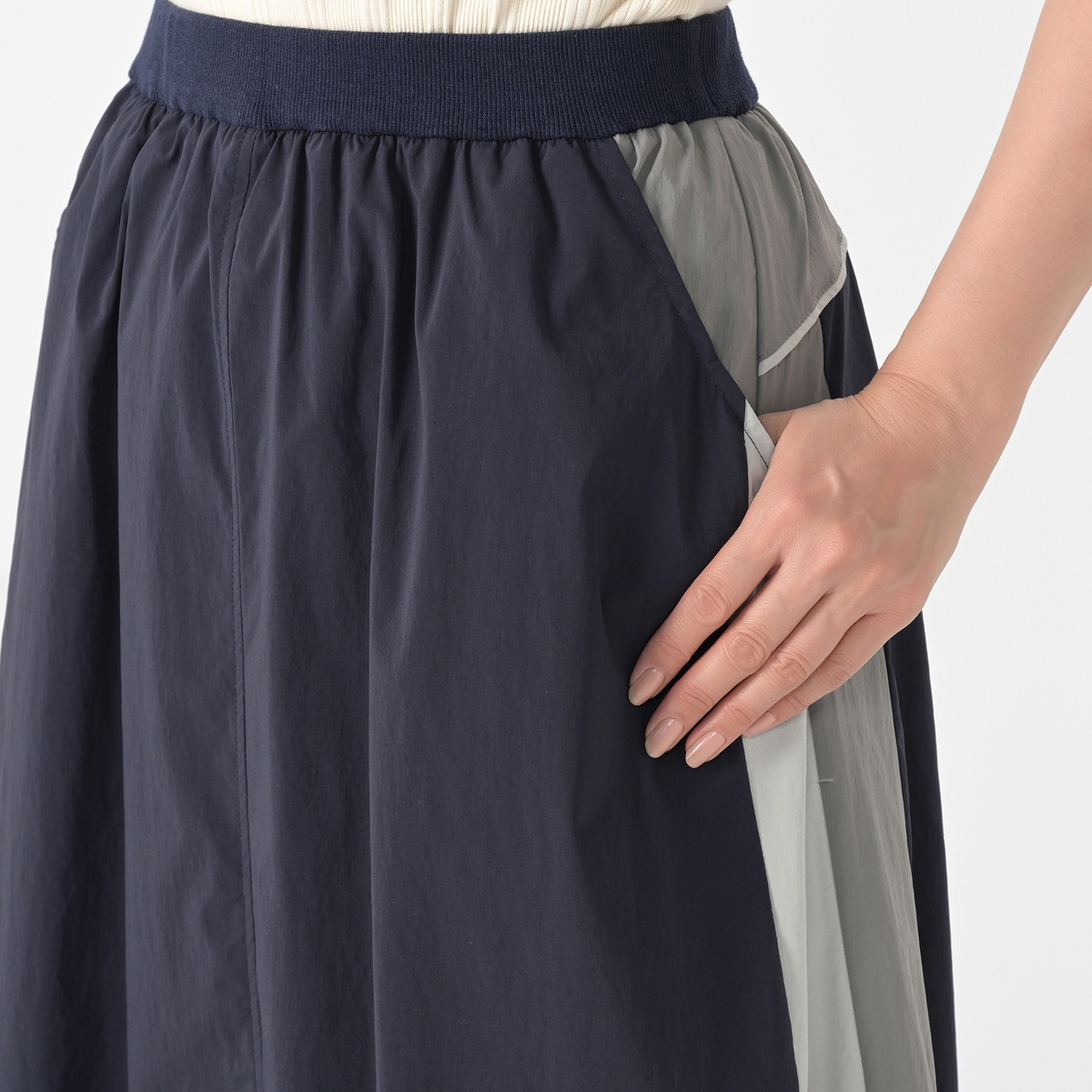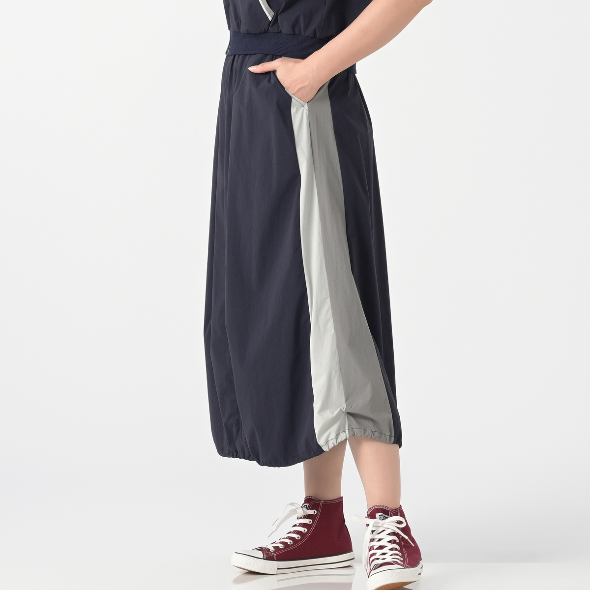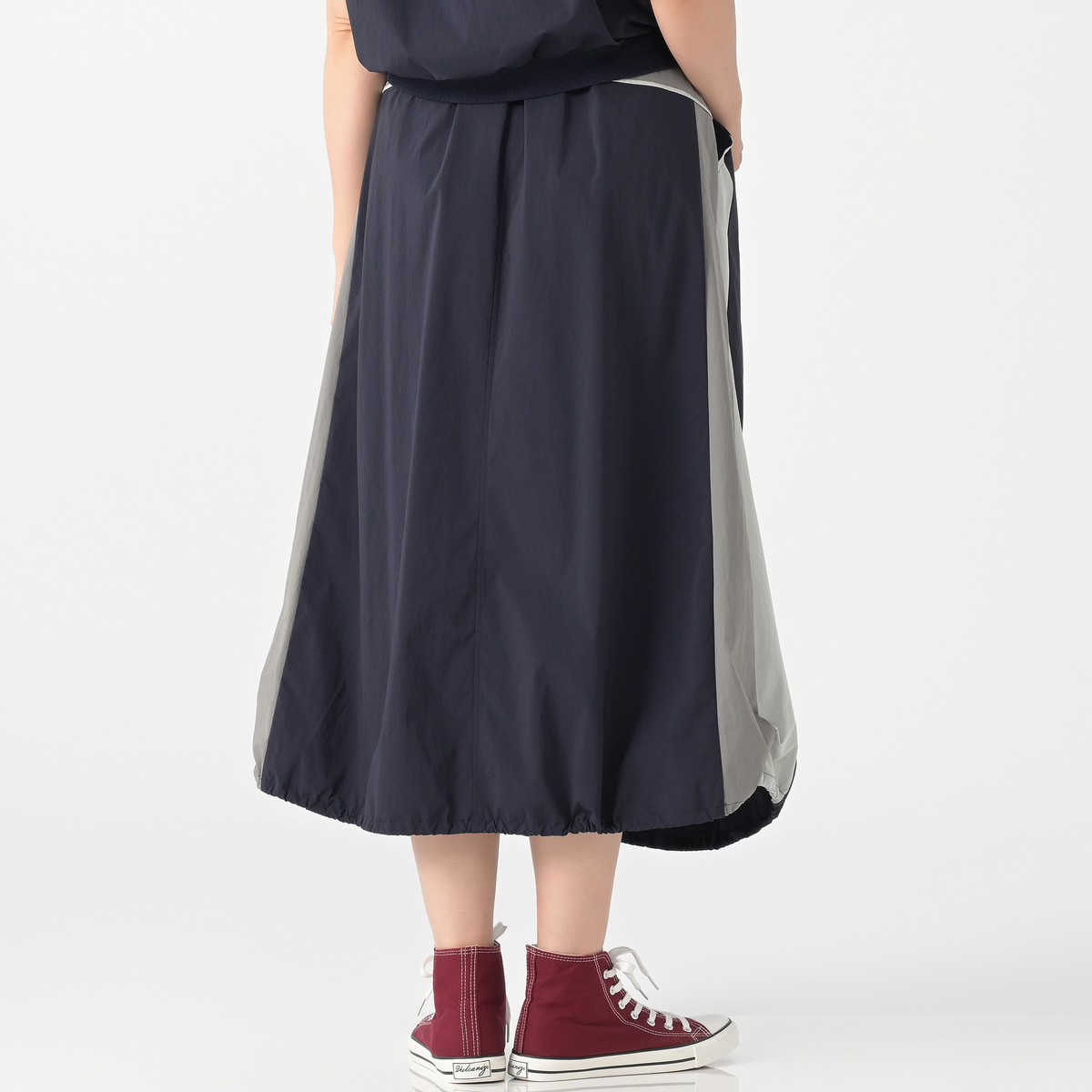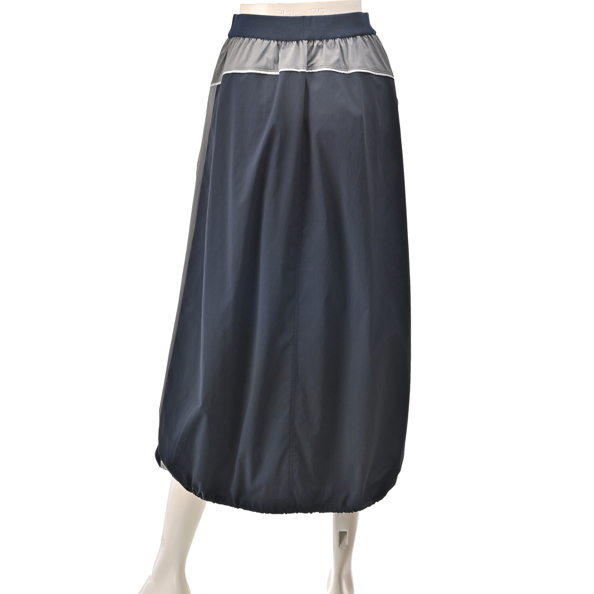 スタイリッシュな配色切り替えがポイントのスカート。裾にはゴムを通し、ストッパーでバルーン調のシルエットになるデザインに仕上げました