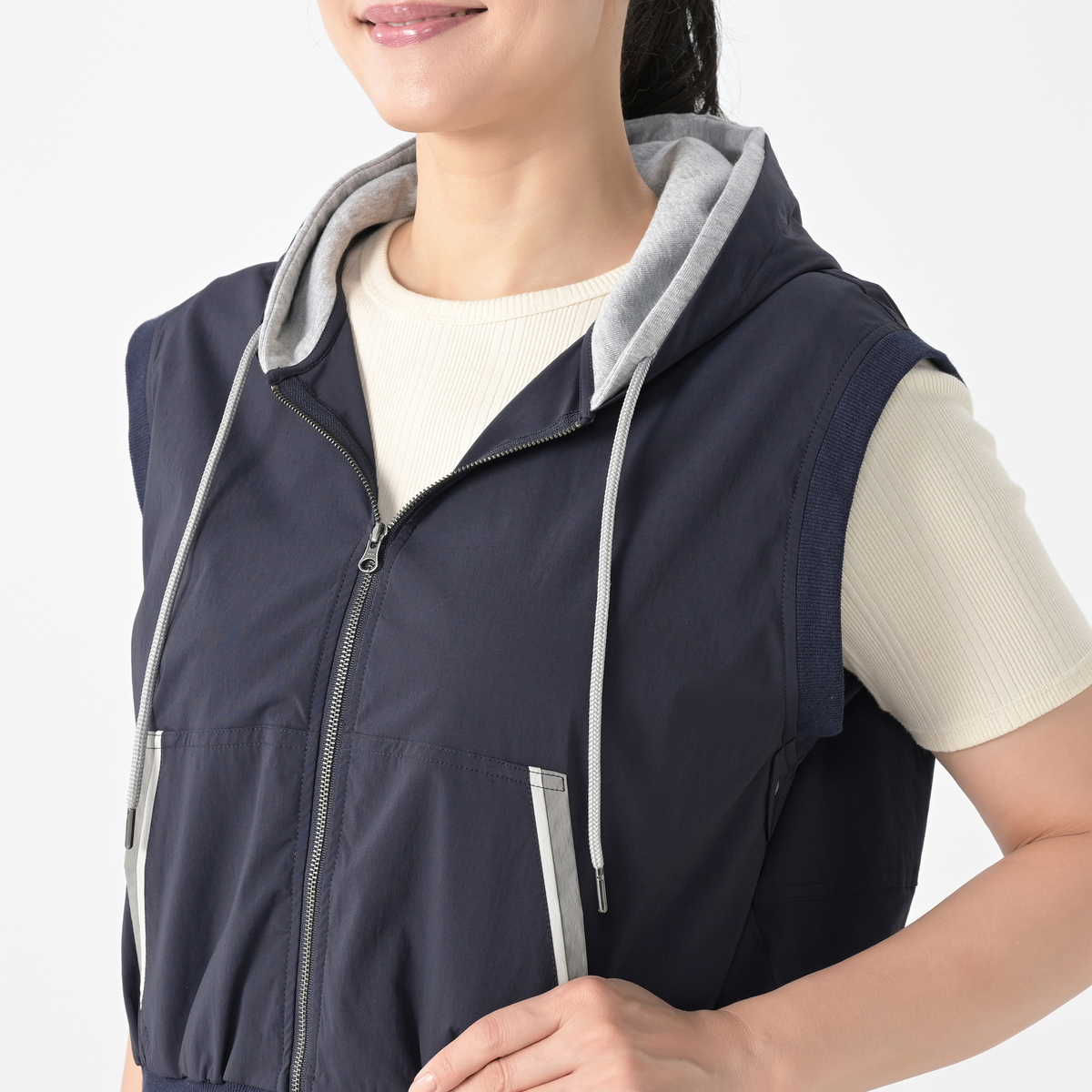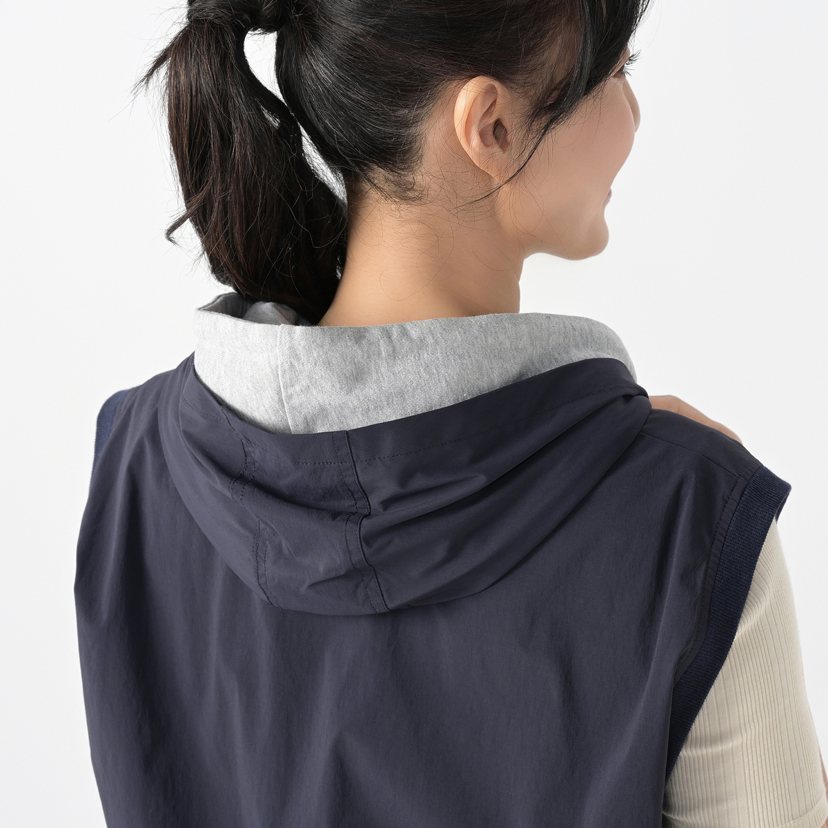 大人のカジュアルコーデに活躍してくれるフーデッドショートベスト。配色のポケット口や、内側に裏毛素材を重ねたフードがさりげないアクセントになっています