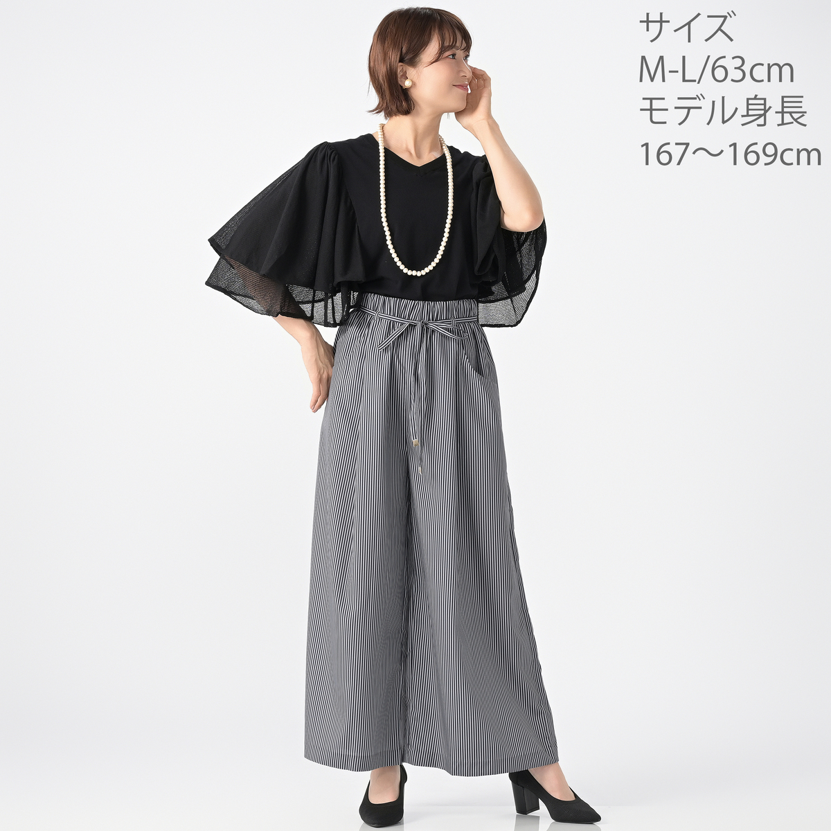 [商品寸法(ヌード)cm] サイズ ウエスト ヒップ XSーS:64(52〜64) 132(77〜90) MーL:69(64〜77) 137(87〜100) LLー3L:74(77〜93) 142(97〜110) サイズ 前股ぐり わたり幅 XSーS:36 41 MーL:36.5 42 LLー3L:37 43 股下:63/69 [ウエストゴム] 全体に有 [素材] ポリエステル 100% [お手入れ] 洗濯機洗い可 [付属品] 共布リボン [注意事項] ※商品寸法の誤差は多少発生します。ご了承下さい ※淡色製品には蛍光増白剤入り洗剤を使用しないで下さい ※洗濯の際には必ずネットを使用して下さい ※洗濯・クリーニングの際、色落ちすることがありますので他の物と分けて洗って下さい ※洗濯後はすぐに脱水し、形を整えて干して下さい。長時間水につけたままにしないで下さい ※濃色製品は着用中の摩擦により色移りすることがあります。また、雨や汗等で濡れた状態で着用すると色移りすることがあります。その際はお早めに洗濯をして下さい ※素材の特性上、着用や洗濯・クリーニング時の摩擦により毛羽立ち、毛玉が発生します。その際はお早めに毛玉取り器等で手入れをして下さい ※デリケートな素材を使用していますので、爪やアクセサリーなどの引っ掛かりによりキズがつきやすくなっております。縫目や生地を強く引っ張らないよう注意して下さい ※アイロンは当て布を使用して掛けて下さい 【中国製】