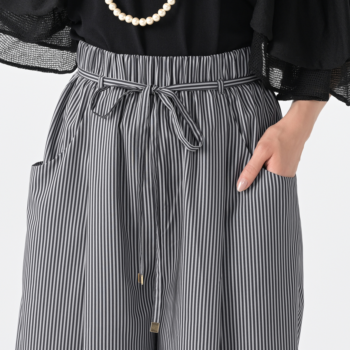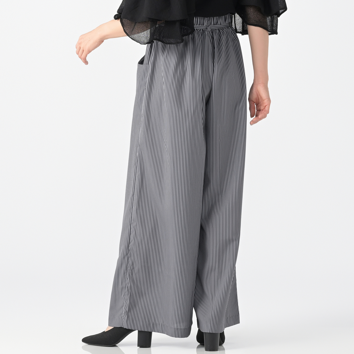 軽量で爽やかな素材を使ったワイドパンツです。フロントのタックが立体感を演出し、マニッシュな雰囲気をプラス。ウエストには平ゴムを入れて穿きやすさを高め、共布リボンがさりげないアクセントになります