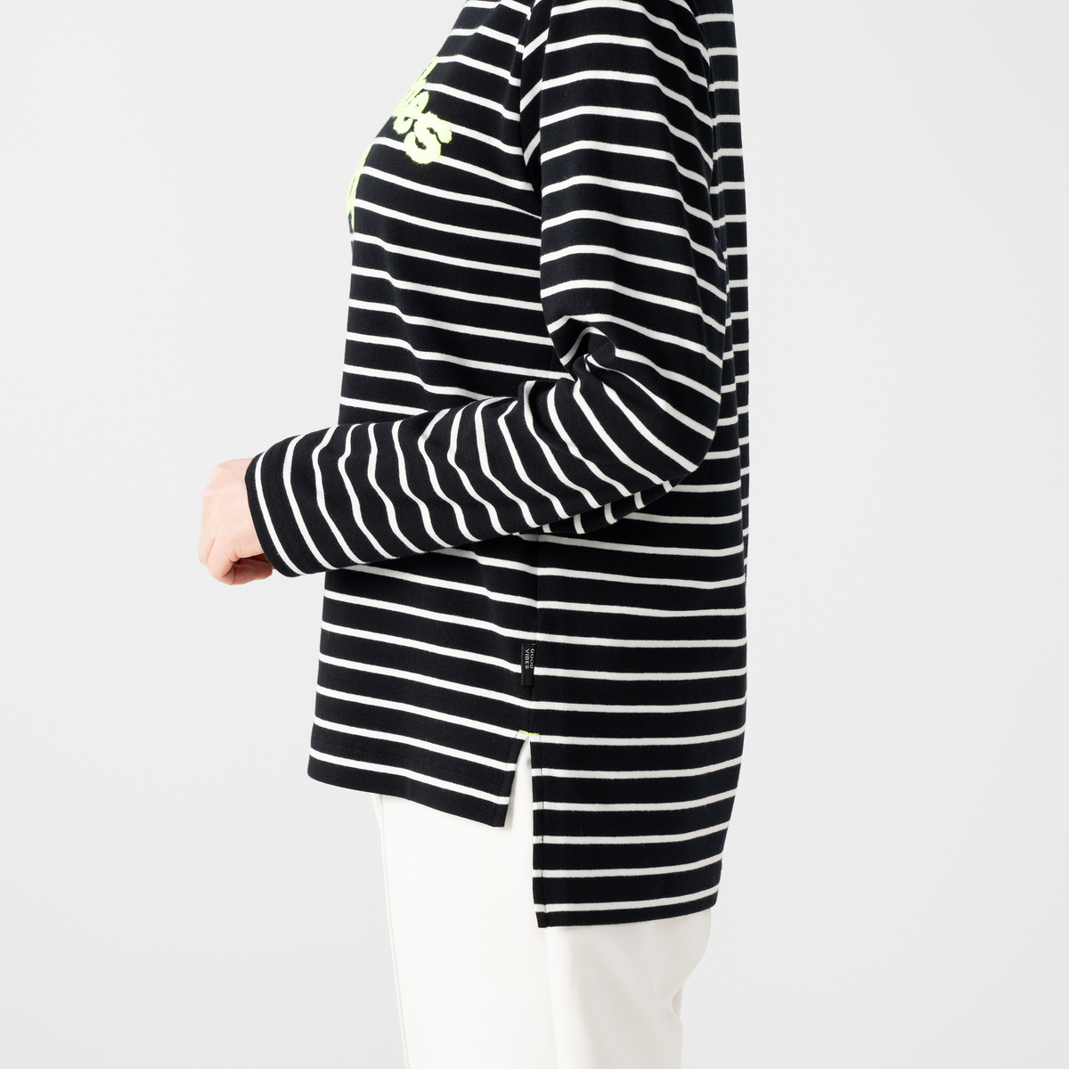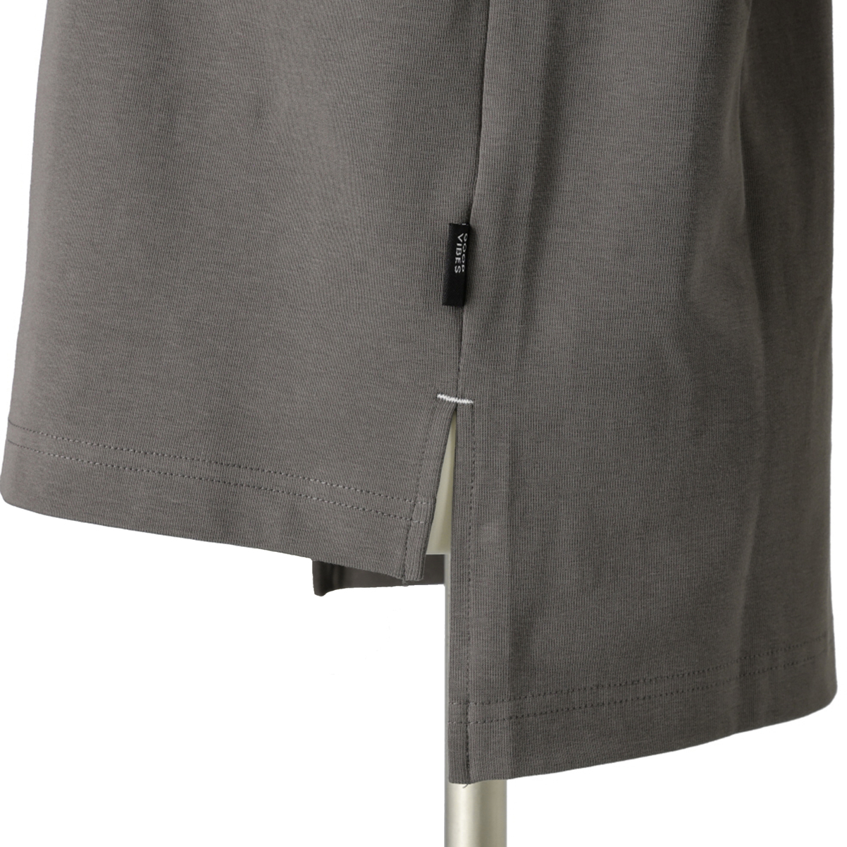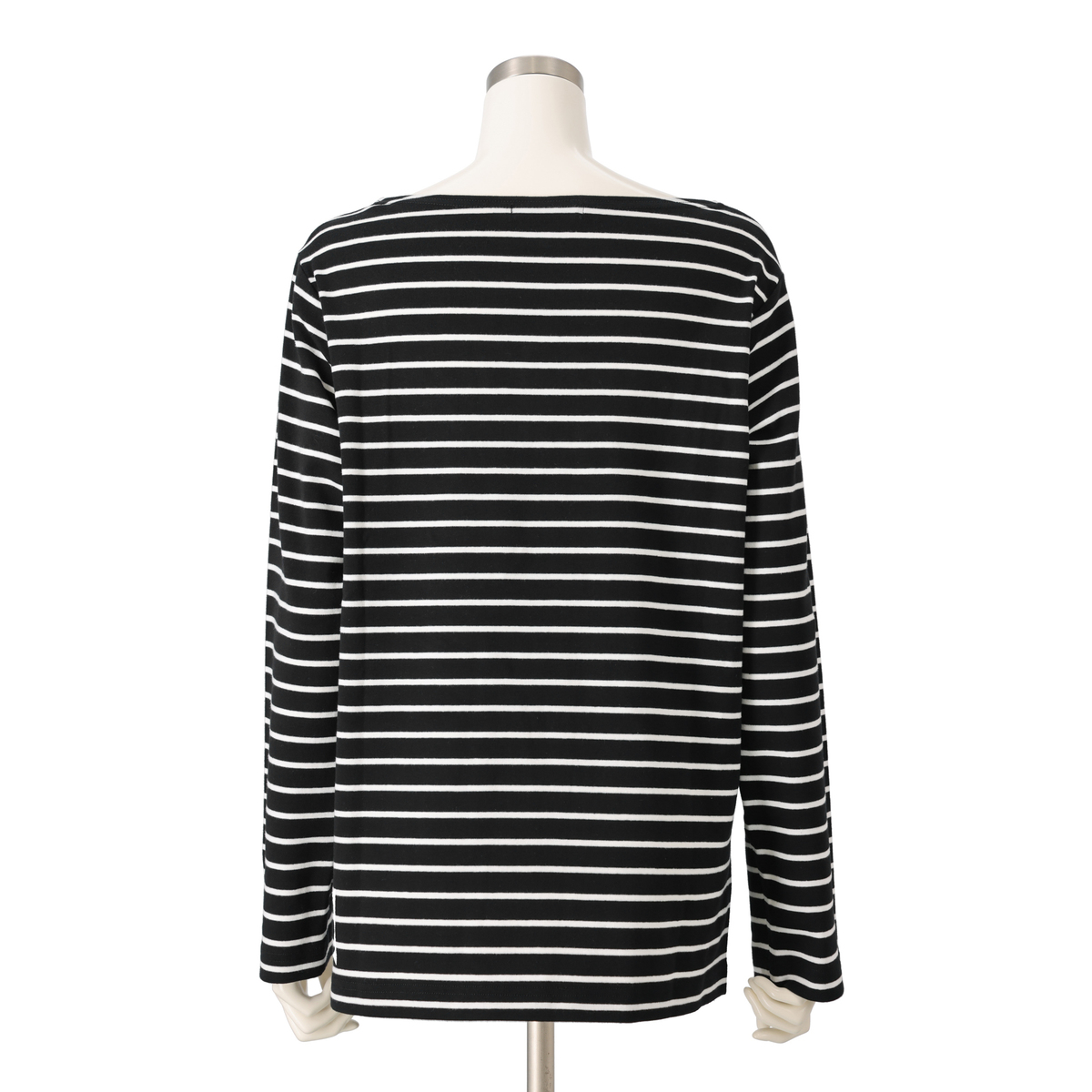 フライスカットソー素材で仕立てた、ボートネックラインのベーシックな長袖Tシャツ。サガラ刺繍が目を引き、配色ミシンカンヌキや両脇のスリットが洗練された雰囲気を演出します