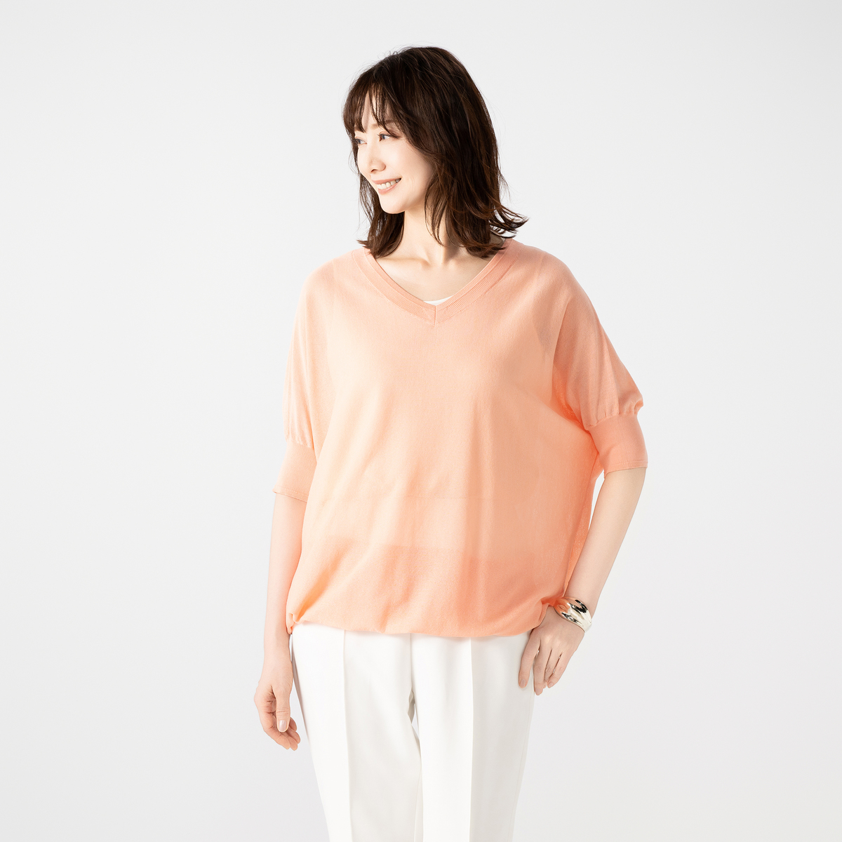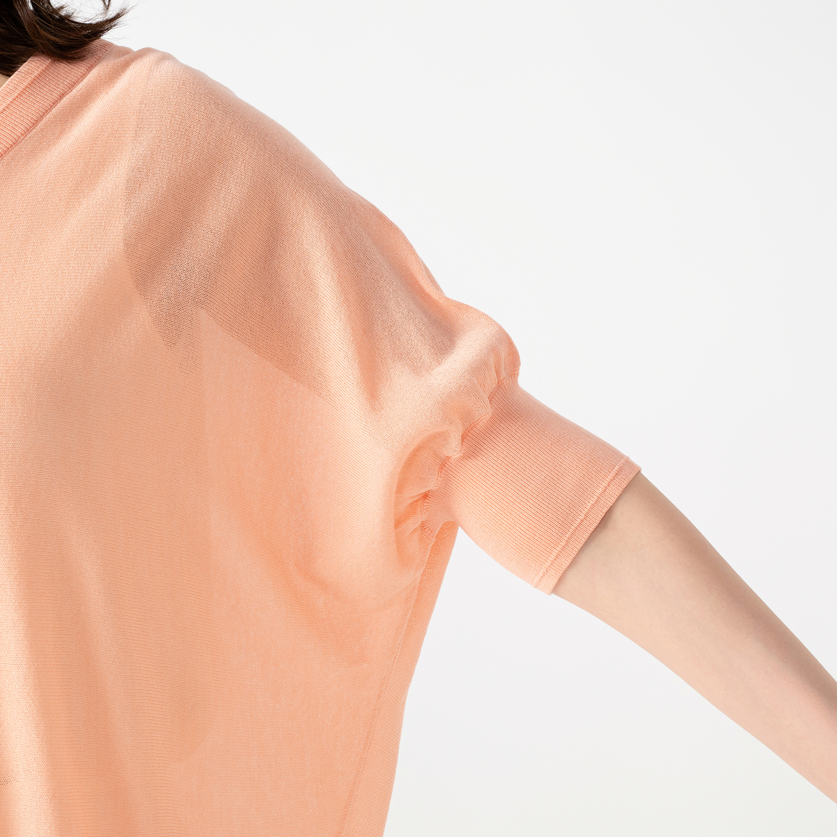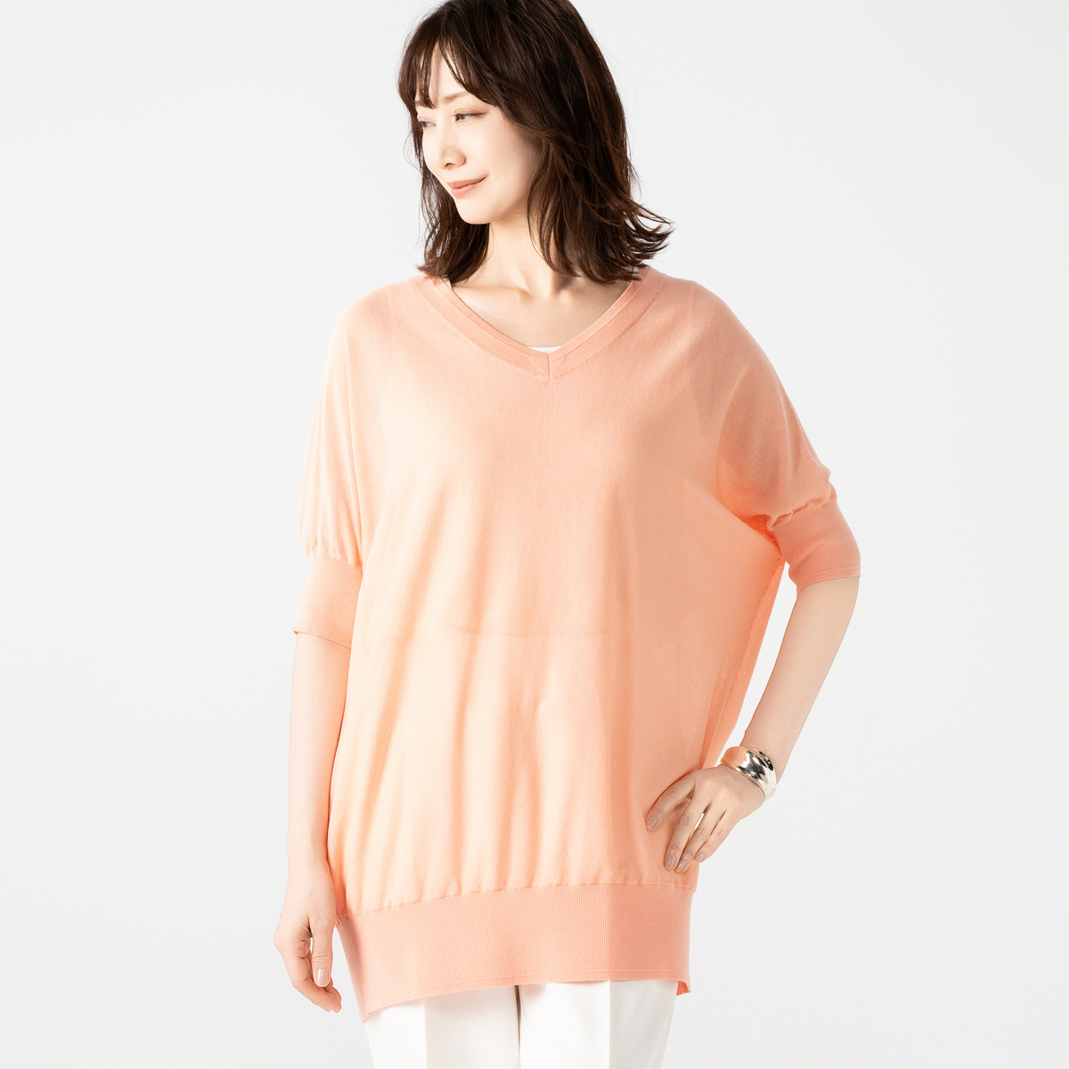 細番手の糸を使った、ほどよい透け感のあるセミシアープルオーバー。アンコキーヌらしいVネックラインに。五分袖のボディラインを拾いにくいシルエットです