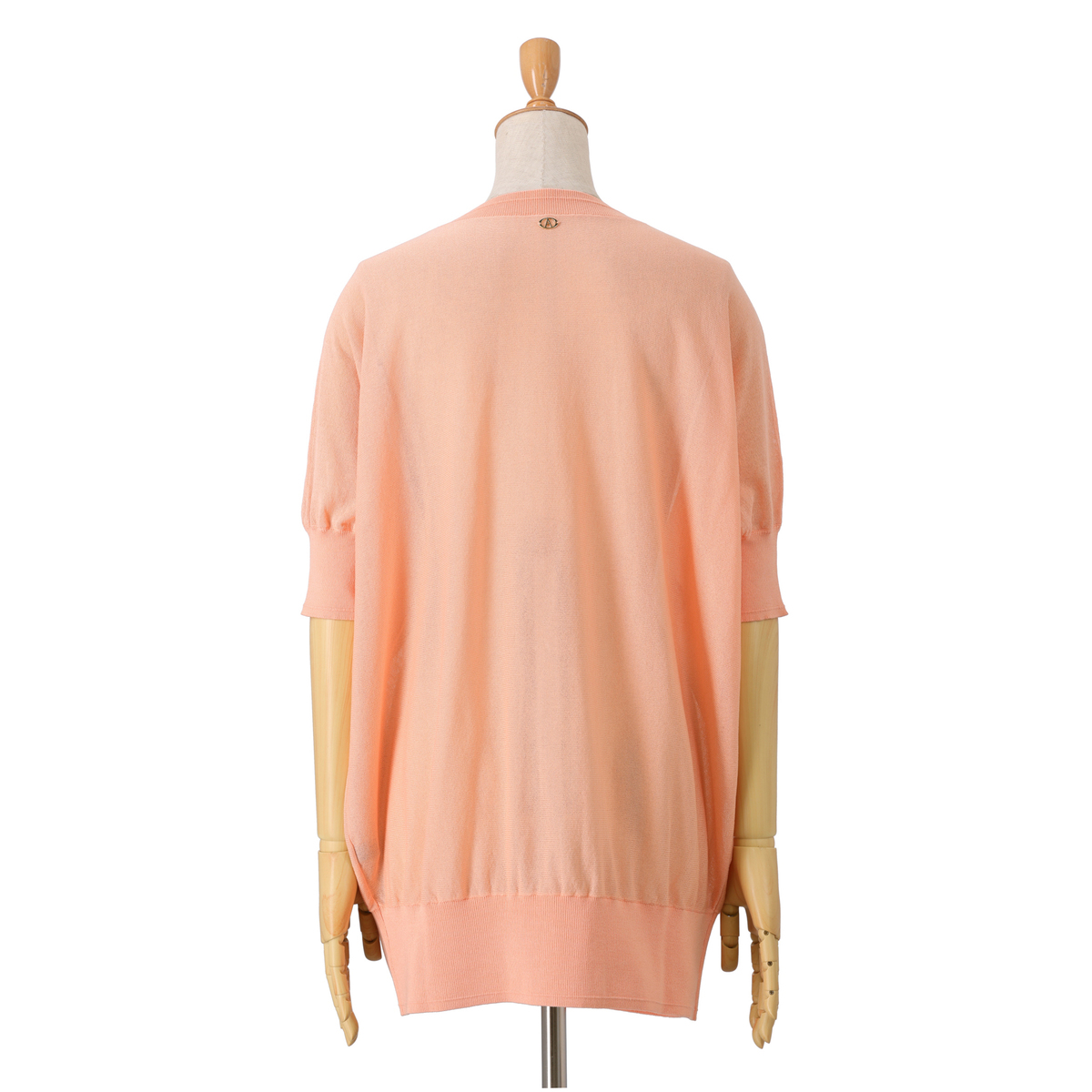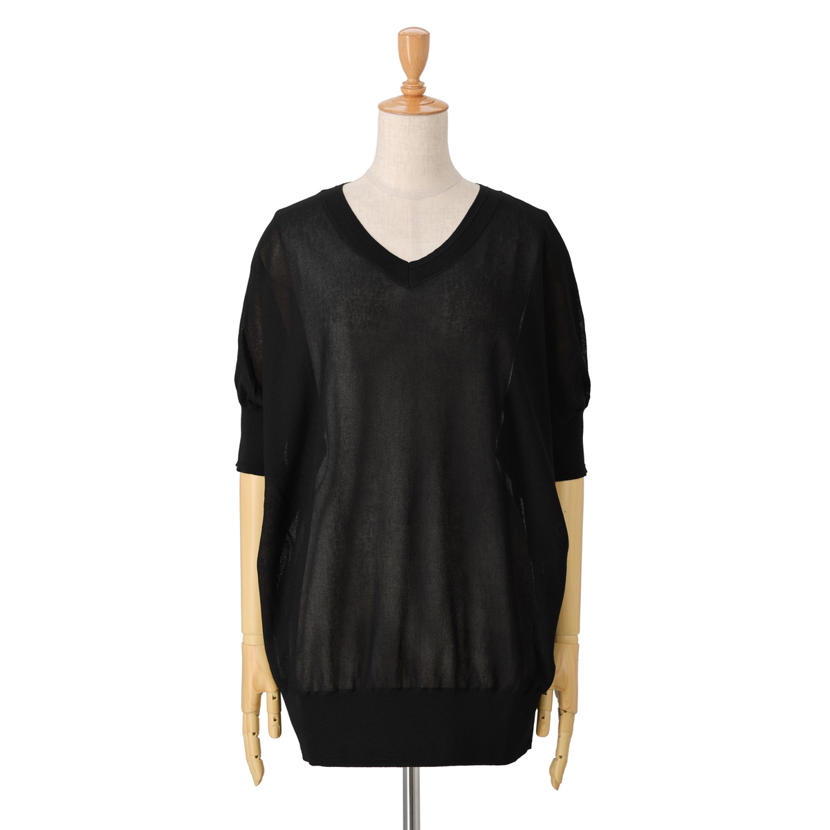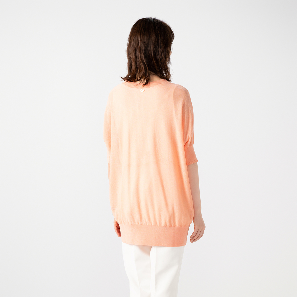細番手の糸を使った、ほどよい透け感のあるセミシアープルオーバー。アンコキーヌらしいVネックラインに。五分袖のボディラインを拾いにくいシルエットです