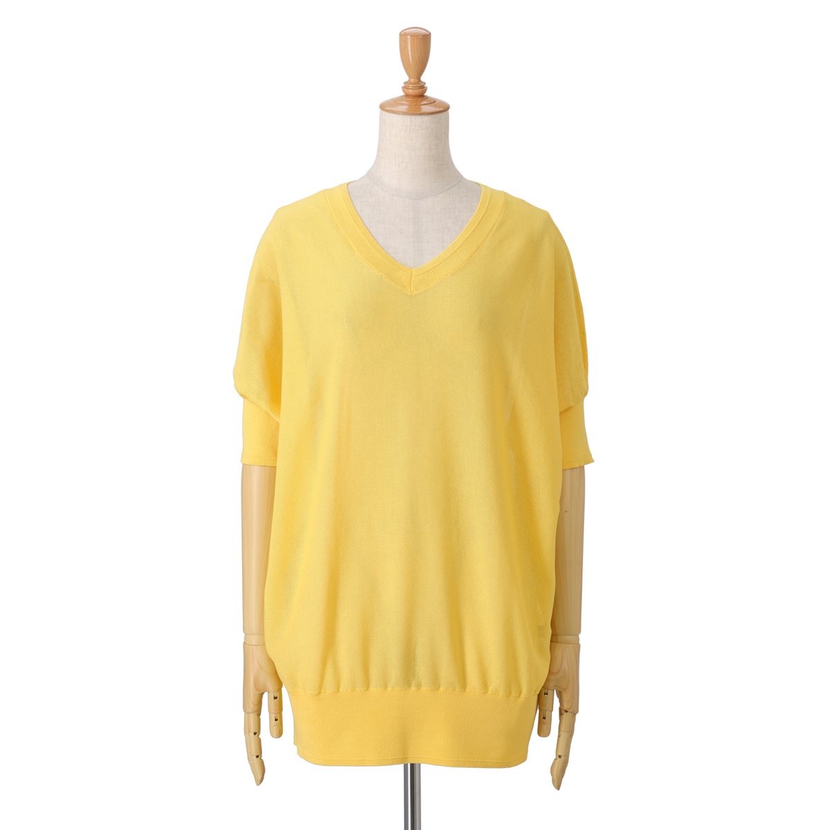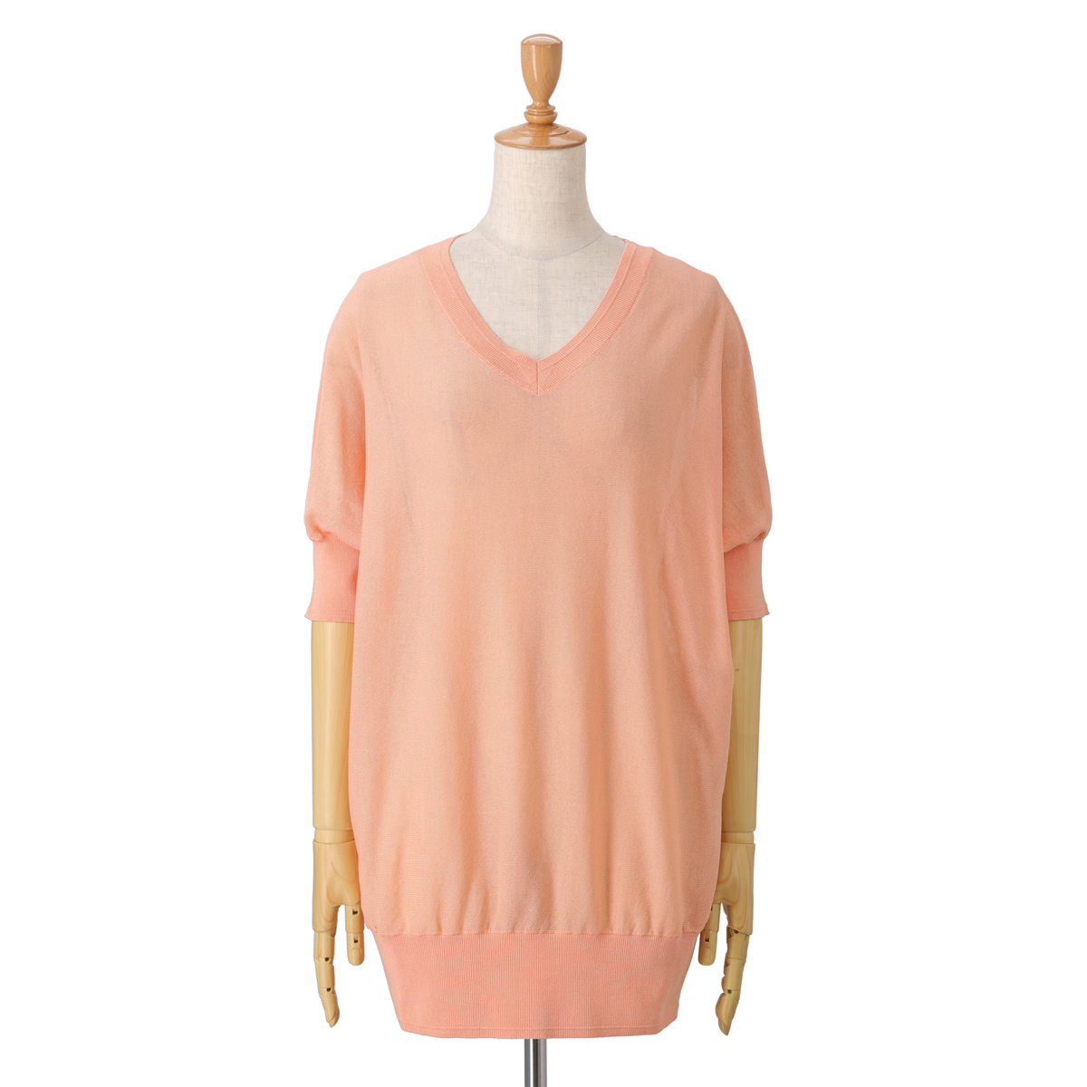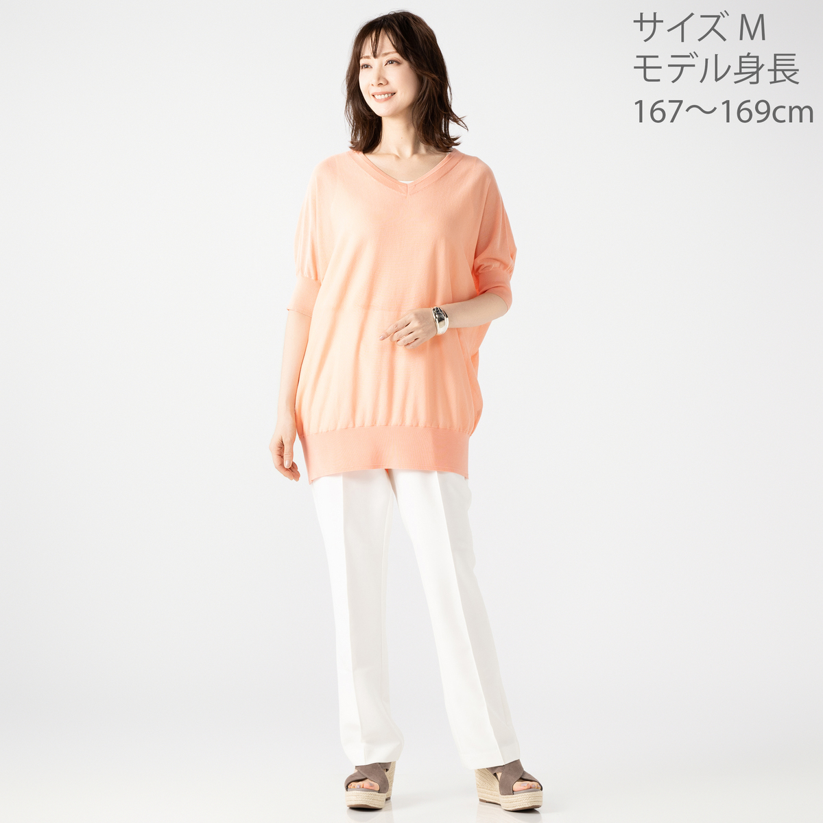 白のSを買いました。普段上着はMですが、アンコキーヌのトップスはいつも1サイズ下でSです。このニットはゆったりしてるので、即決でSで正解でした。薄いVネックニットで、五分袖で、袖口もウエストもリブがしっかりしてて、写真の藤島さんのように腰元でもちゃんととまってくれるし、そのままお尻付近までさげて、スキニージーンズとかと合わせても、いかようにもかわいいです。透け感あるので、中に着たキャミがほんのり見える程度が控えめセクシーって感じ。首元、肩のラインがきれいでフェミニンさが出ます。色違い検討中です。