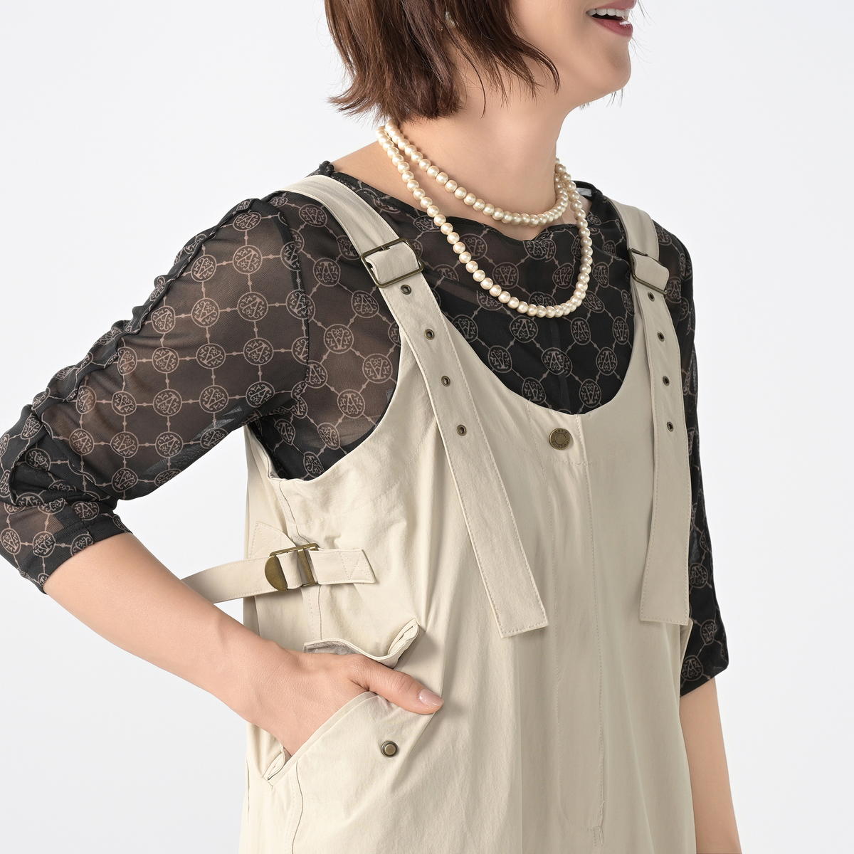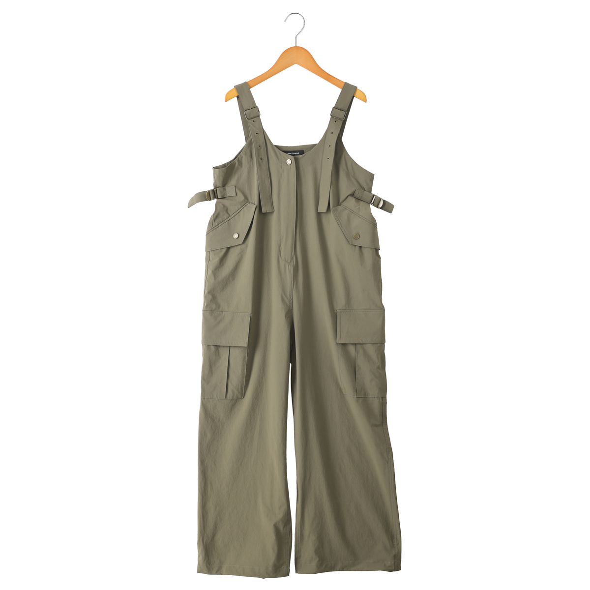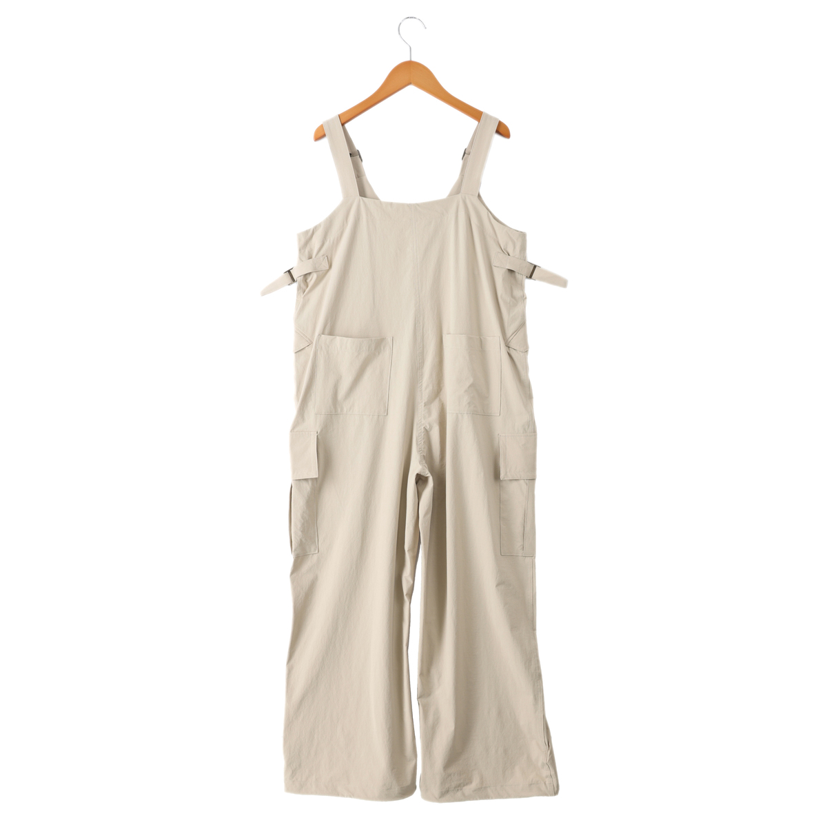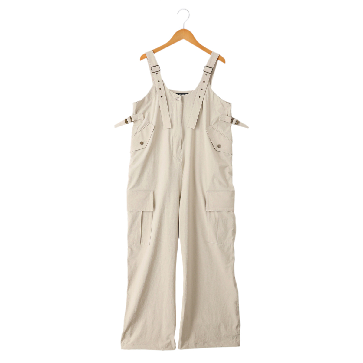 伸びの良いナイロン混ストレッチ生地のオールインワン。肩ヒモの長さを調整できるデザインで、裾にはスピンドルを施し、シルエットの変化も楽しめます。ブランドロゴ入りのドットボタンがアクセントです