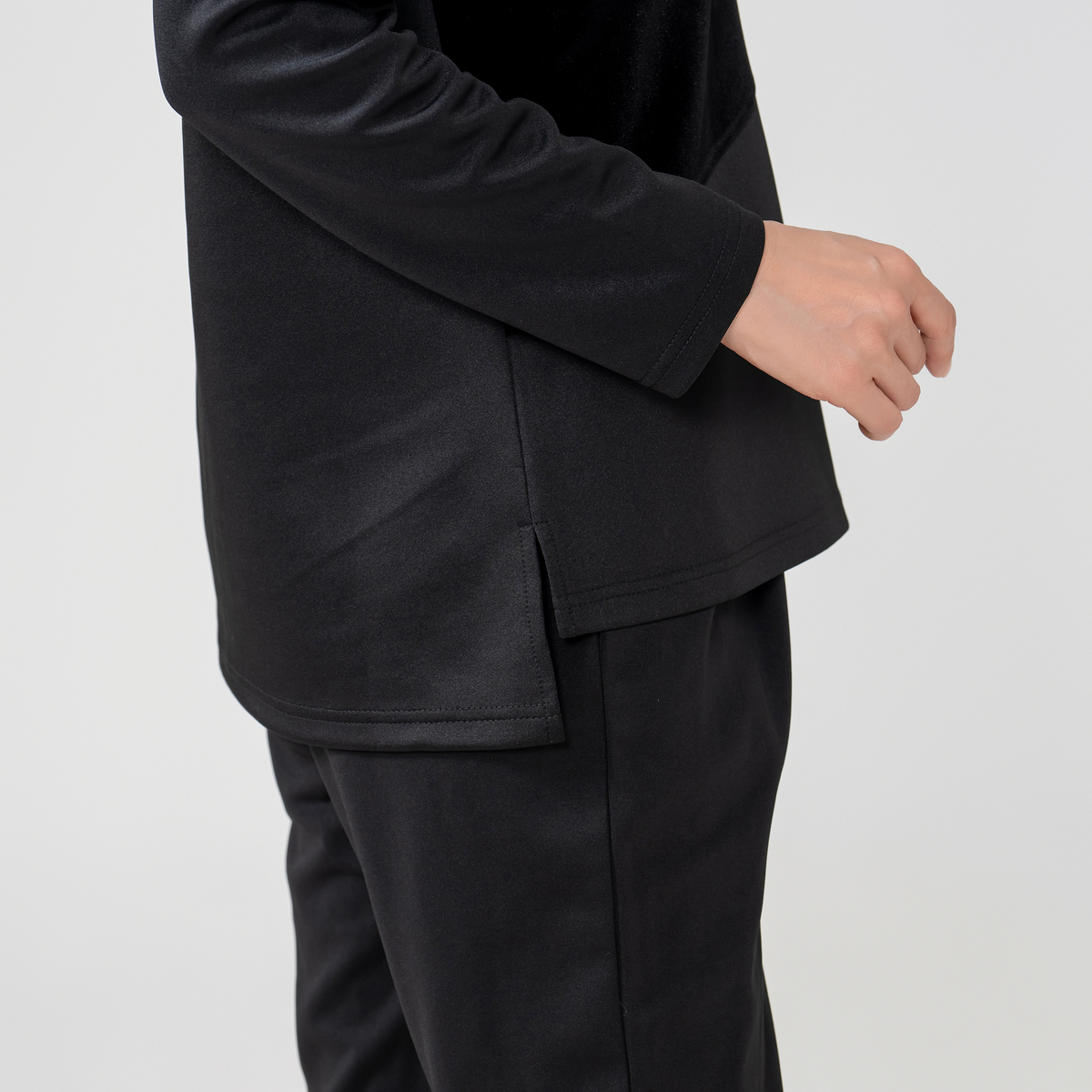 ベロアの衿にはシャーリングを施し、重ね着したときのアクセントになってくれます