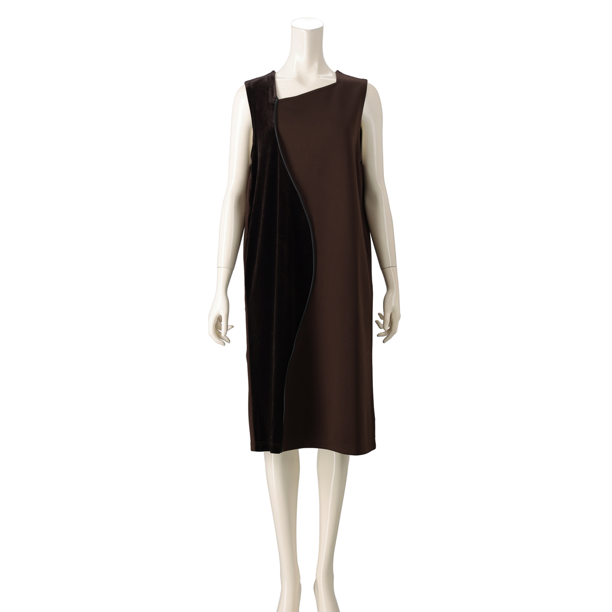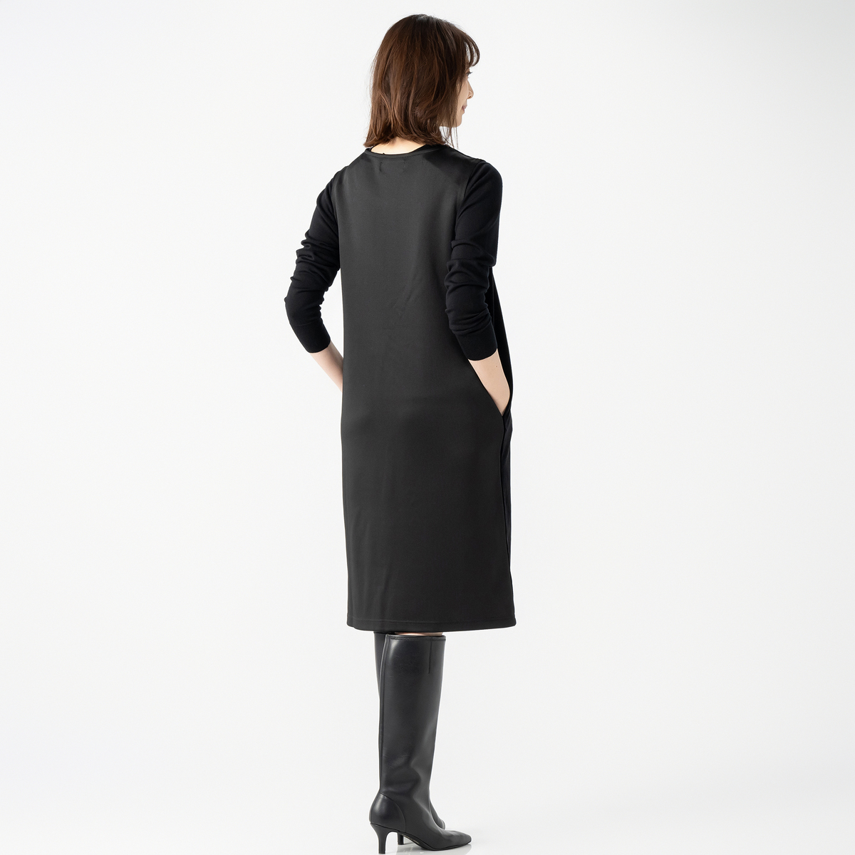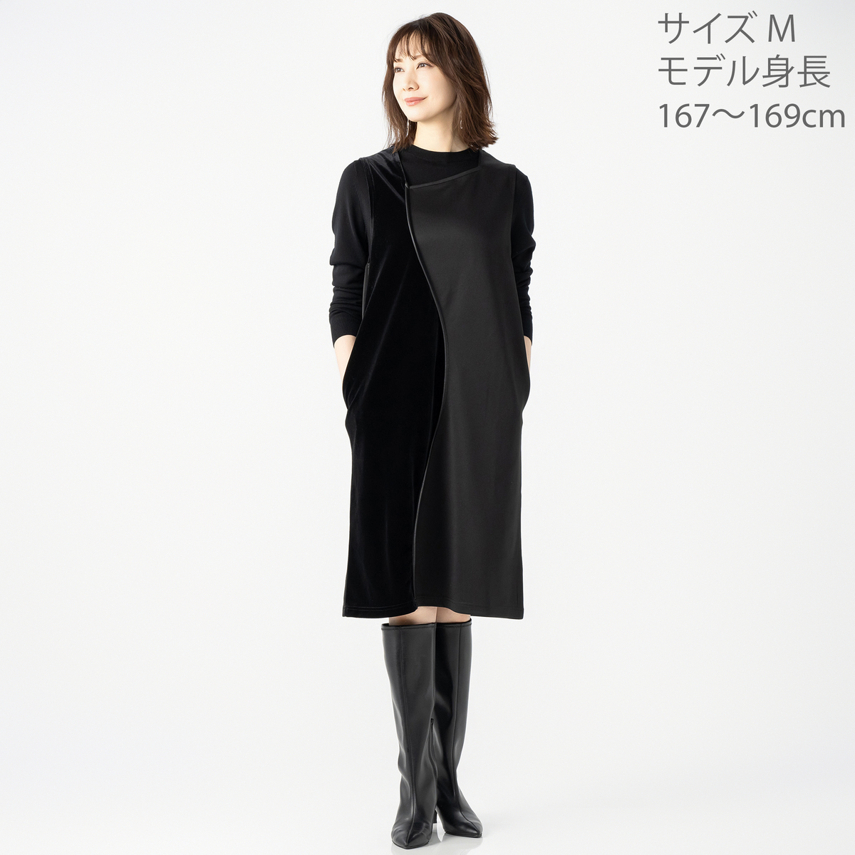 カーブで切替えたデザインのワンピース。同色の異素材使いで大胆ながらエレガントな印象です。こだわりの切り替え部分の合皮使いもデザインポイントになっています