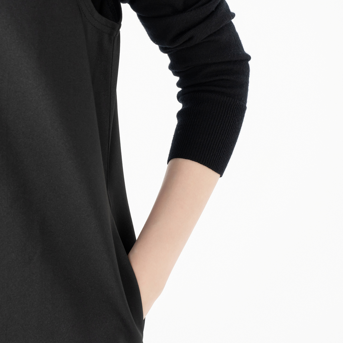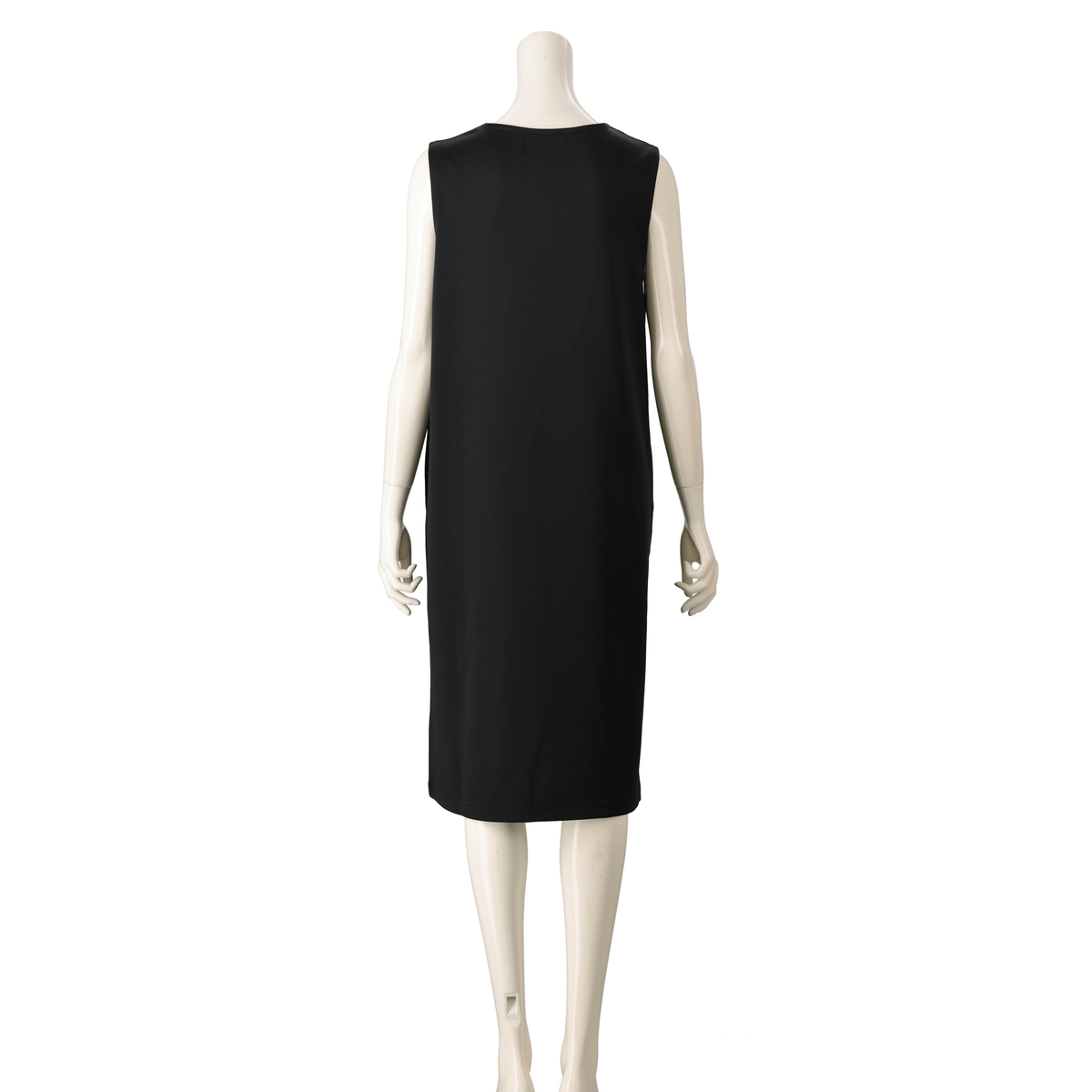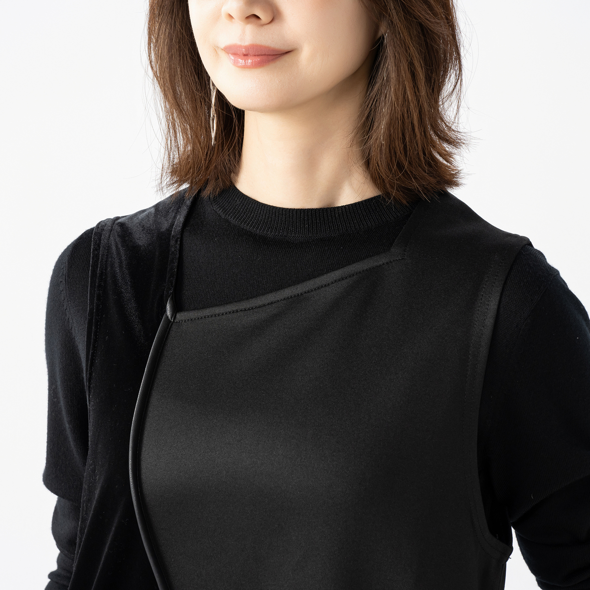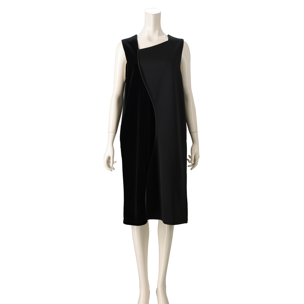 カーブで切替えたデザインのワンピース。同色の異素材使いで大胆ながらエレガントな印象です。こだわりの切り替え部分の合皮使いもデザインポイントになっています
