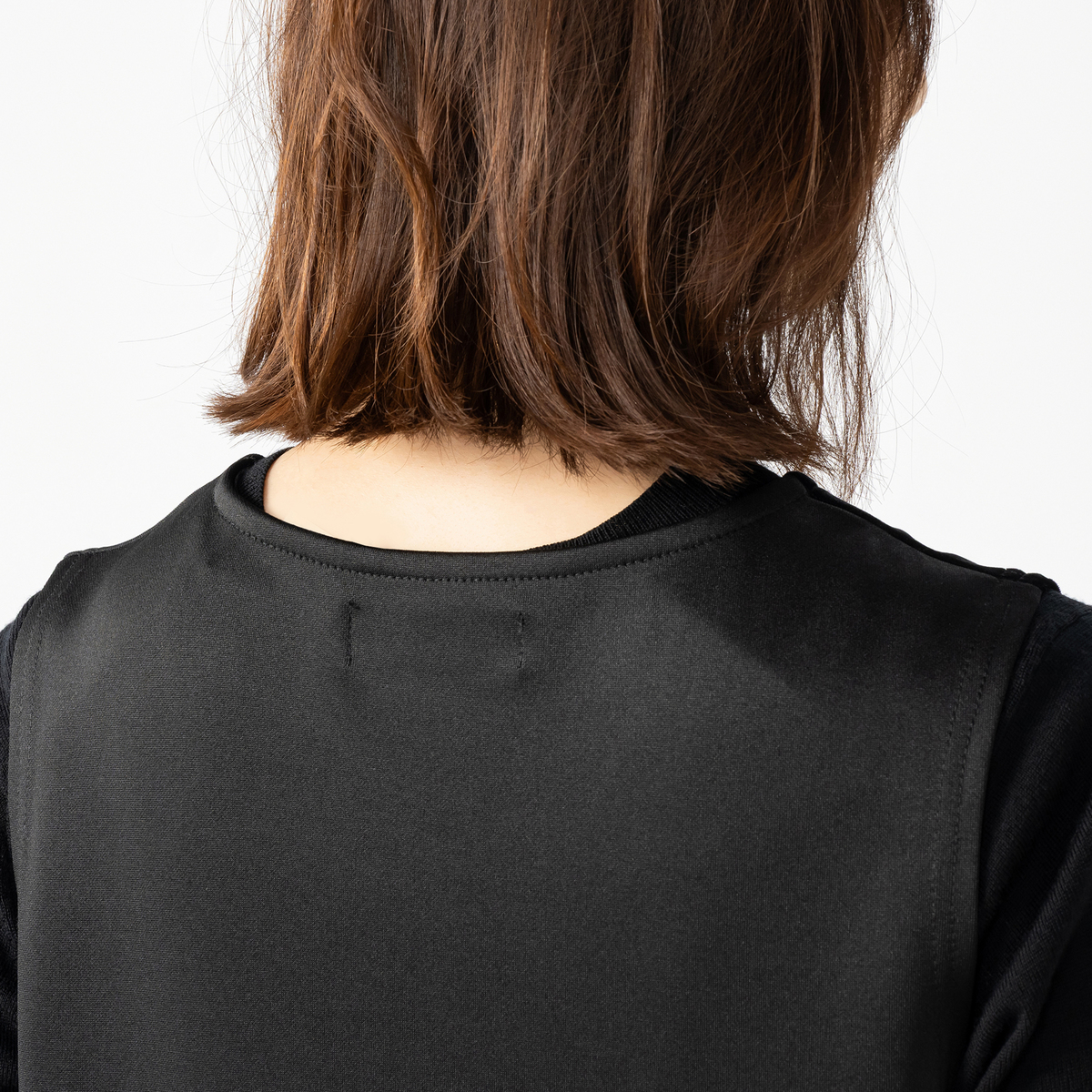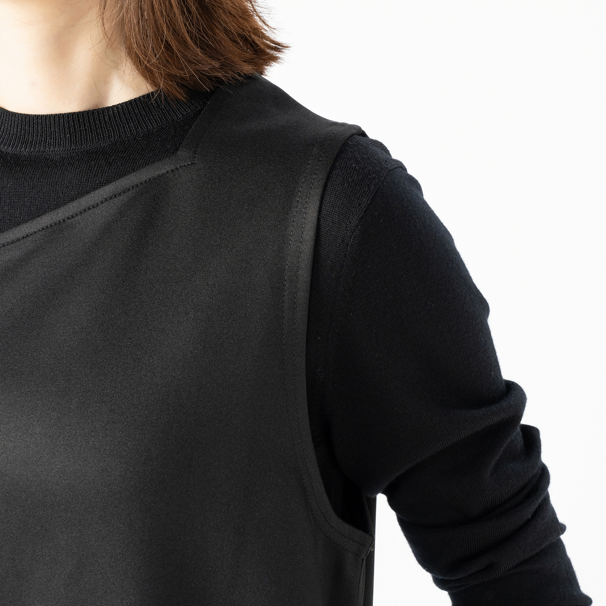 [商品寸法(ヌード)cm] サイズ バスト 着丈 S : 93(73〜81) 97 M : 98(79〜87) 98 L : 104(85〜93) 99 LL : 110(91〜99) 100 3L : 116(97〜105) 101 サイズ 肩幅 S : 35 M : 36 L : 37 LL : 38 3L : 39 [素材] 本体:ポリエステル95% ポリウレタン5% 別布:ポリエステル90% ポリウレタン10% 合皮部分:合成皮革 [お手入れ] 手洗い可 [注意事項] ※商品寸法の誤差は多少発生します。ご了承下さい ※洗濯後は重ね置きしないで下さい ※洗濯後はすぐに脱水し、形を整えて干して下さい。長時間、水につけたままにしないで下さい ※素材の特性上、着用や洗濯・クリーニング時の摩擦により毛羽立ち、毛玉が発生します。その際はお早めに毛玉取り器等で手入れをして下さい ※直射日光や蛍光灯の影響で変色することがありますのでご了承下さい ※濃色製品は着用中の摩擦により色移りすることがあります。また、雨や汗等で濡れた状態で着用すると色移りすることがあります。その際はお早めに洗濯をして下さい ※洗濯やクリーニングにより徐々に色あせします。また、色落ちすることがありますので、他の物と分けて洗って下さい ※雨や水に濡れた時は、ただちに乾いたタオル等で押さえ取り、こすらずふき取るようにして下さい ※合成皮革は時間の経過と共に劣化が起こる可能性があります ※高温高湿を避け、直射日光の当たらない風通しのよい場所で保管して下さい ※着用中の摩擦などで他の衣類に毛羽が付着することがあります ※濃色商品に淡色下着のご着用はご遠慮ください 【中国製】