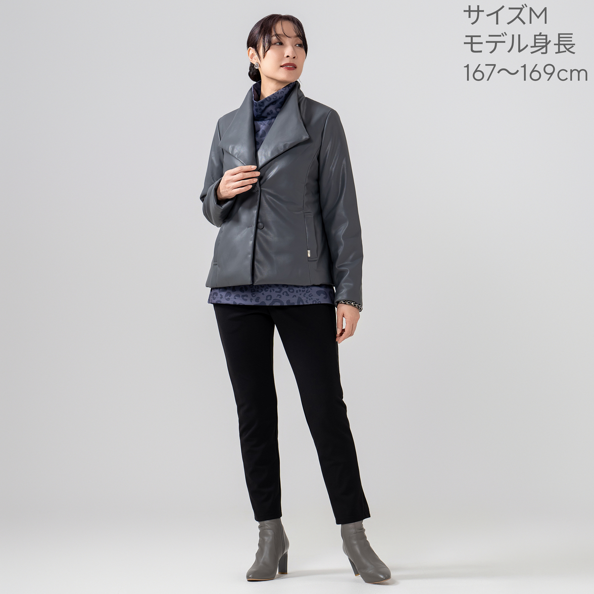 [商品寸法(ヌード)cm] サイズ バスト 着丈 肩幅 袖丈 M:106(79〜87) 61.5 38 61 L:112(85〜93) 62.5 39 61.5 LL:118(91〜99) 63.5 40 62 3L:124(97〜105) 64.5 41 62.5 [素材] 表地:合成皮革 中綿:ポリエステル70% レーヨン30% 裏地:ポリエステル100% [お手入れ] 手洗い可 [注意事項] ※商品寸法の誤差は多少発生します。ご了承下さい ※洗濯後は重ね置きしないで下さい ※洗濯後はすぐに脱水し、形を整えて干して下さい。長時間、水につけたままにしないで下さい ※素材の特性上、着用や洗濯・クリーニング時の摩擦により毛羽立ち、毛玉が発生します。その際はお早めに毛玉取り器等で手入れをして下さい ※直射日光や蛍光灯の影響で変色することがありますのでご了承下さい ※濃色製品は着用中の摩擦により色移りすることがあります。また、雨や汗等で濡れた状態で着用すると色移りすることがあります。その際はお早めに洗濯をして下さい ※洗濯やクリーニングにより徐々に色あせします。また、色落ちすることがありますので、他の物と分けて洗って下さい ※雨や水に濡れた時は、ただちに乾いたタオル等で押さえ取り、こすらずふき取るようにして下さい ※合成皮革は時間の経過と共に劣化が起こる可能性があります ※高温高湿を避け、直射日光の当たらない風通しのよい場所で保管して下さい 【中国製】
