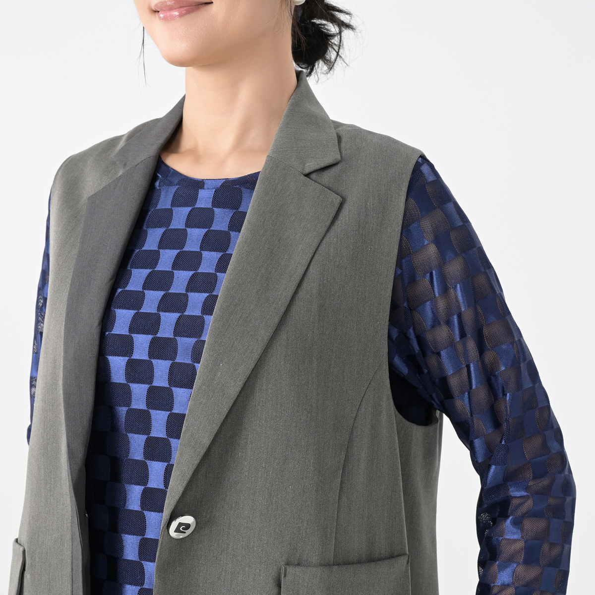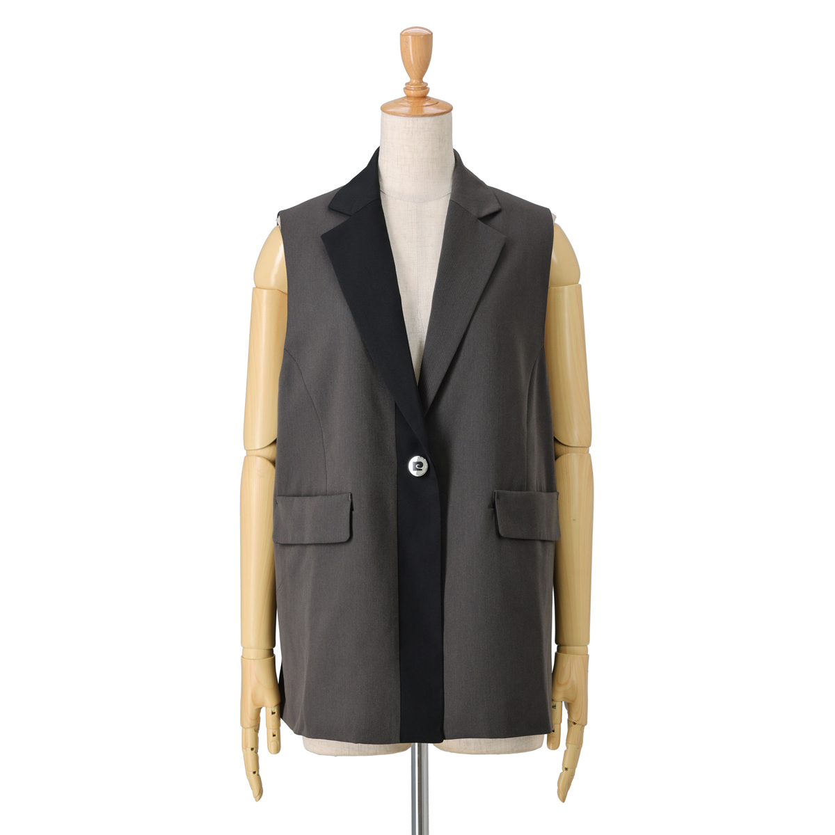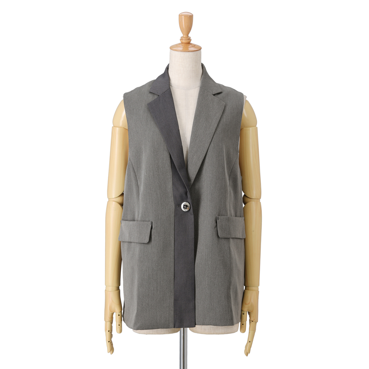ほどよい厚みとしなやかさを持つツイル素材のジレです。首元をすっきり見せるテーラーカラーと、縦ラインを強調する配色切り替えが着やせ効果を演出。ロゴ入りボタンが上品なアクセントになっています