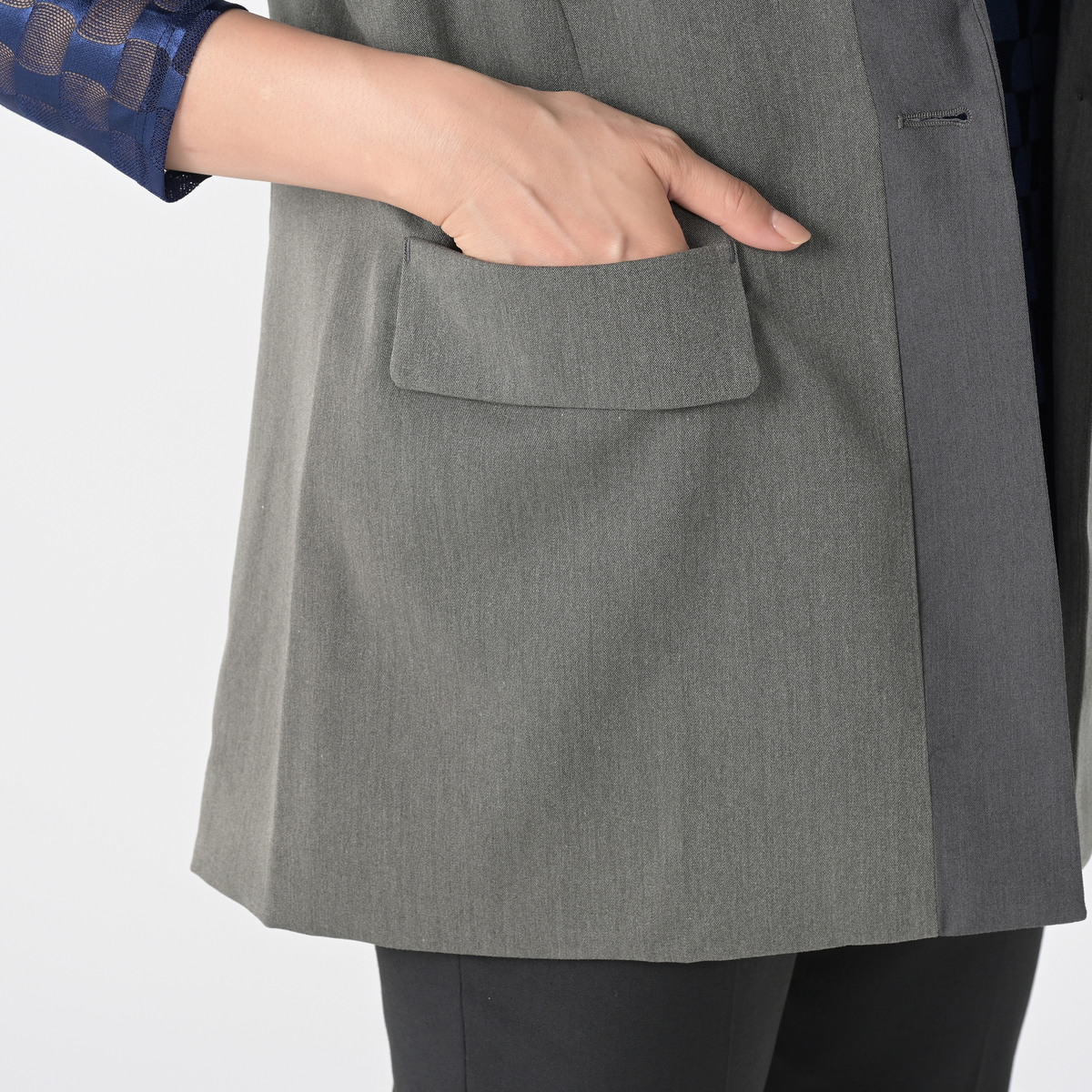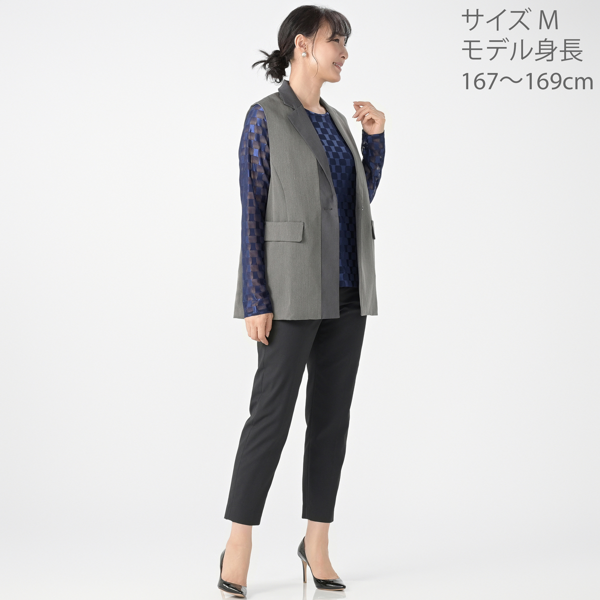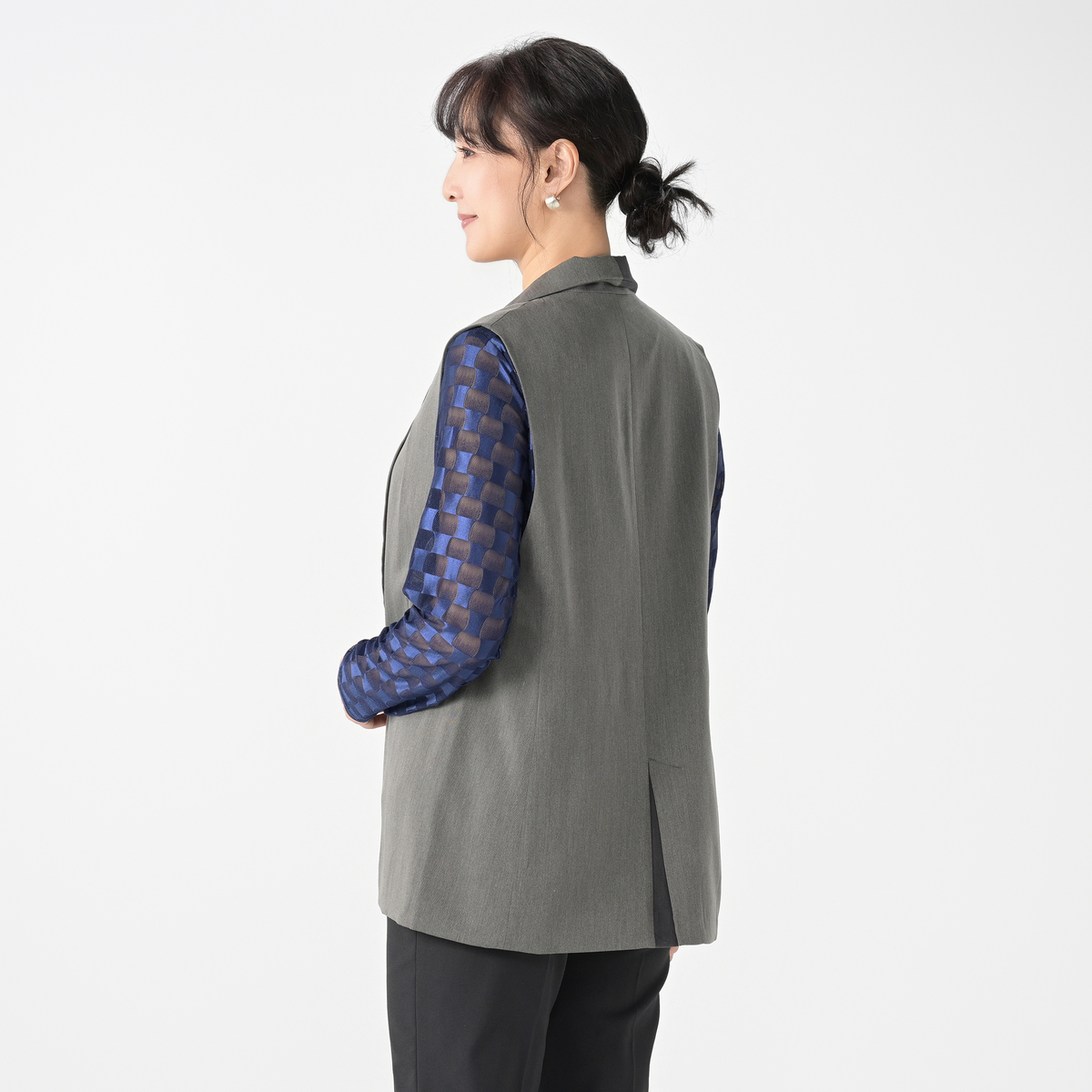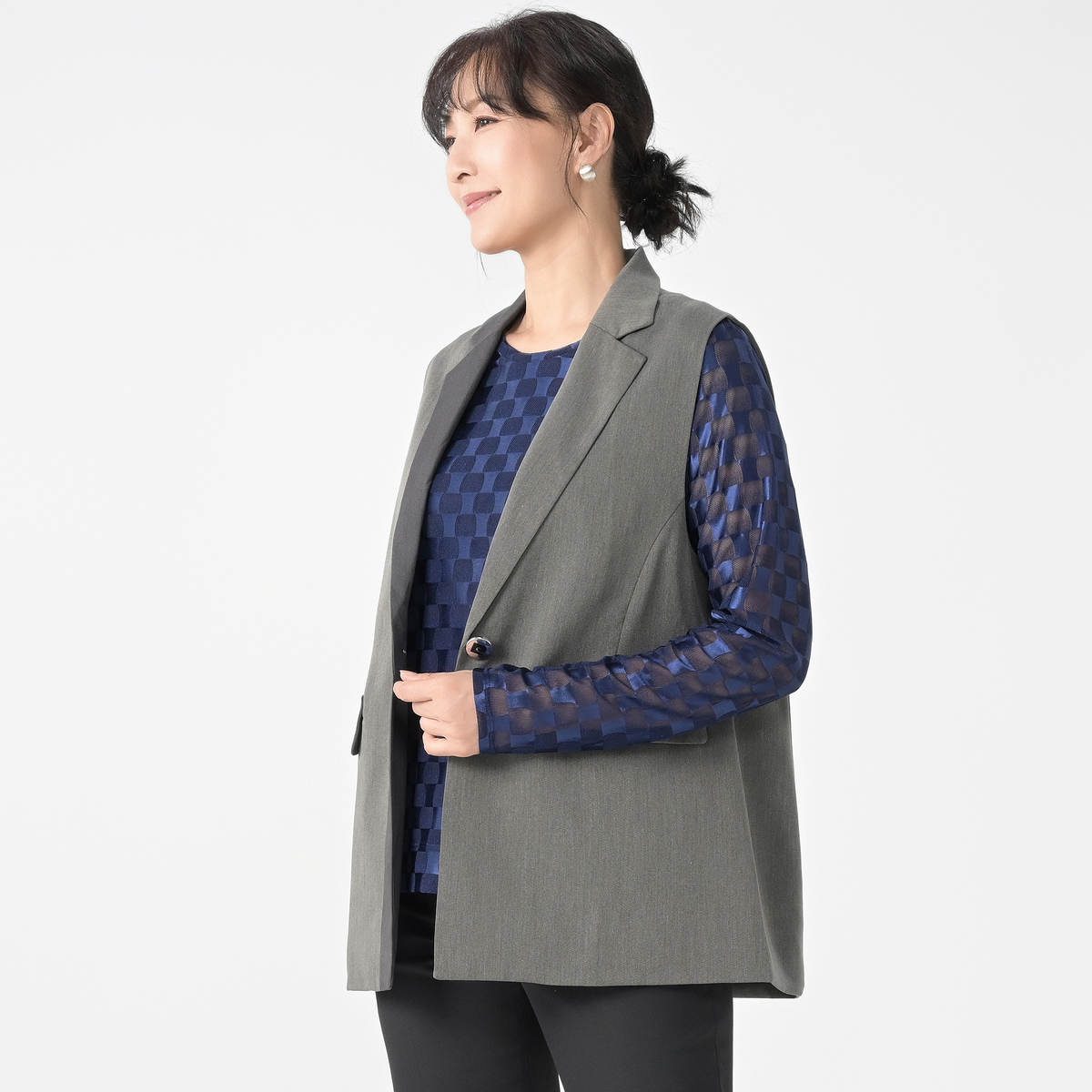 ほどよい厚みとしなやかさを持つツイル素材のジレです。首元をすっきり見せるテーラーカラーと、縦ラインを強調する配色切り替えが着やせ効果を演出。ロゴ入りボタンが上品なアクセントになっています
