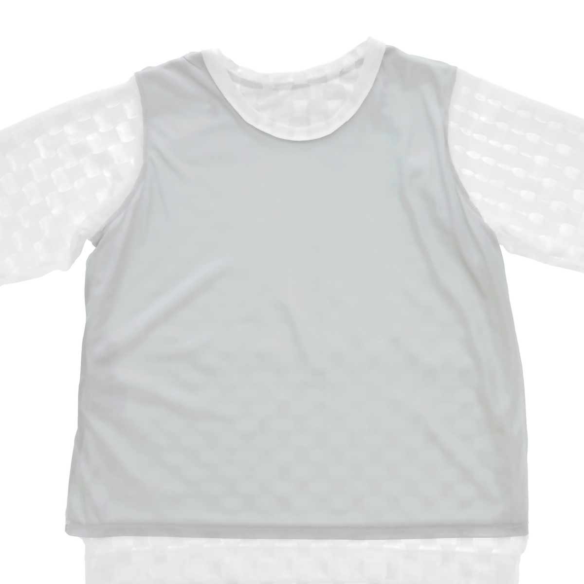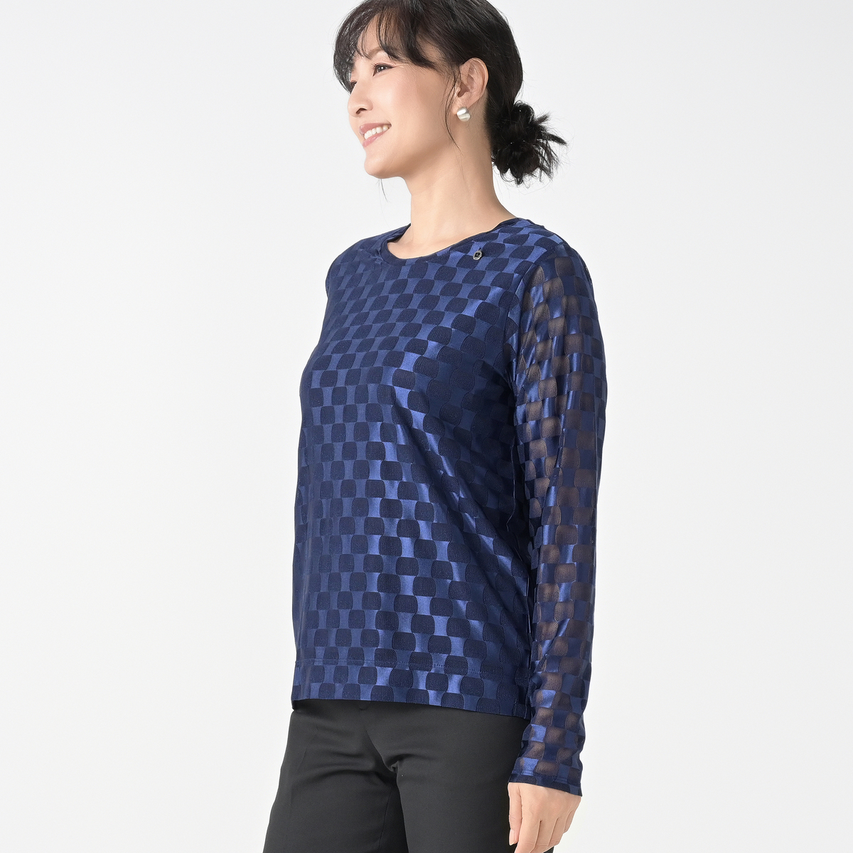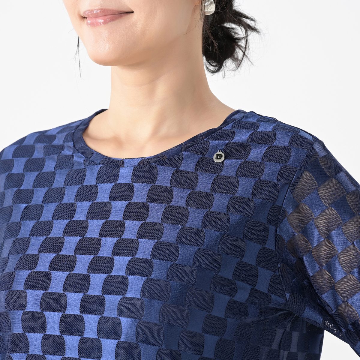 ほんのりシアーなチュール生地に、ジオメトリックなモード柄をプラスしました。滑らかなカットソー素材でストレッチ性もあり、ストレスフリーな着心地です
