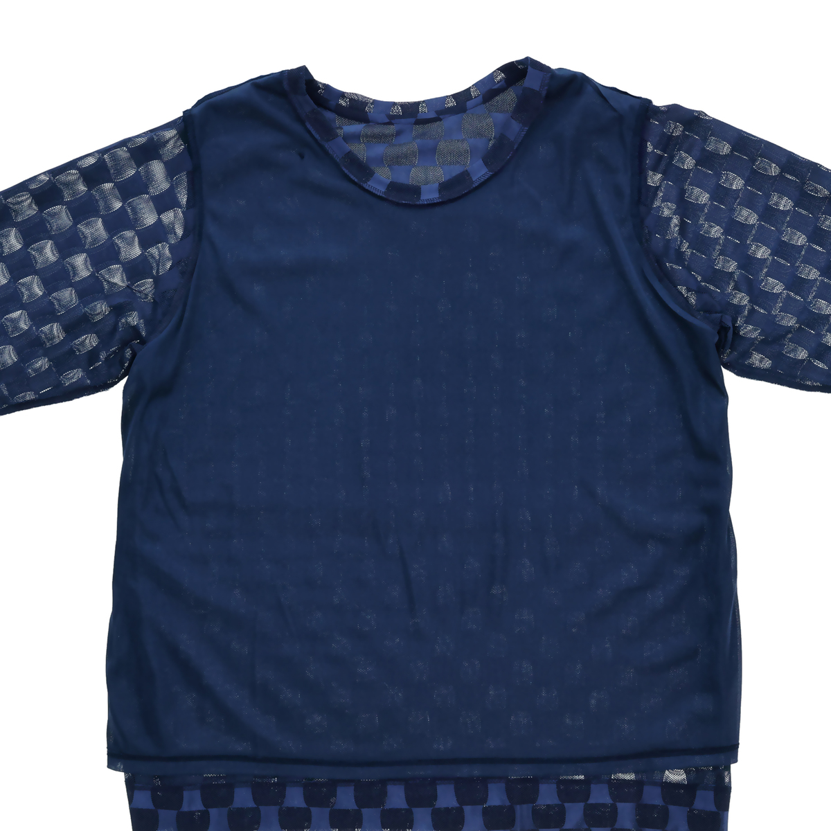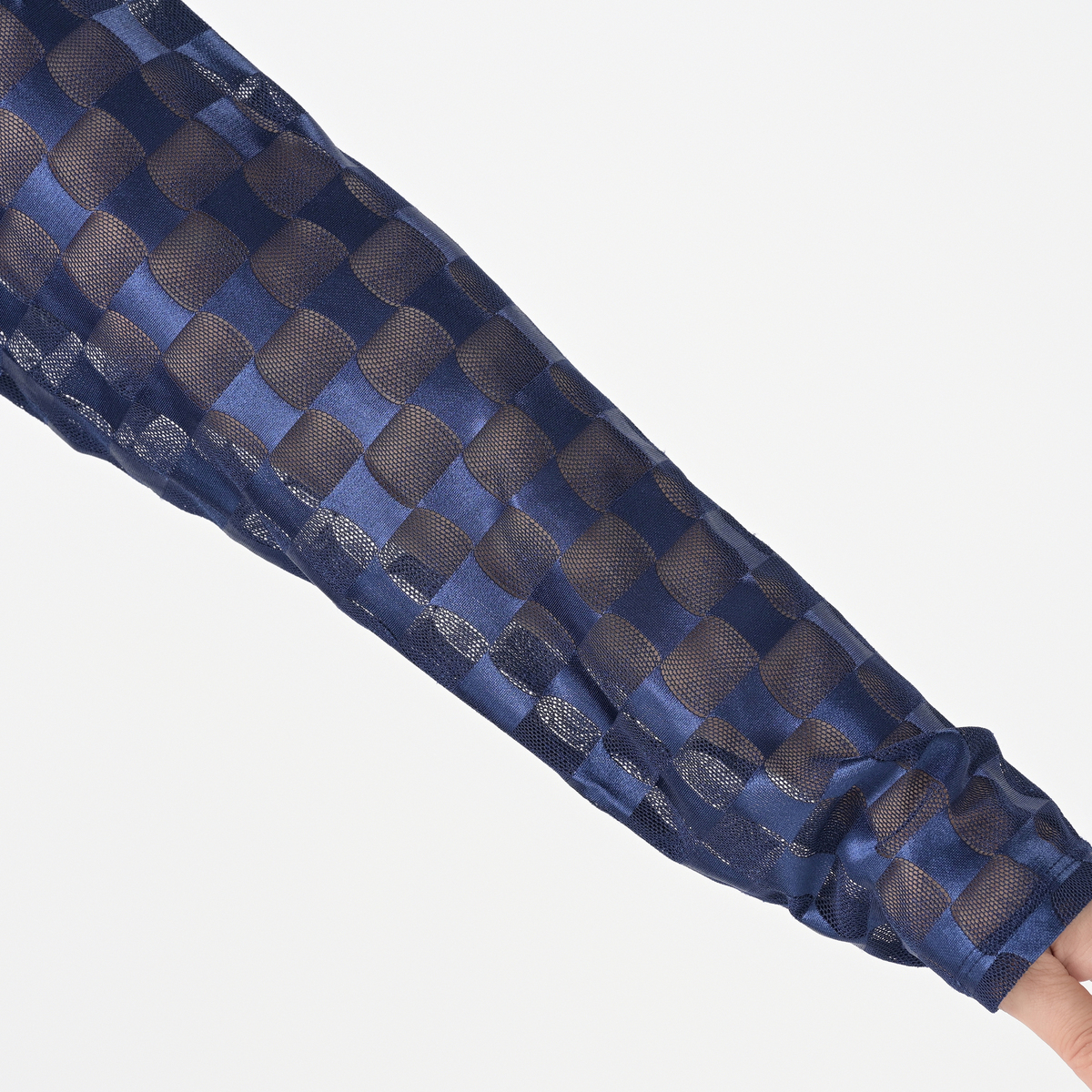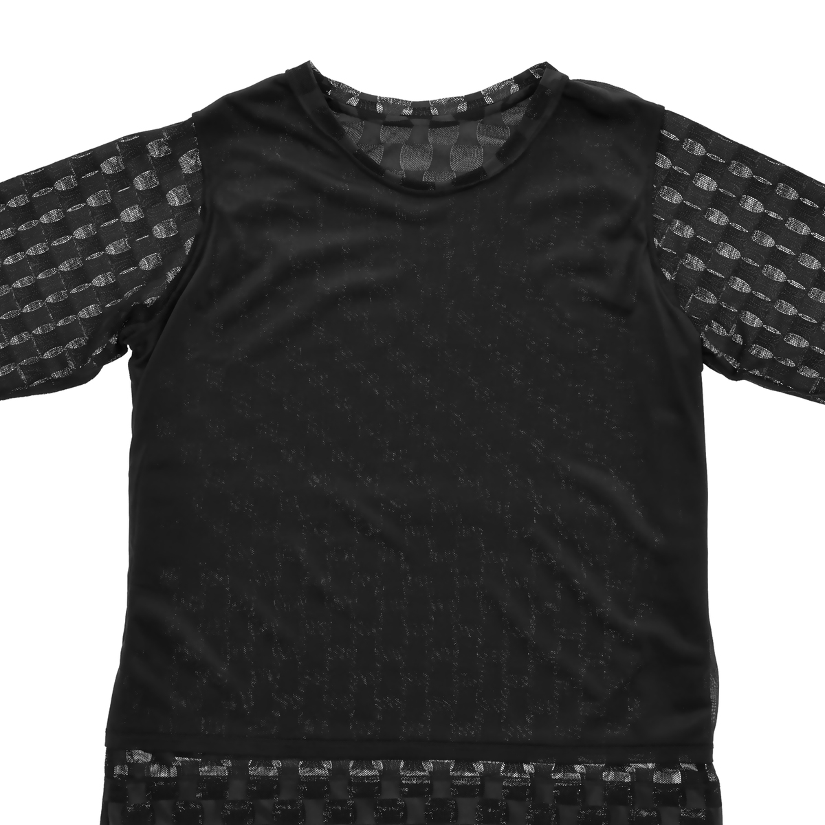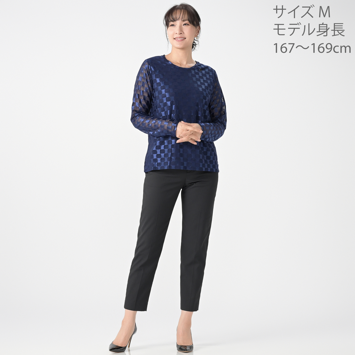 ほんのりシアーなチュール生地に、ジオメトリックなモード柄をプラスしました。滑らかなカットソー素材でストレッチ性もあり、ストレスフリーな着心地です