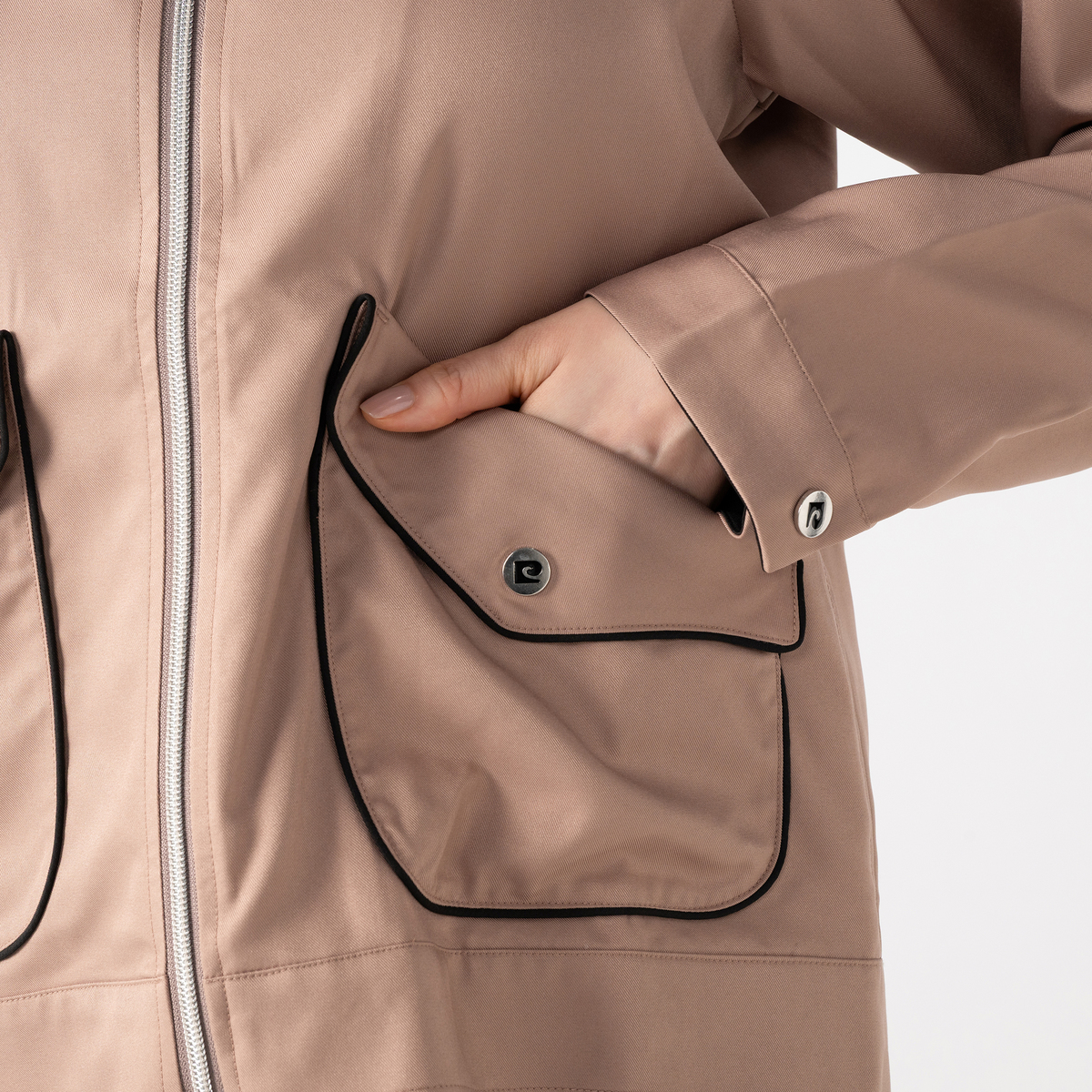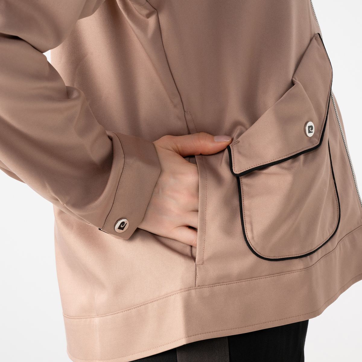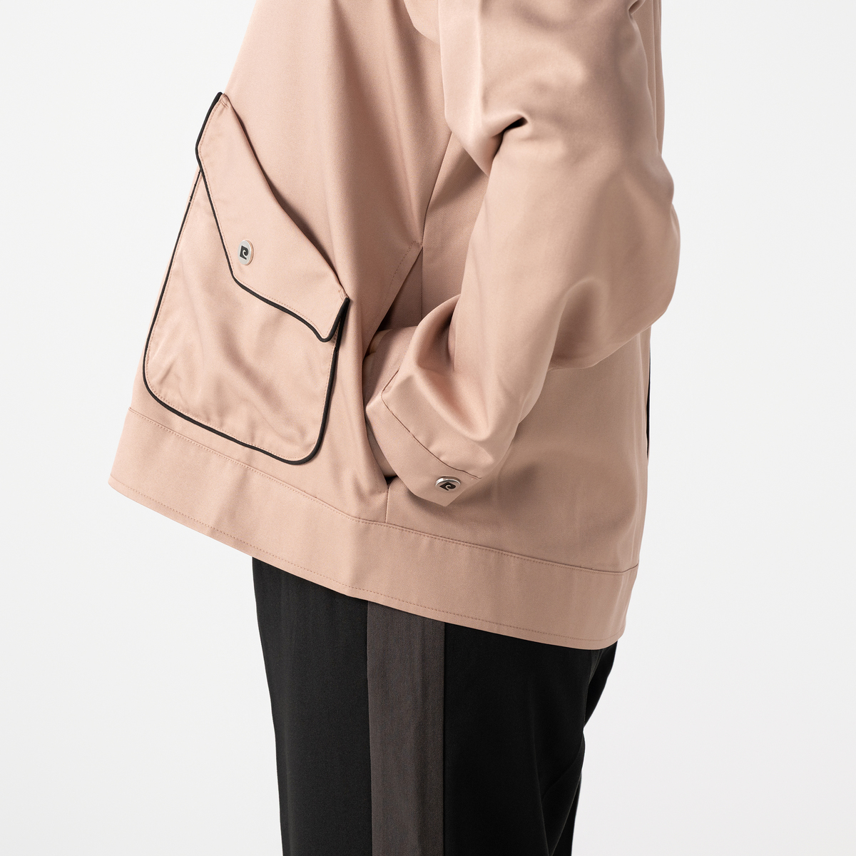 端正なパイピング配色や立体的なポケットが、コーディネートにモードなニュアンスを添えます。オリジナルロゴ入りボタンやプレートがアクセントとなり、リッチ見えに。細部までこだわりが感じられます