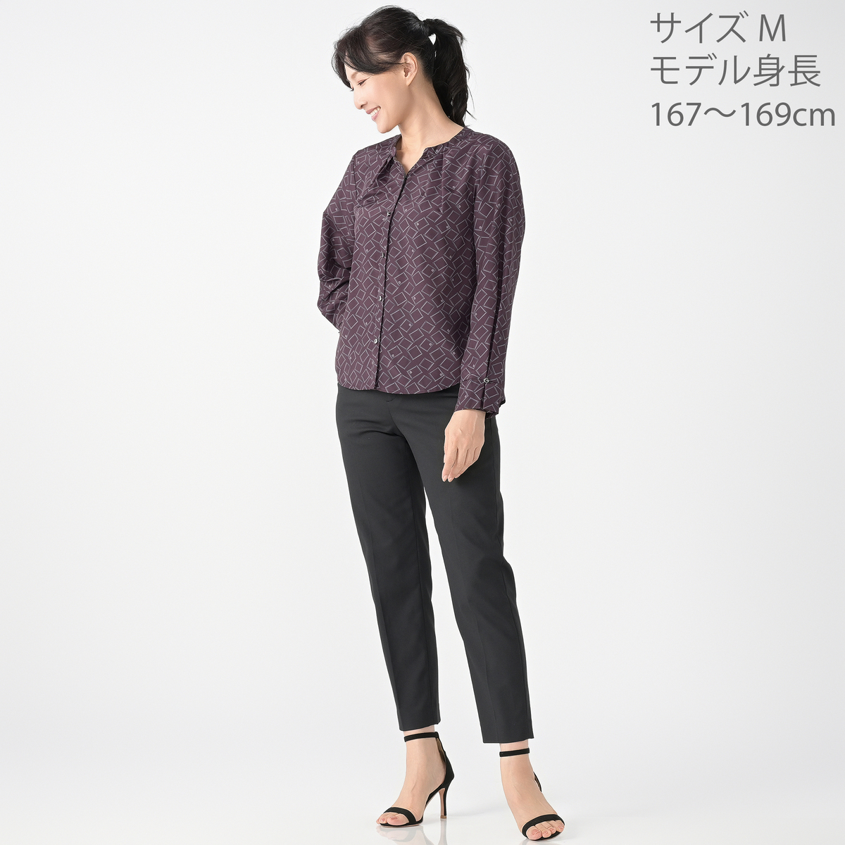 首元と袖口に寄せたタックが、華やかでさりげないアクセントに。裾には前後差をつけ、動きのある印象をプラスしました。程よいゆとり感で体型を拾いにくく、オフィスやお出かけなど幅広いシーンで活躍します