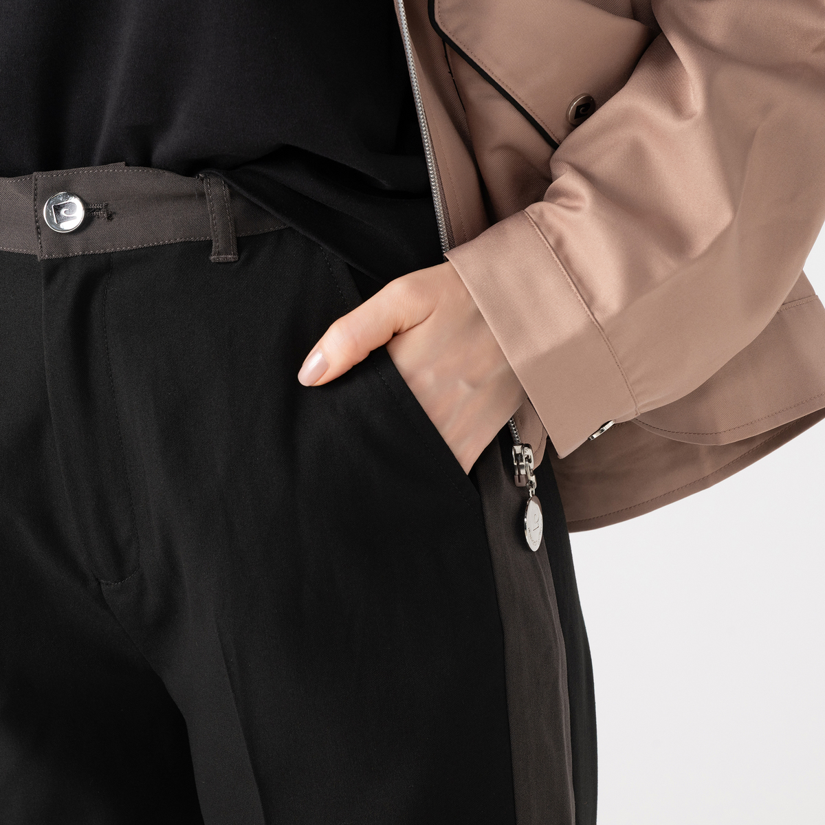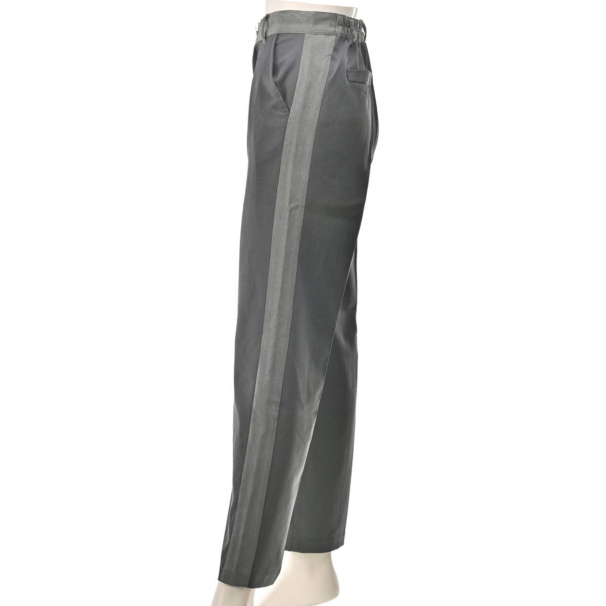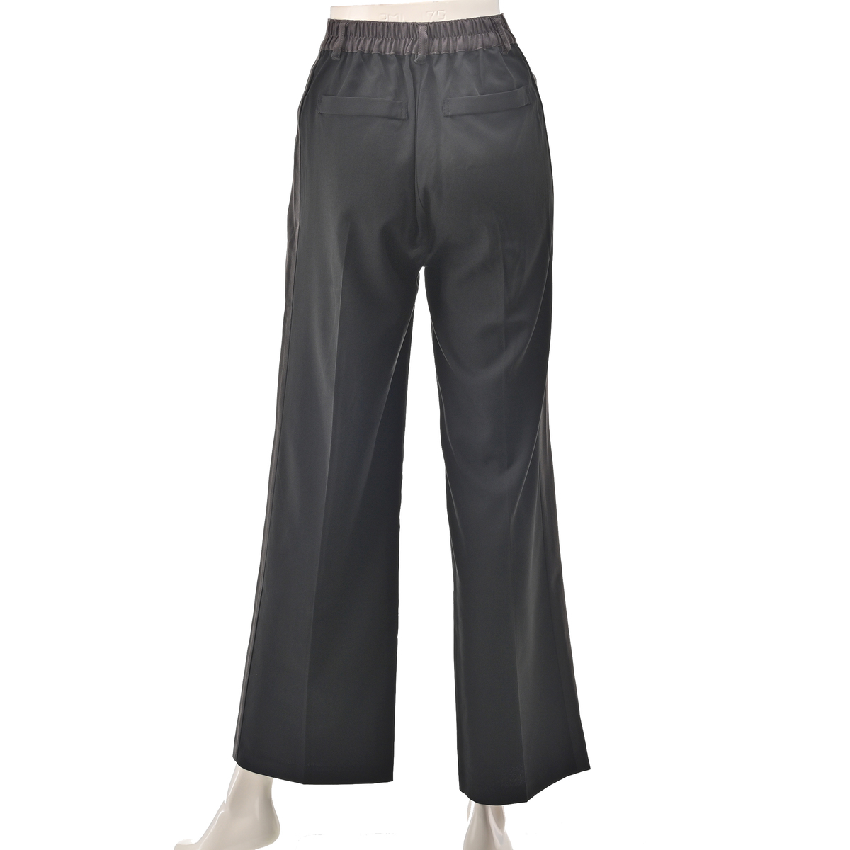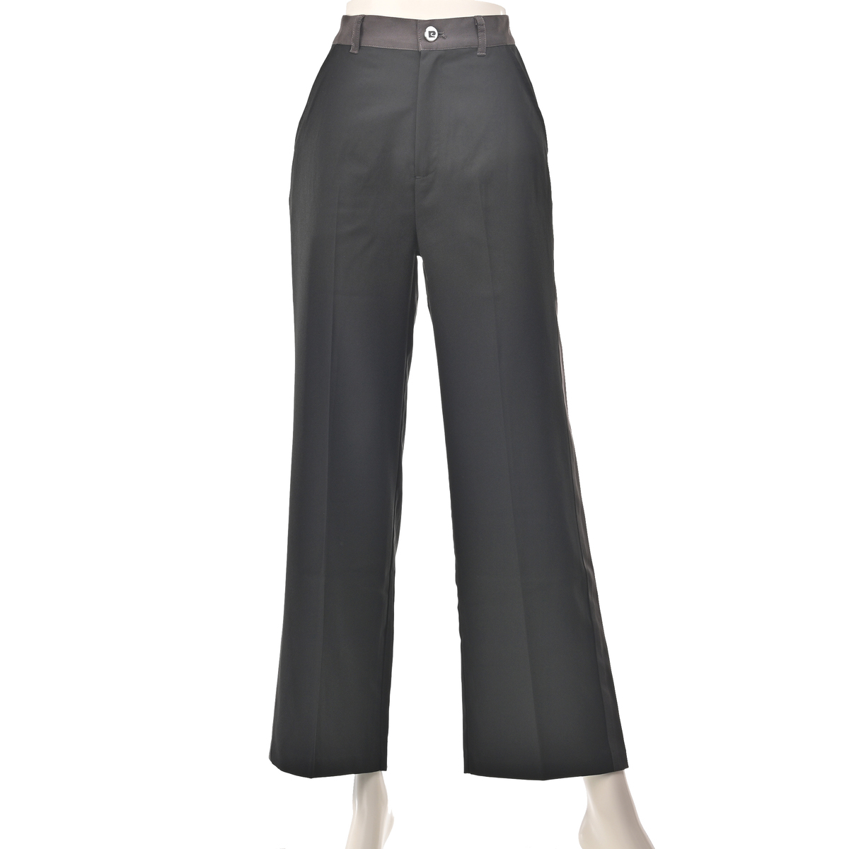 サイドに配色ラインを施したセミワイドパンツ。センタープレスを入れ、ヒップには飾りポケットを施してアクセントを効かせています。前開き仕様で、ウエスト部分は一部ゴムを使用しながらも、きちんとした印象に仕上げました