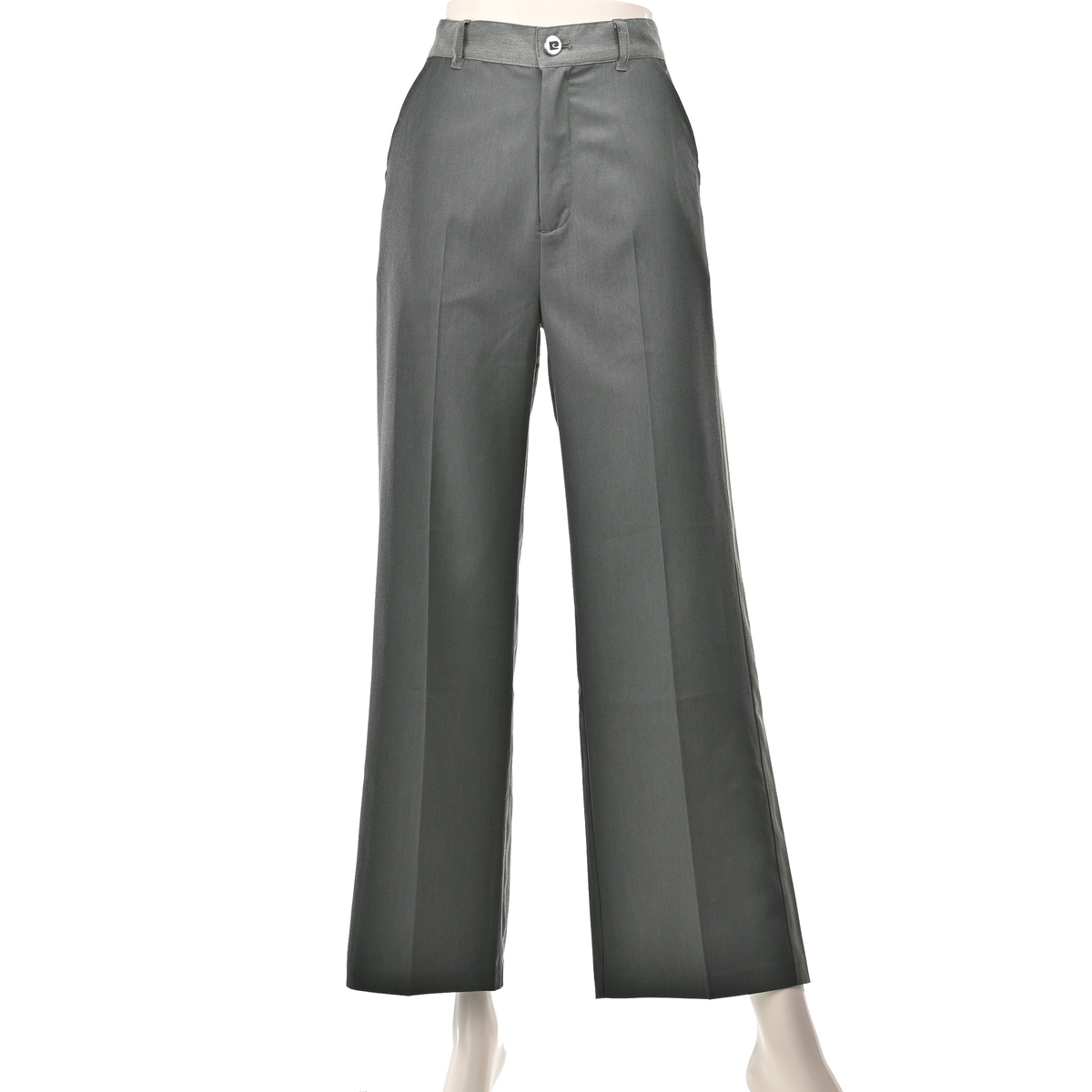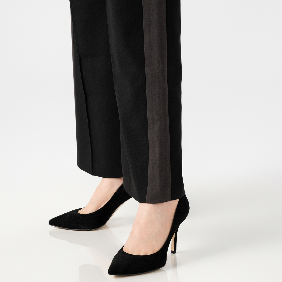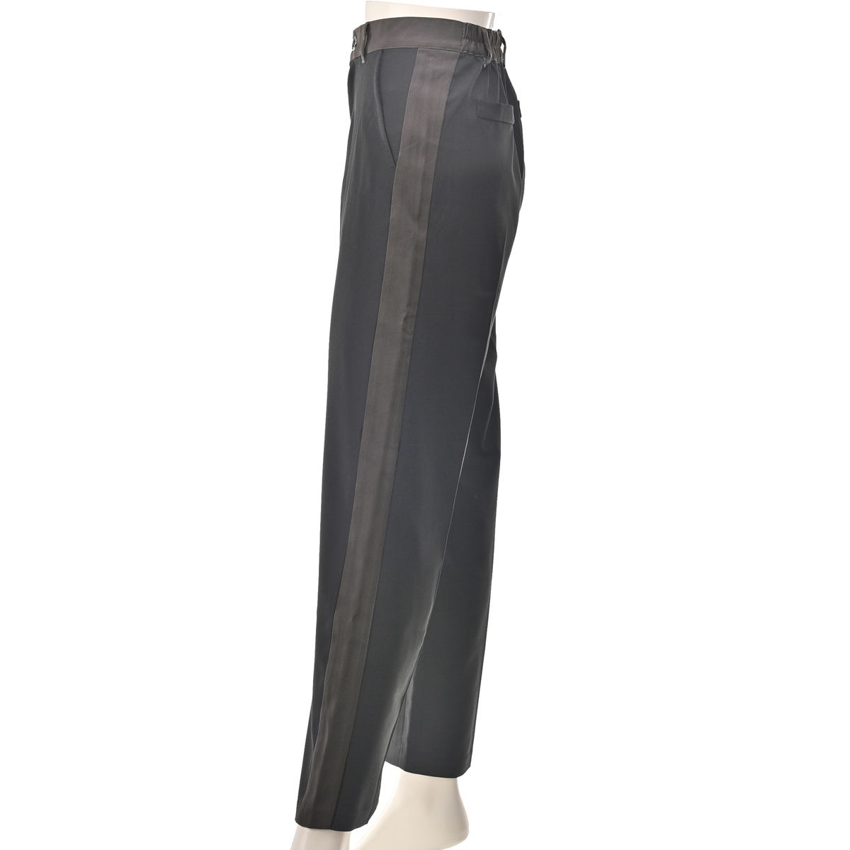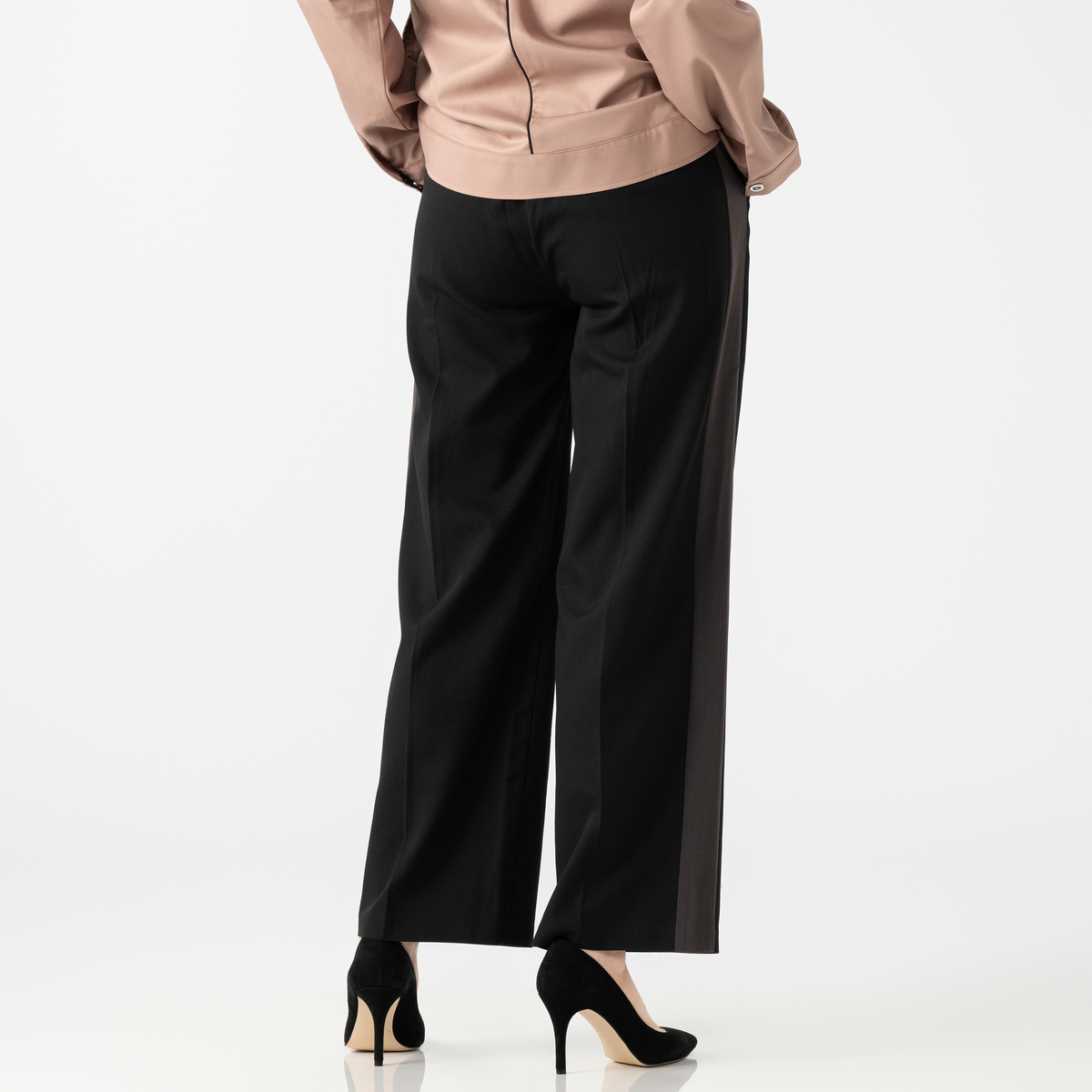 サイドに配色ラインを施したセミワイドパンツ。センタープレスを入れ、ヒップには飾りポケットを施してアクセントを効かせています。前開き仕様で、ウエスト部分は一部ゴムを使用しながらも、きちんとした印象に仕上げました