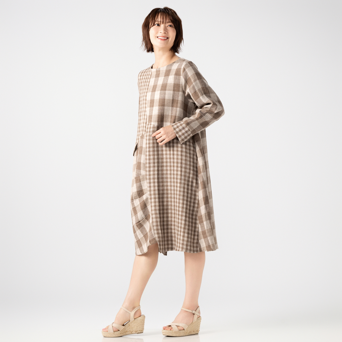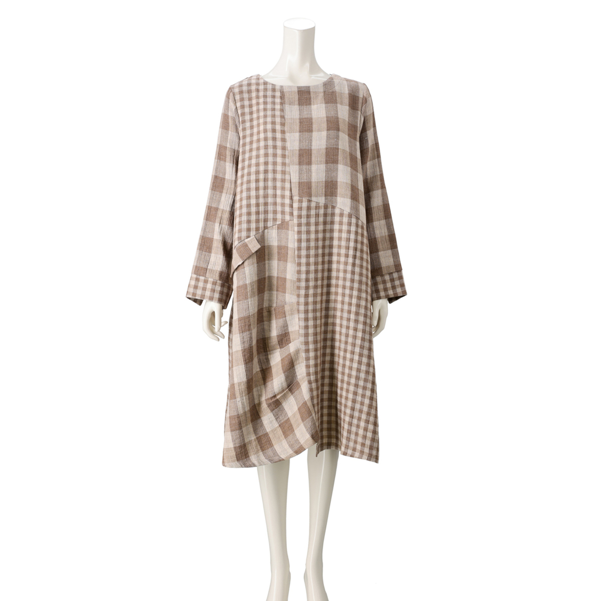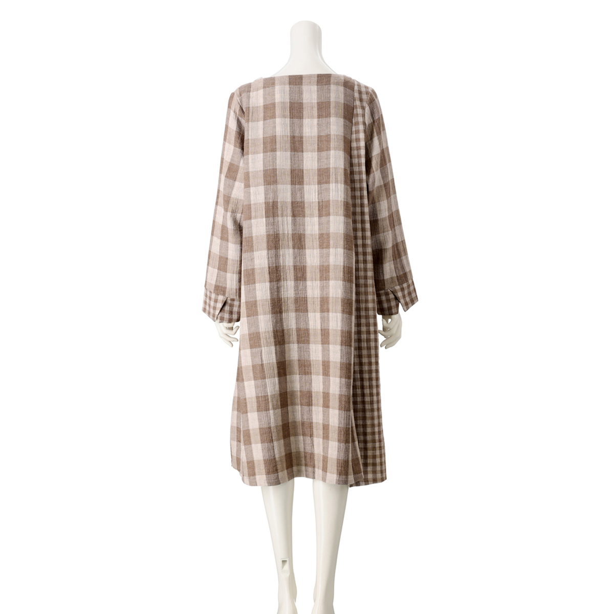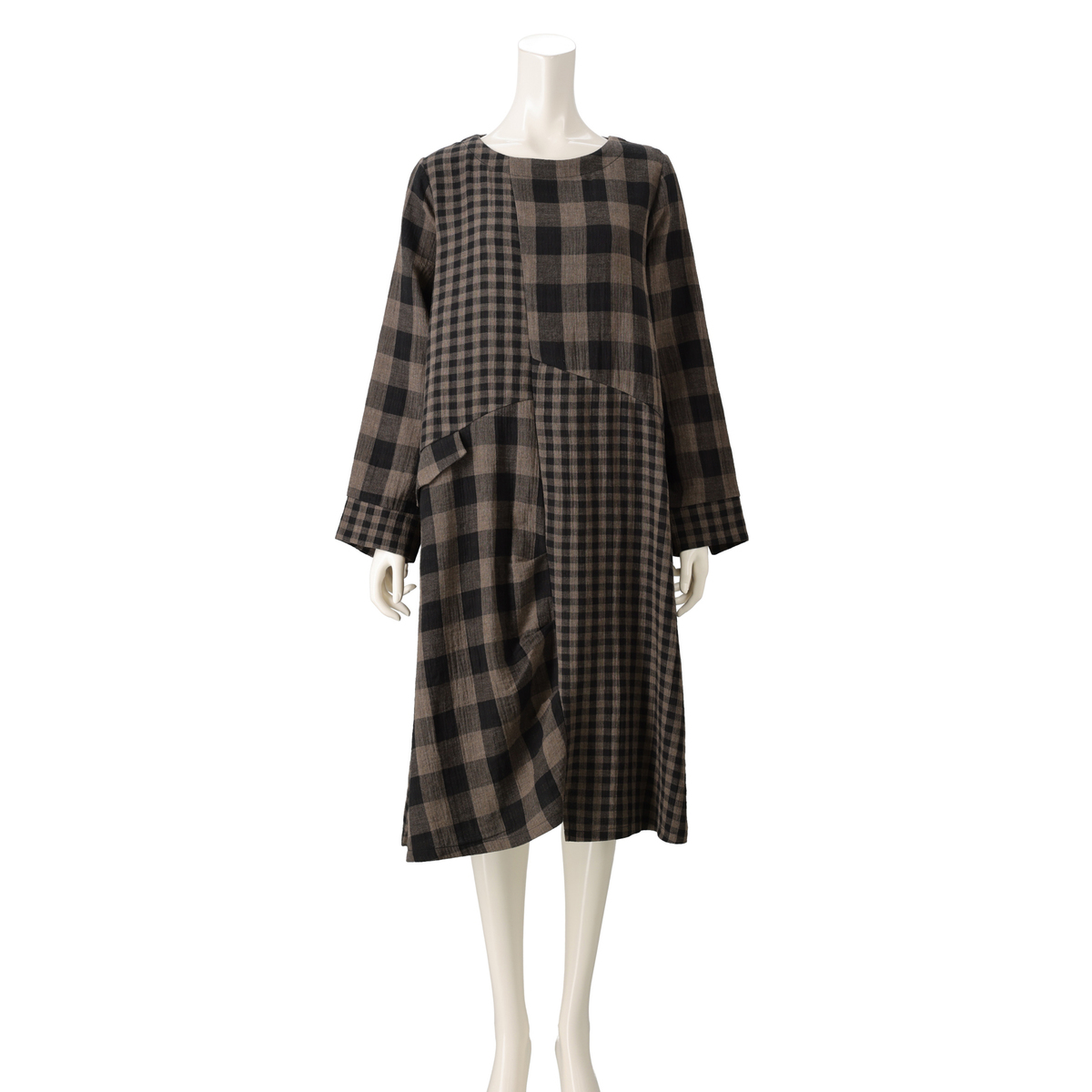 異なる大きさのチェック柄を組合せたワンピース。シンプルなAラインシルエットと大胆な切り替えデザインで、さりげなく大人の可愛らしさを引き出してくれます