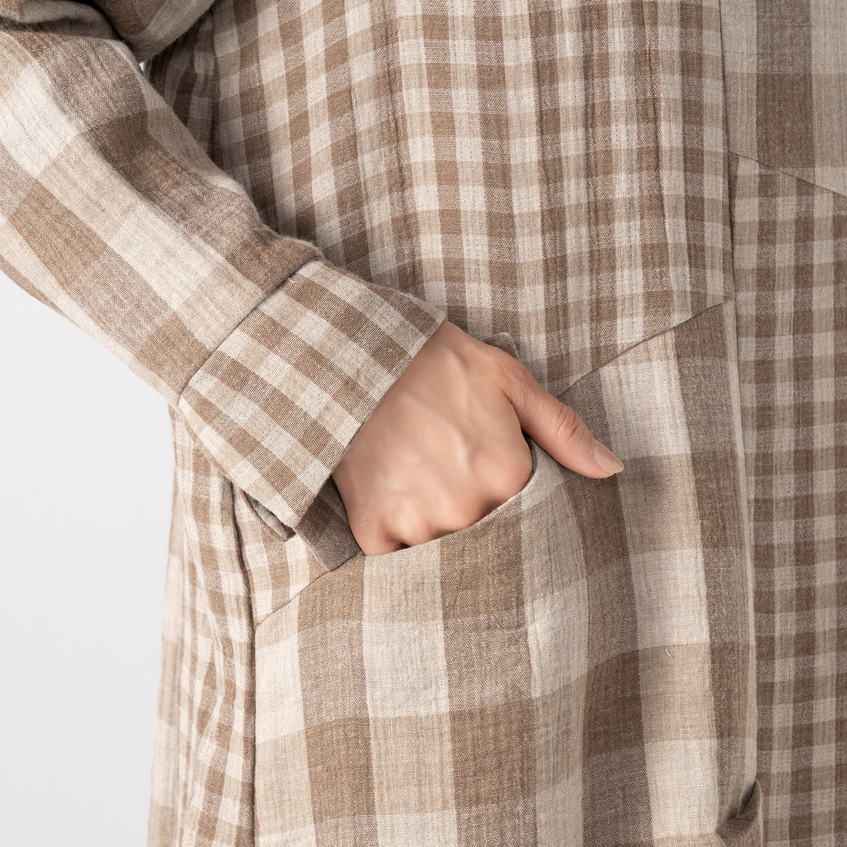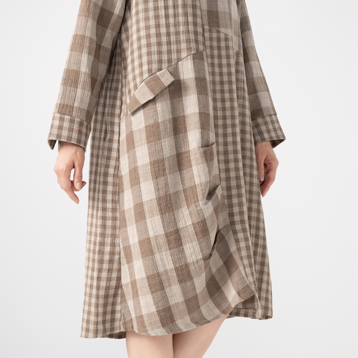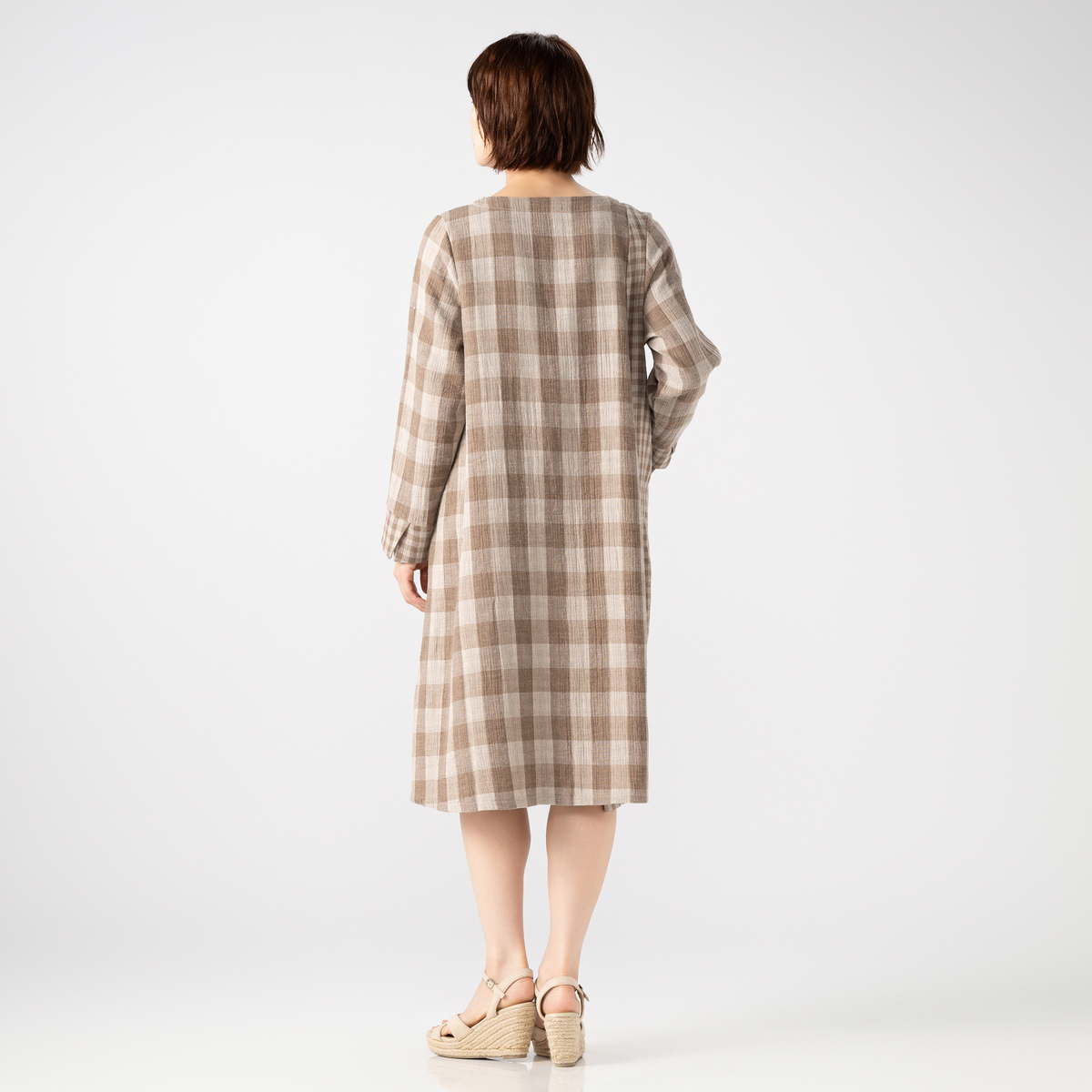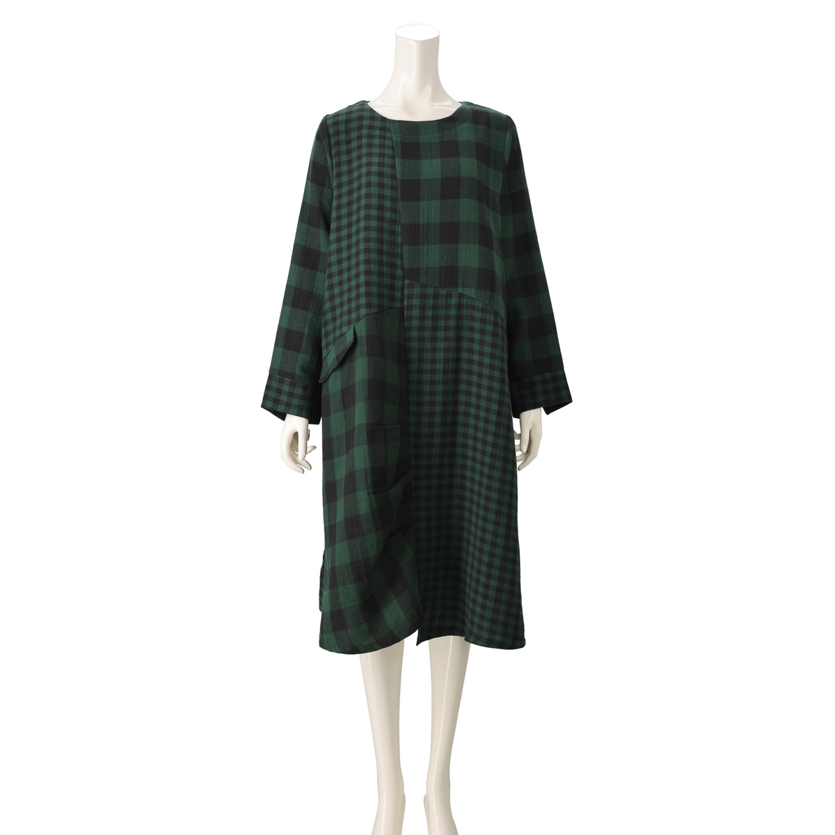 異なる大きさのチェック柄を組合せたワンピース。シンプルなAラインシルエットと大胆な切り替えデザインで、さりげなく大人の可愛らしさを引き出してくれます