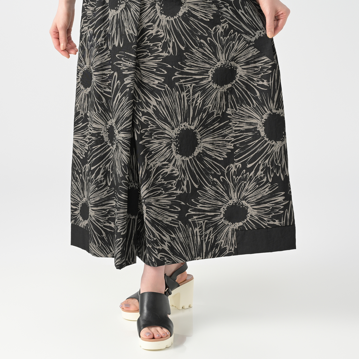 さらりとしたナイロン素材にプリント柄が広がるロングスカート。全体的に入ったフラワー模様のプリントと、くすんだ色目のバランスが、お洒落感を演出しています