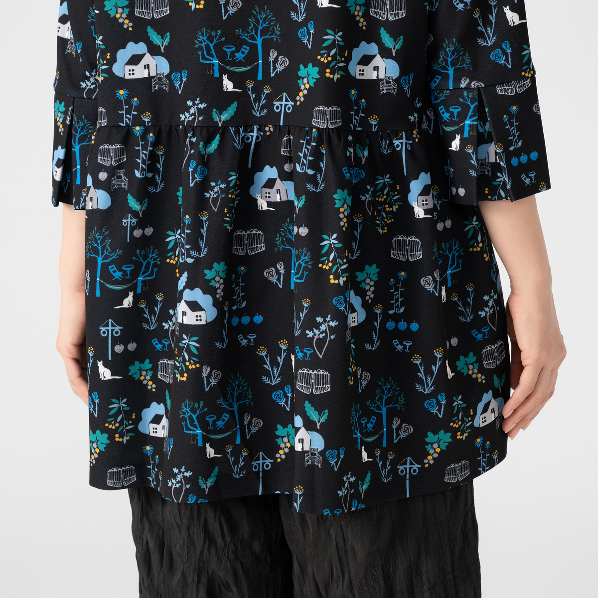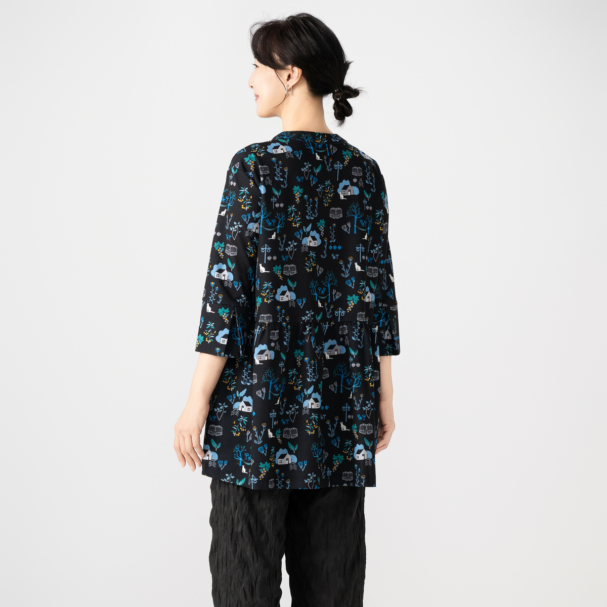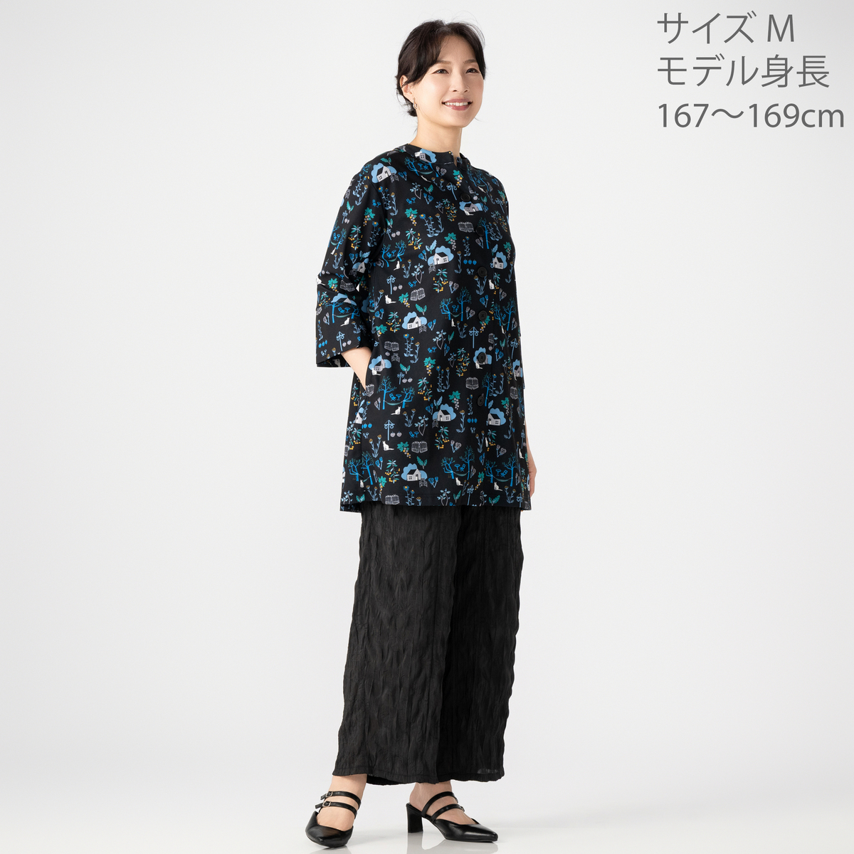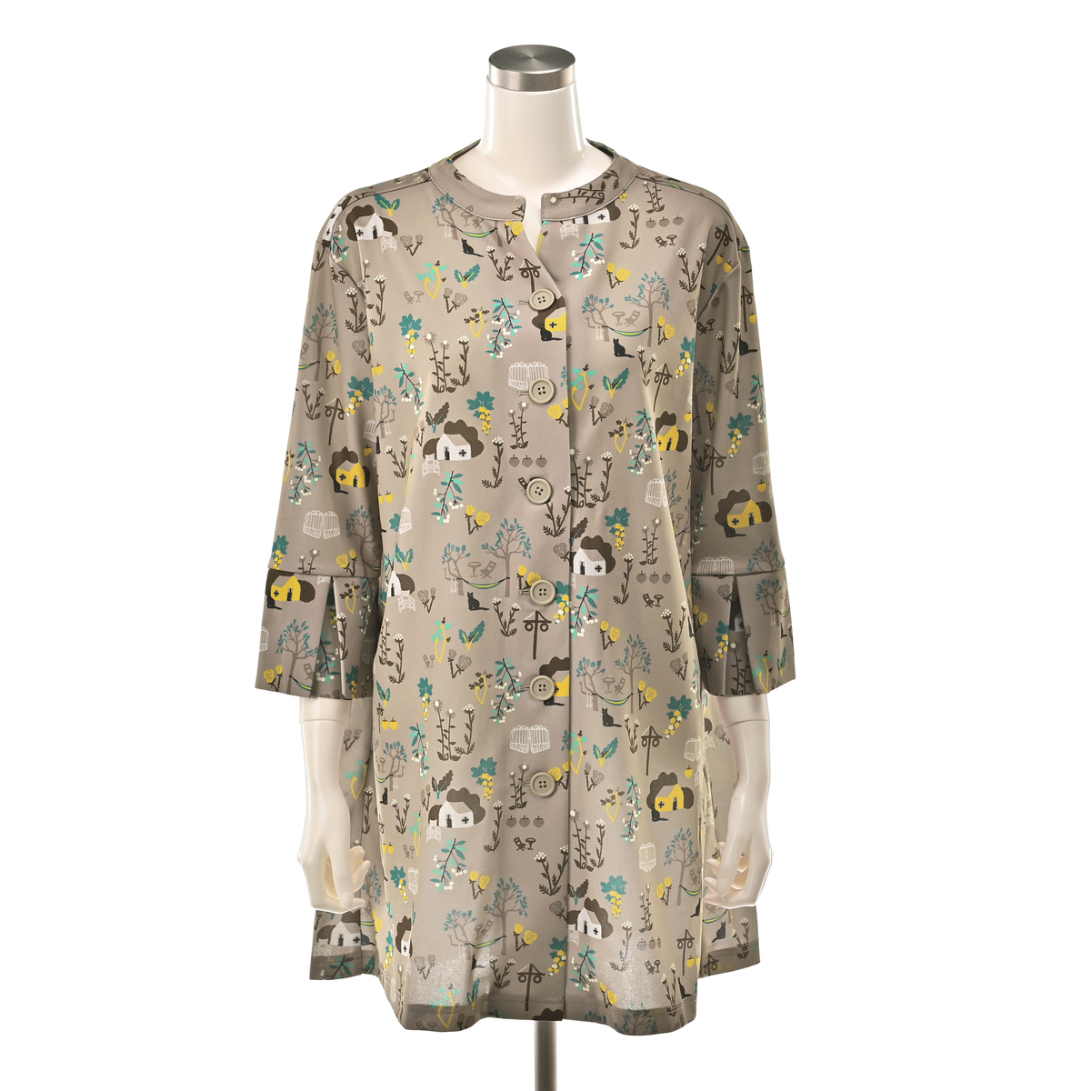オリジナルイラストプリント生地を使用したチュニック丈のブラウス。さらりとした肌触りで、きちんと感のある布帛見えするポンチ素材を使用しています。しっかりとした程よい肉厚感が高見えのポイントで、1枚で着ても羽織としても使えます