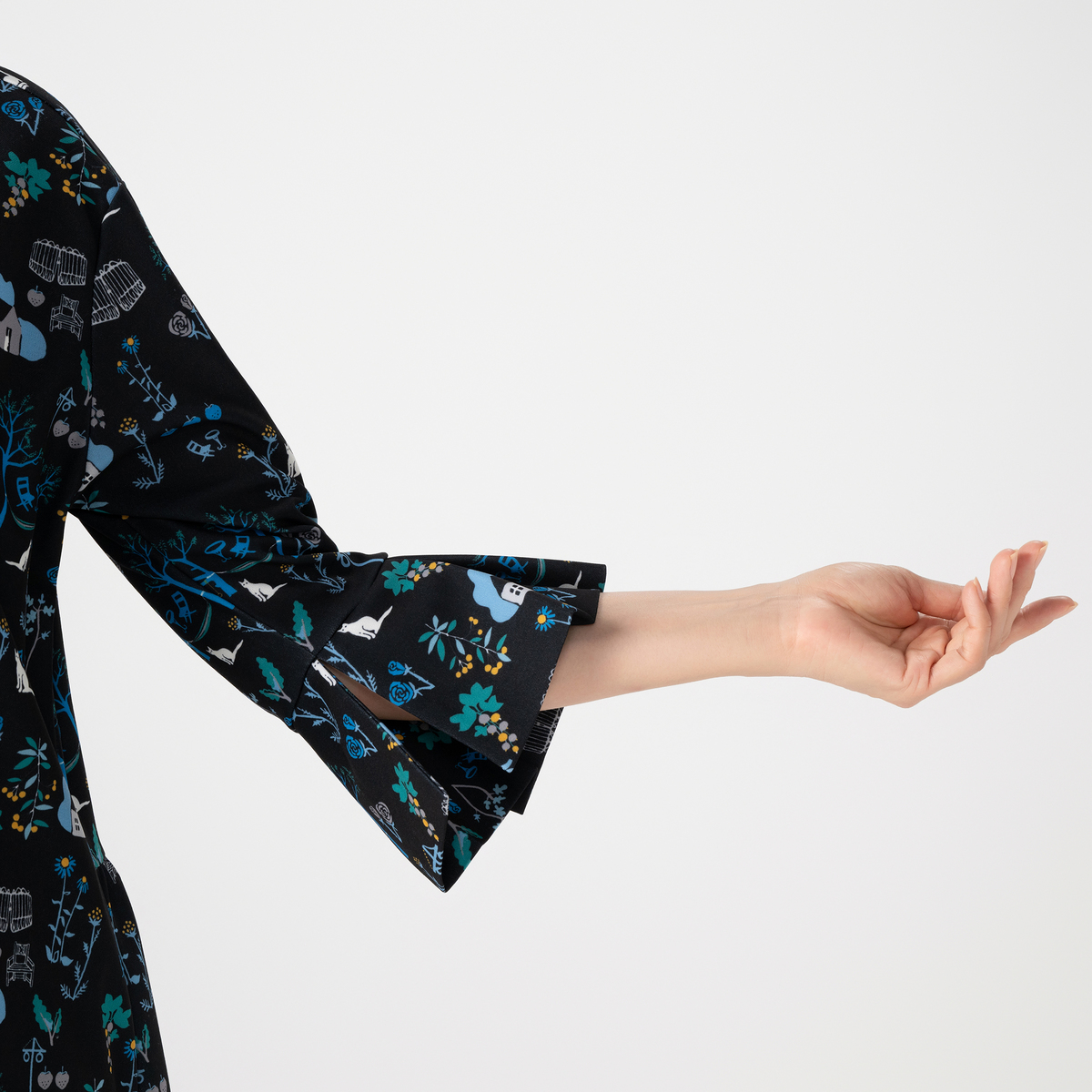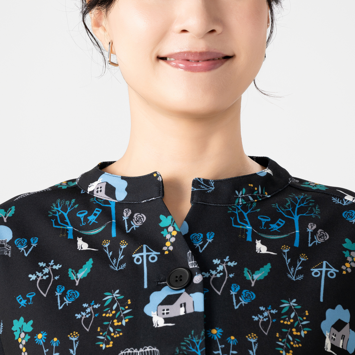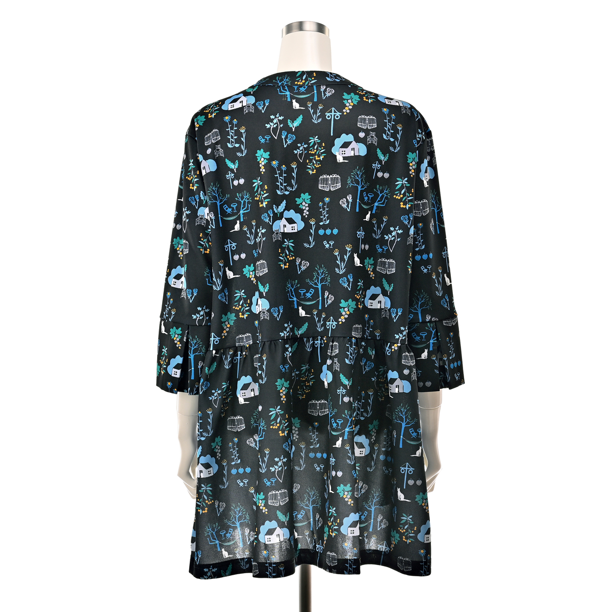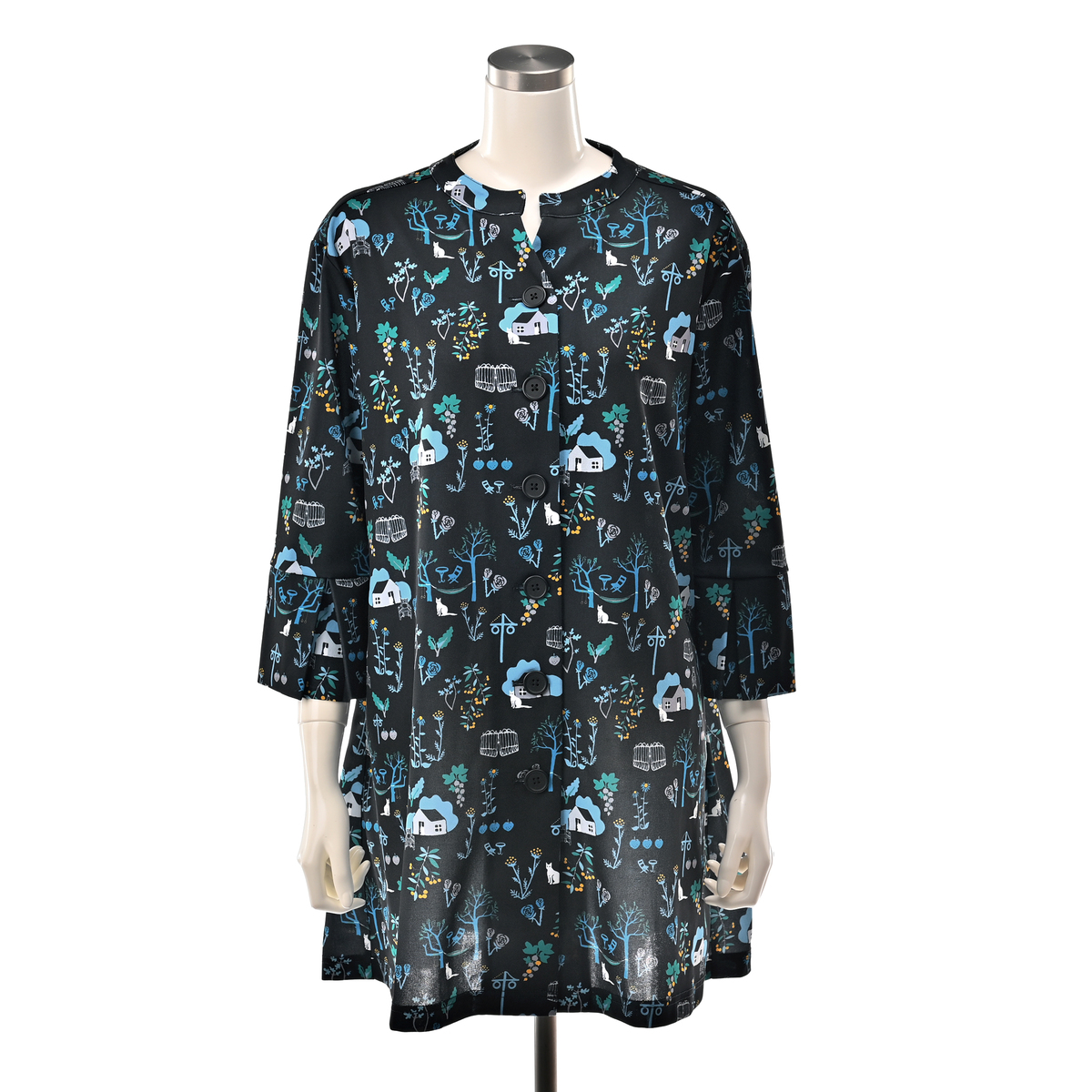 オリジナルイラストプリント生地を使用したチュニック丈のブラウス。さらりとした肌触りで、きちんと感のある布帛見えするポンチ素材を使用しています。しっかりとした程よい肉厚感が高見えのポイントで、1枚で着ても羽織としても使えます