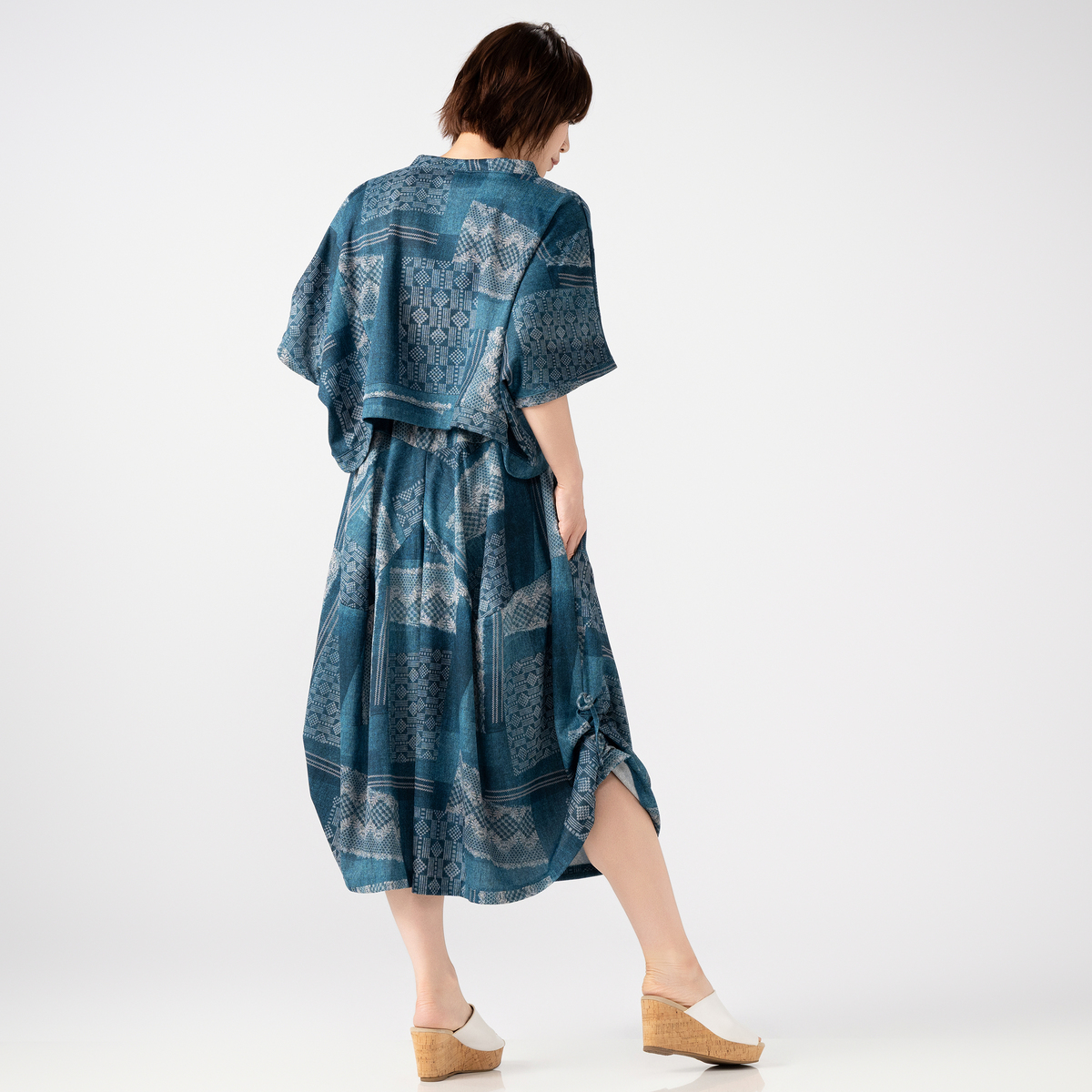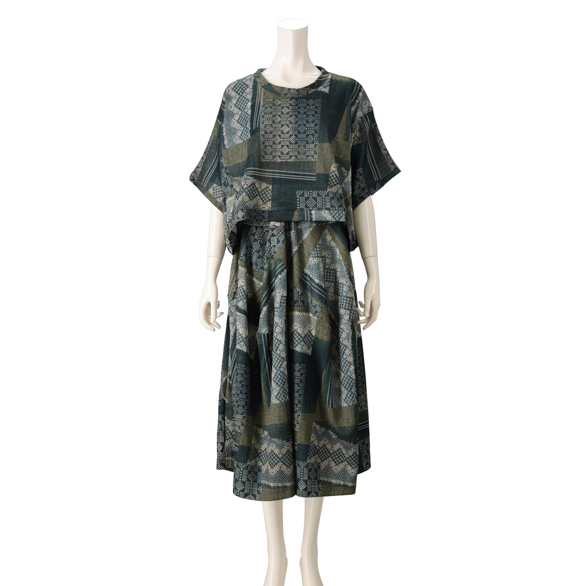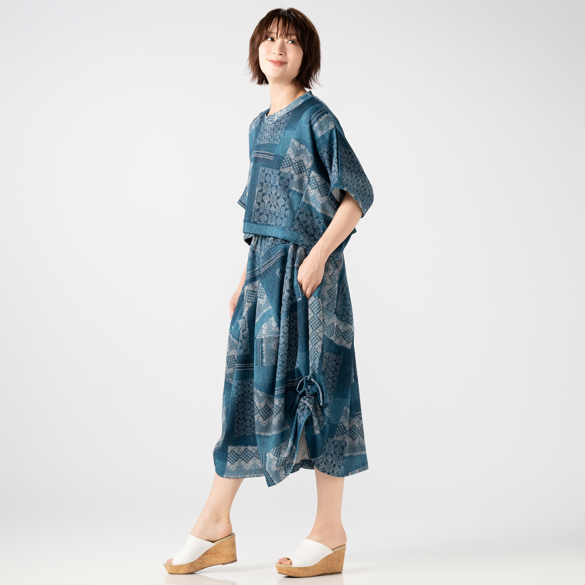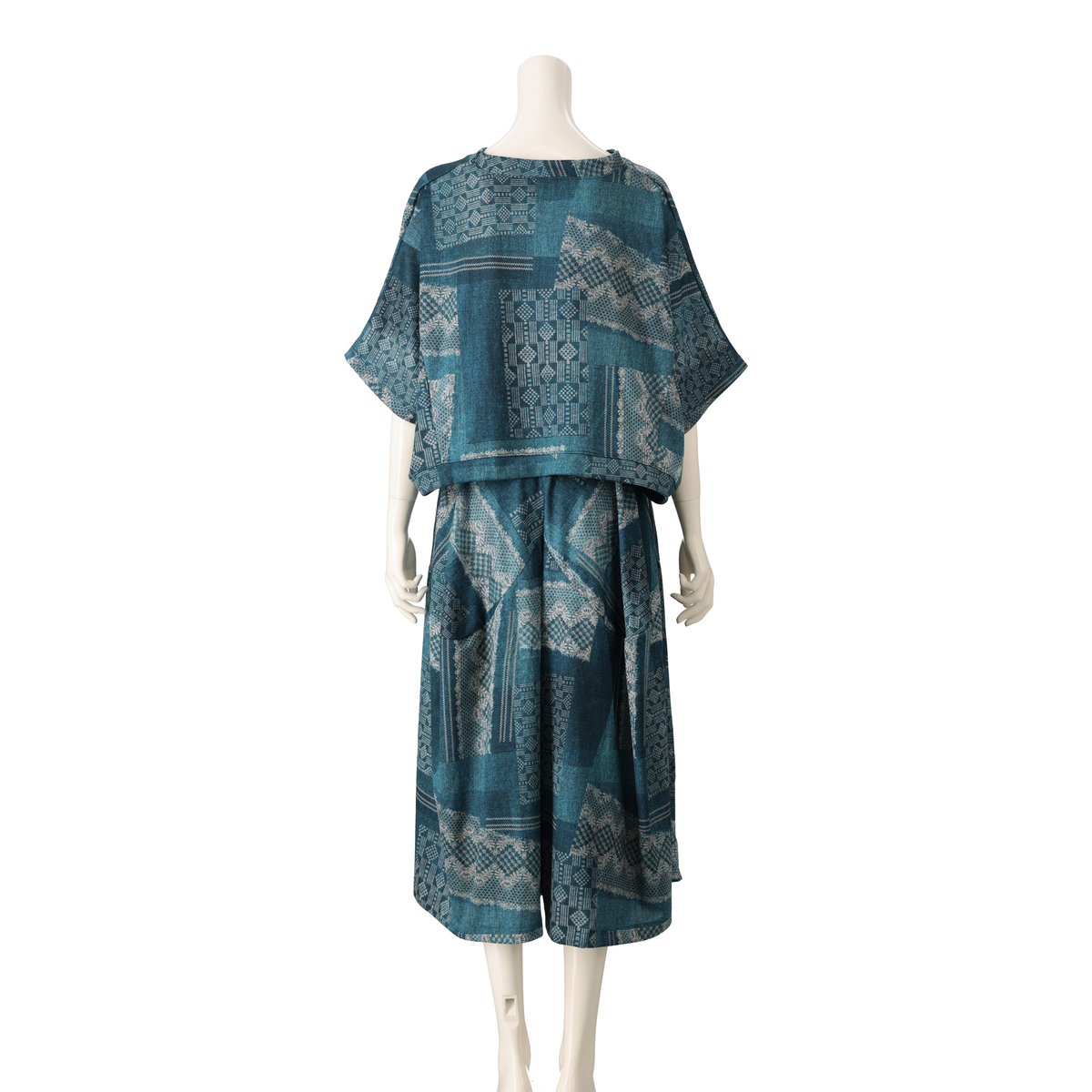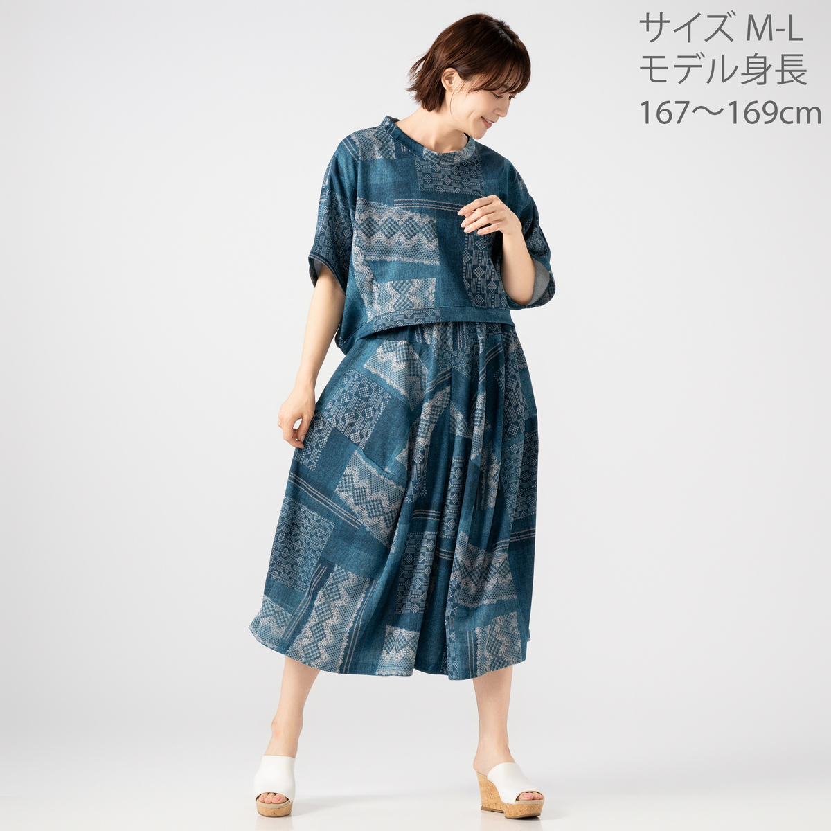 パッチワーク風プリント生地で仕立てた、ドルマンスリーブのトップスとバルーンシルエットのパンツ。体型を気にせず、おしゃれに着こなせるセットアップです