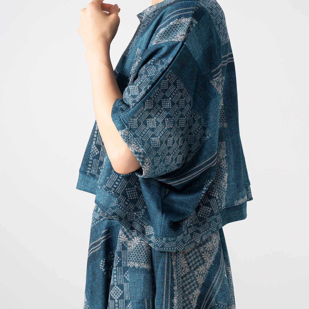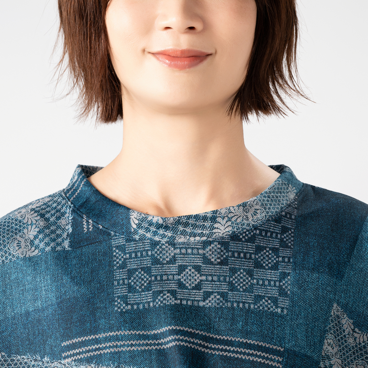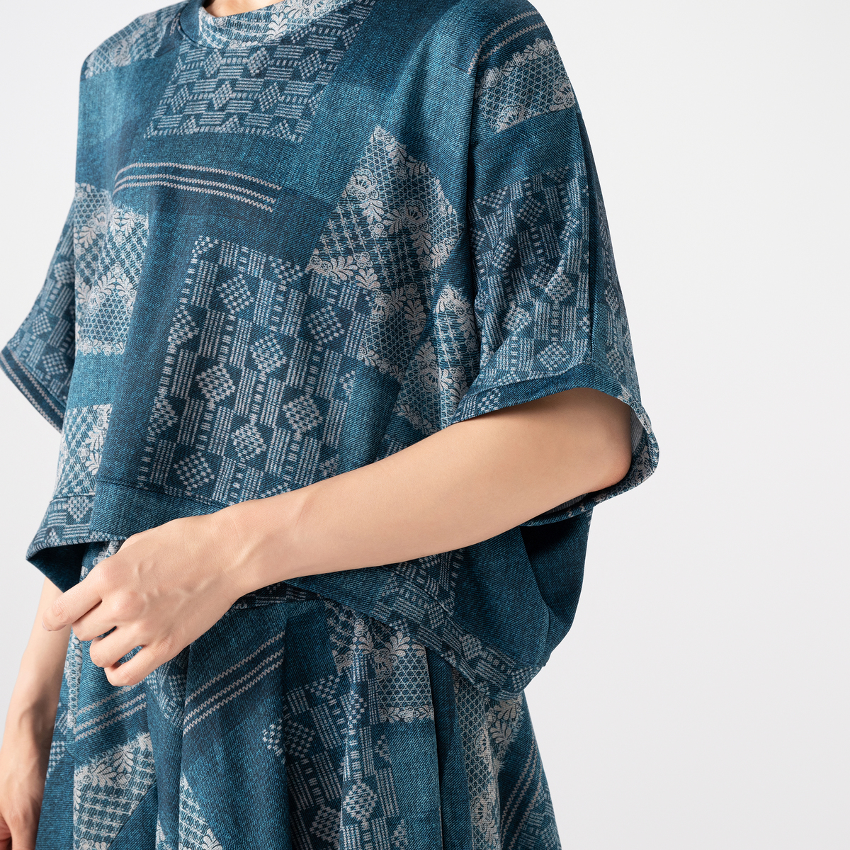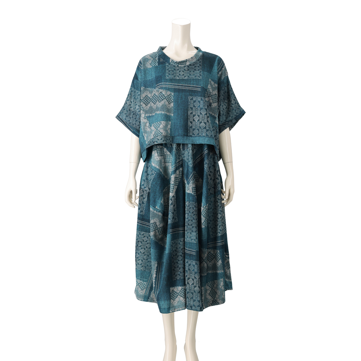 パッチワーク風プリント生地で仕立てた、ドルマンスリーブのトップスとバルーンシルエットのパンツ。体型を気にせず、おしゃれに着こなせるセットアップです