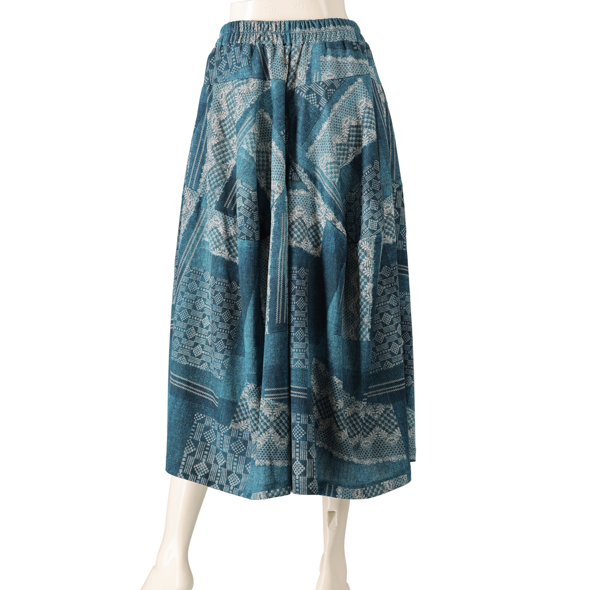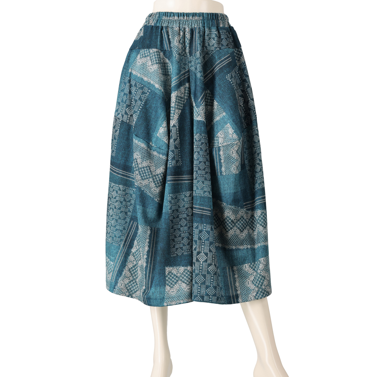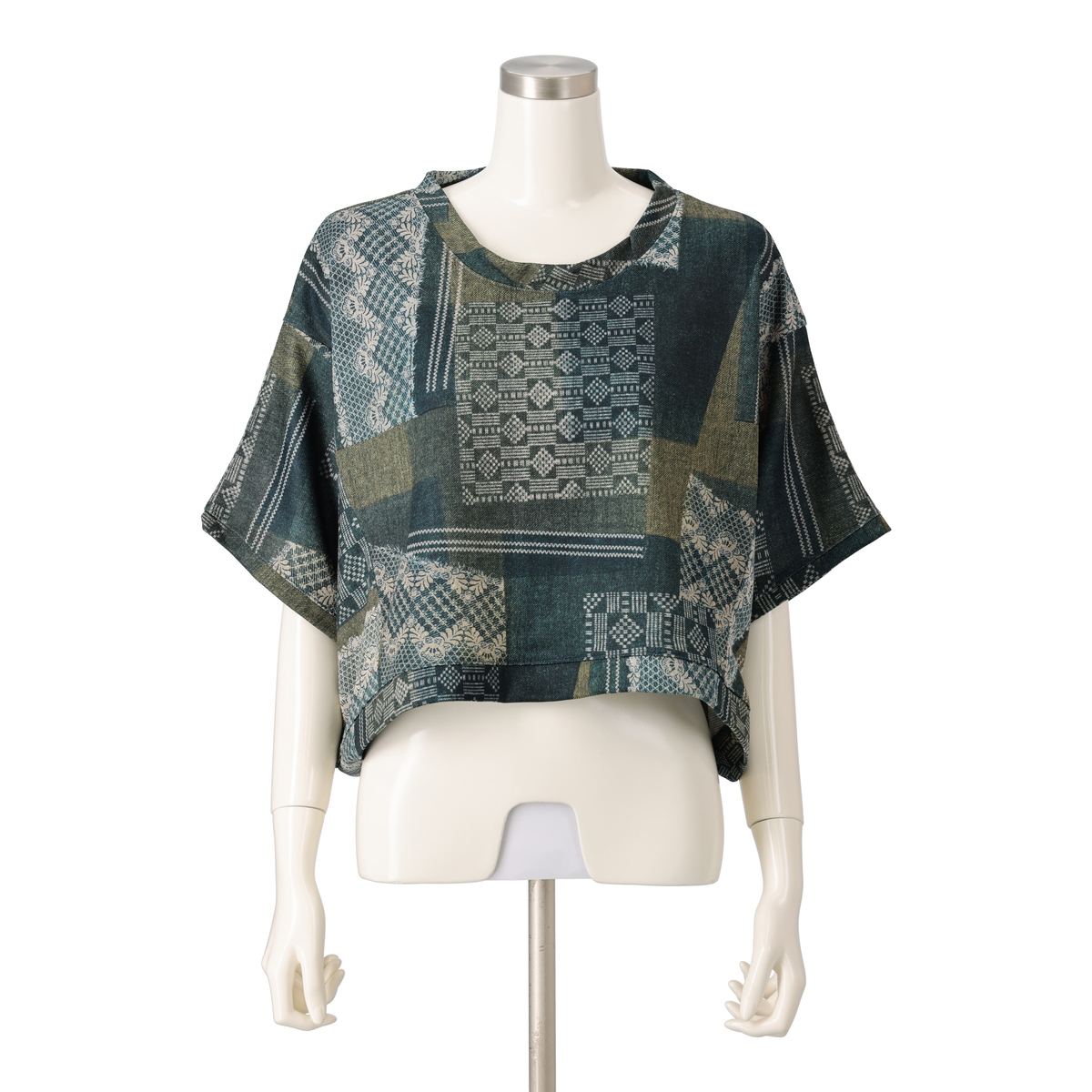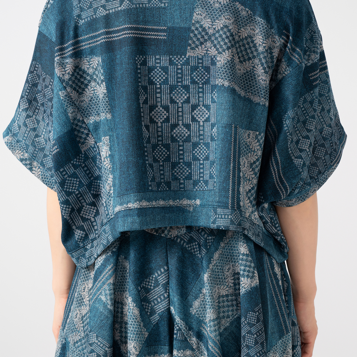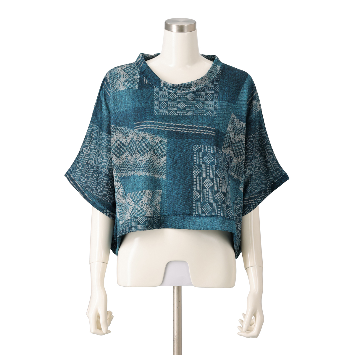 パッチワーク風プリント生地で仕立てた、ドルマンスリーブのトップスとバルーンシルエットのパンツ。体型を気にせず、おしゃれに着こなせるセットアップです