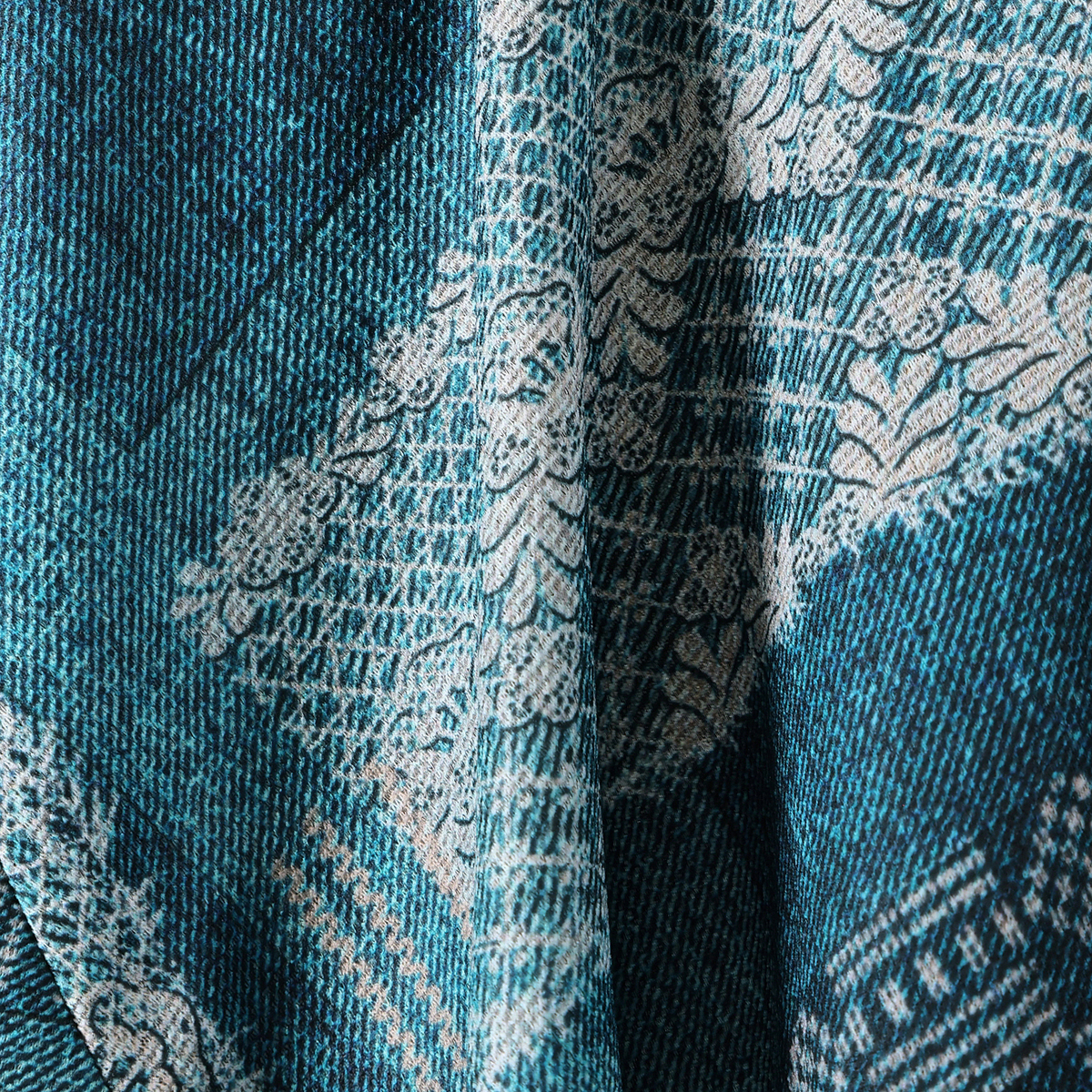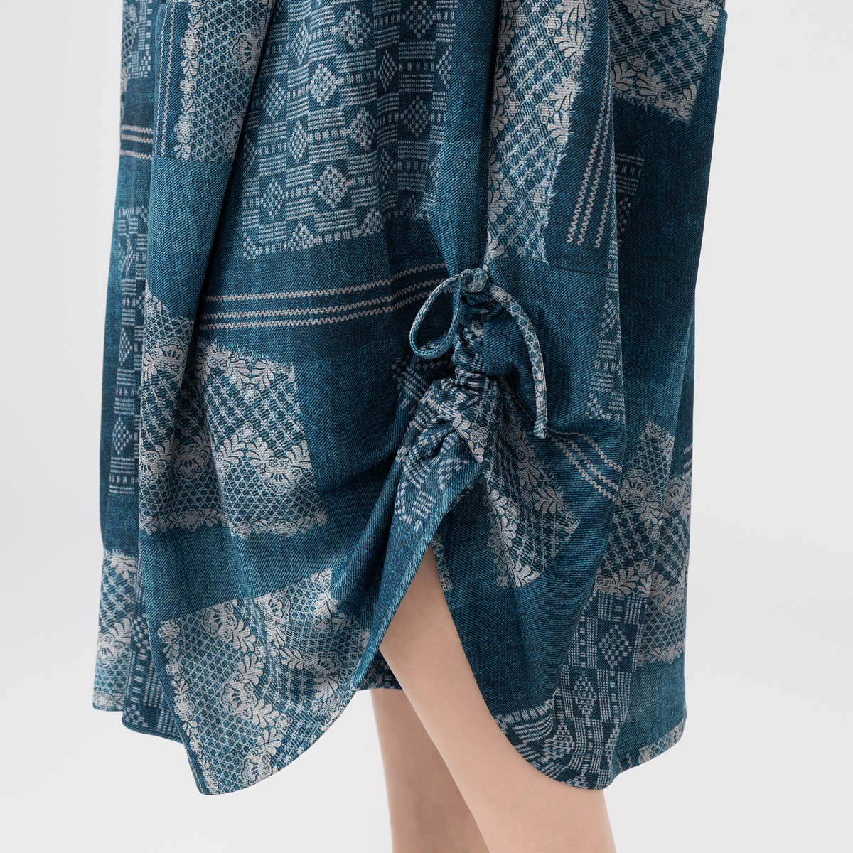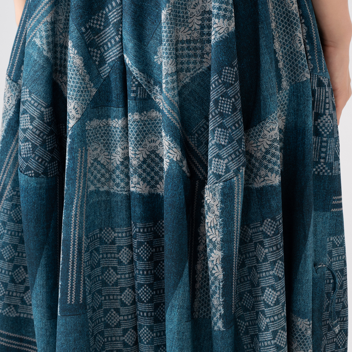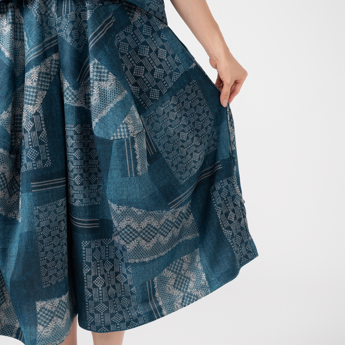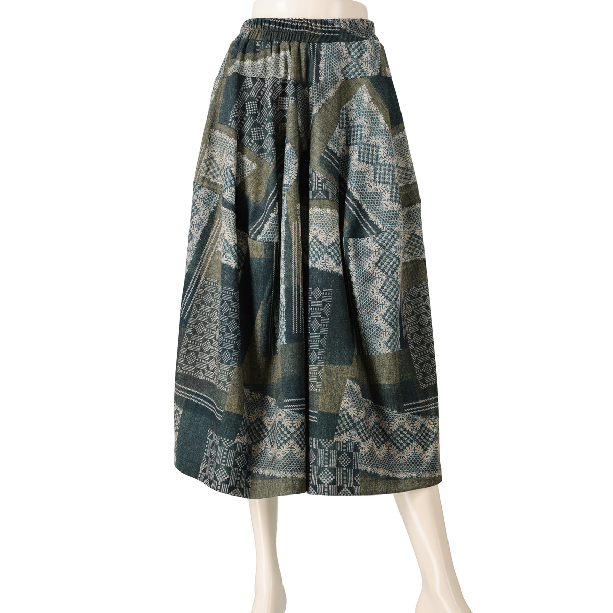 パッチワーク風プリント生地で仕立てた、ドルマンスリーブのトップスとバルーンシルエットのパンツ。体型を気にせず、おしゃれに着こなせるセットアップです