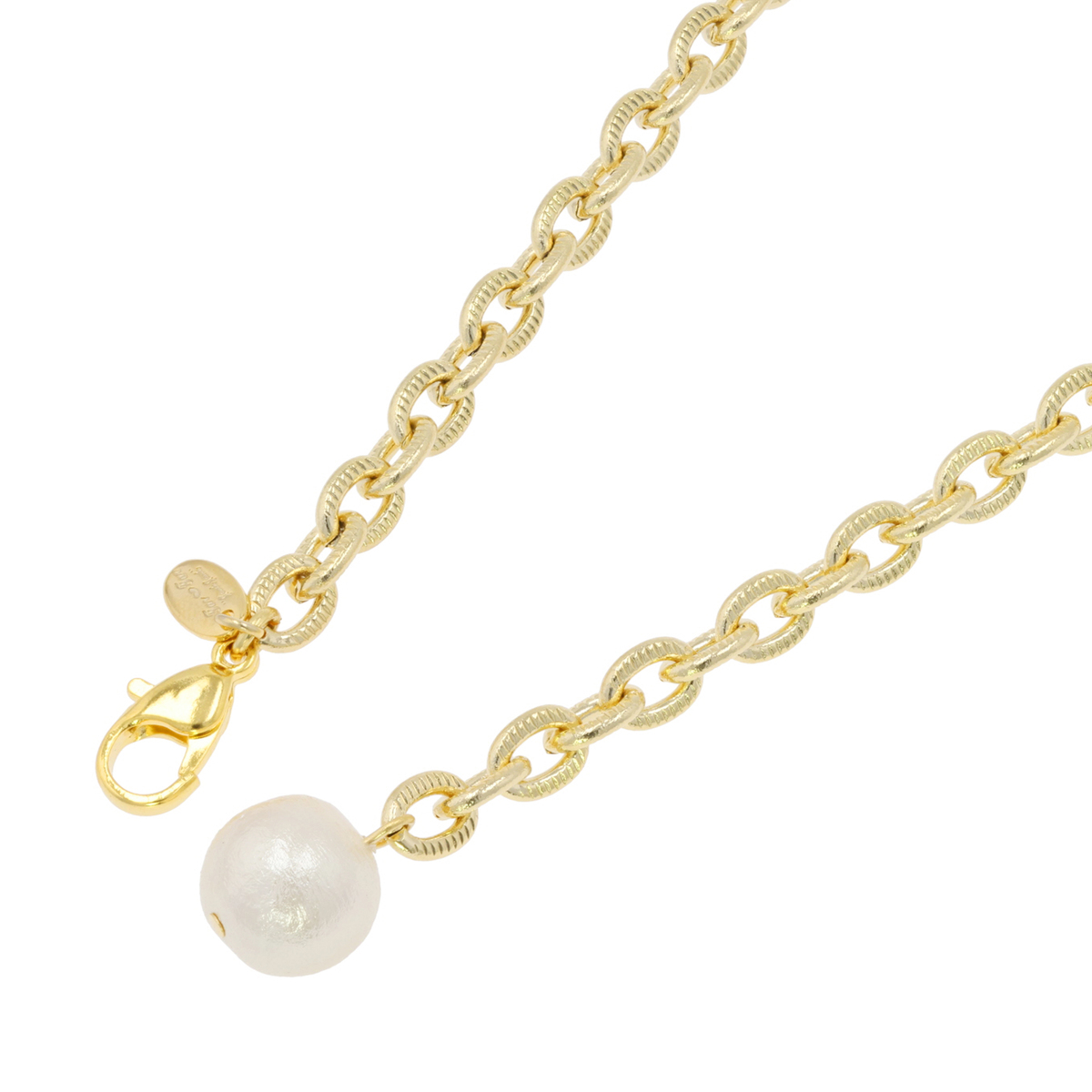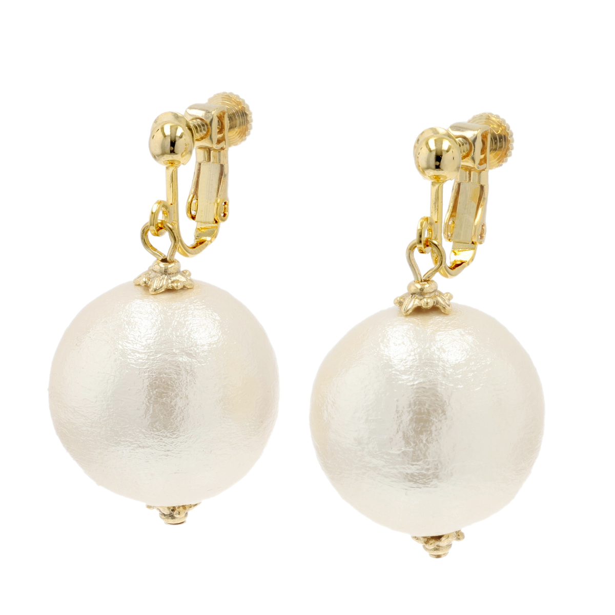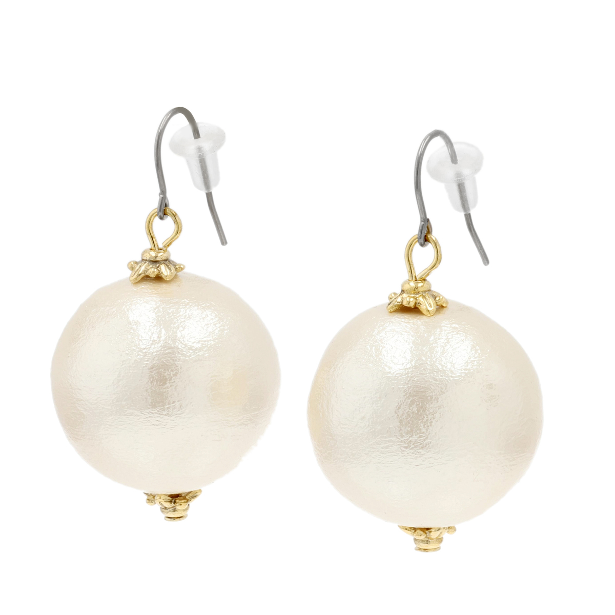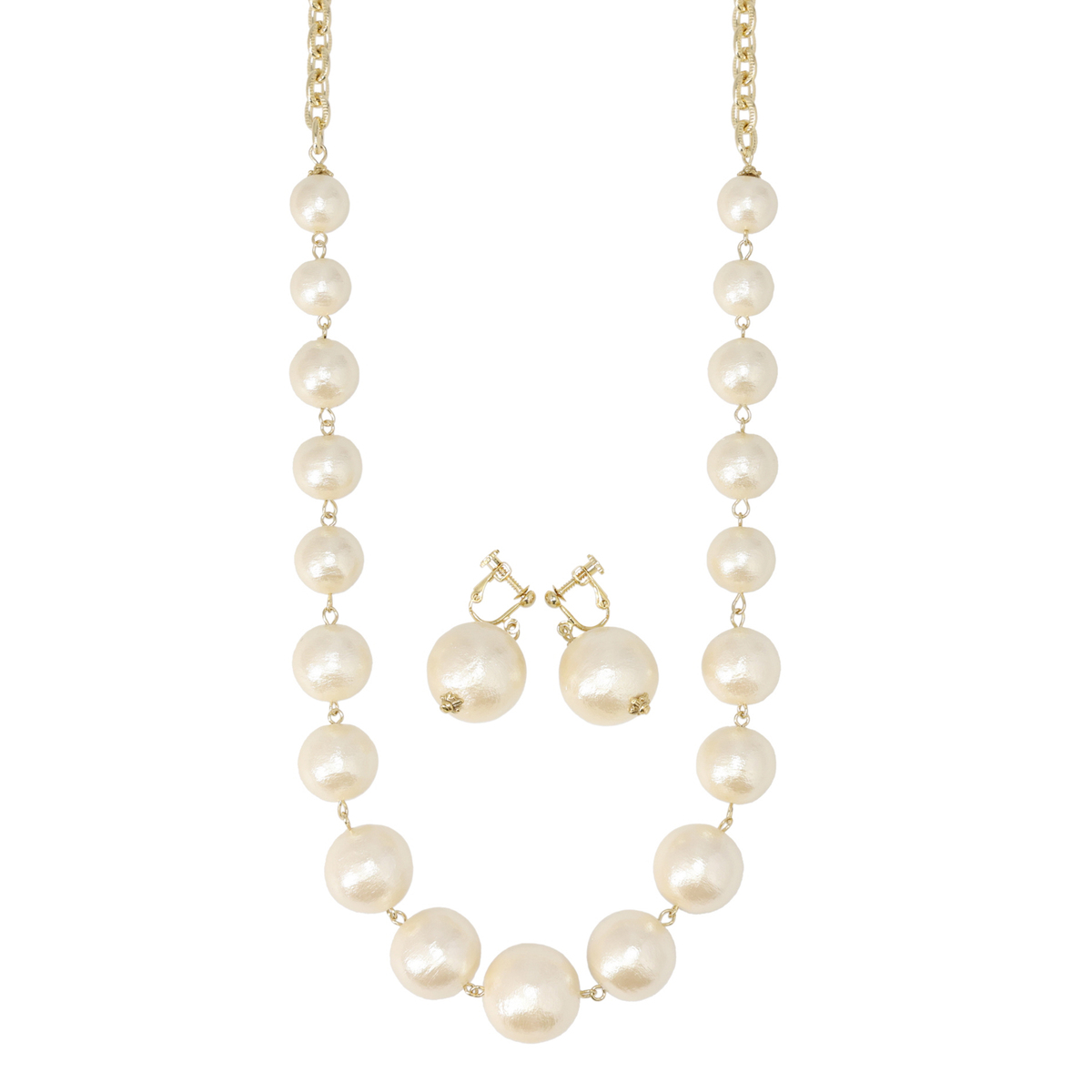 コットンを圧縮して作られたコットンパールのネックレスと、イヤリングまたはピアスのセットです。大ぶりのコットンパールとゴールドカラーのチェーンがエレガントな雰囲気を添え、存在感がありながらも軽やかな着け心地を楽しめます