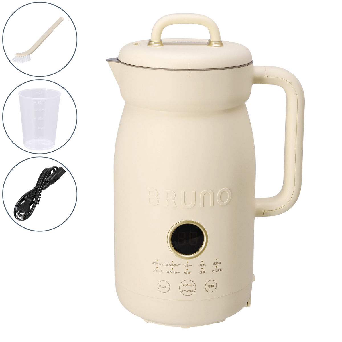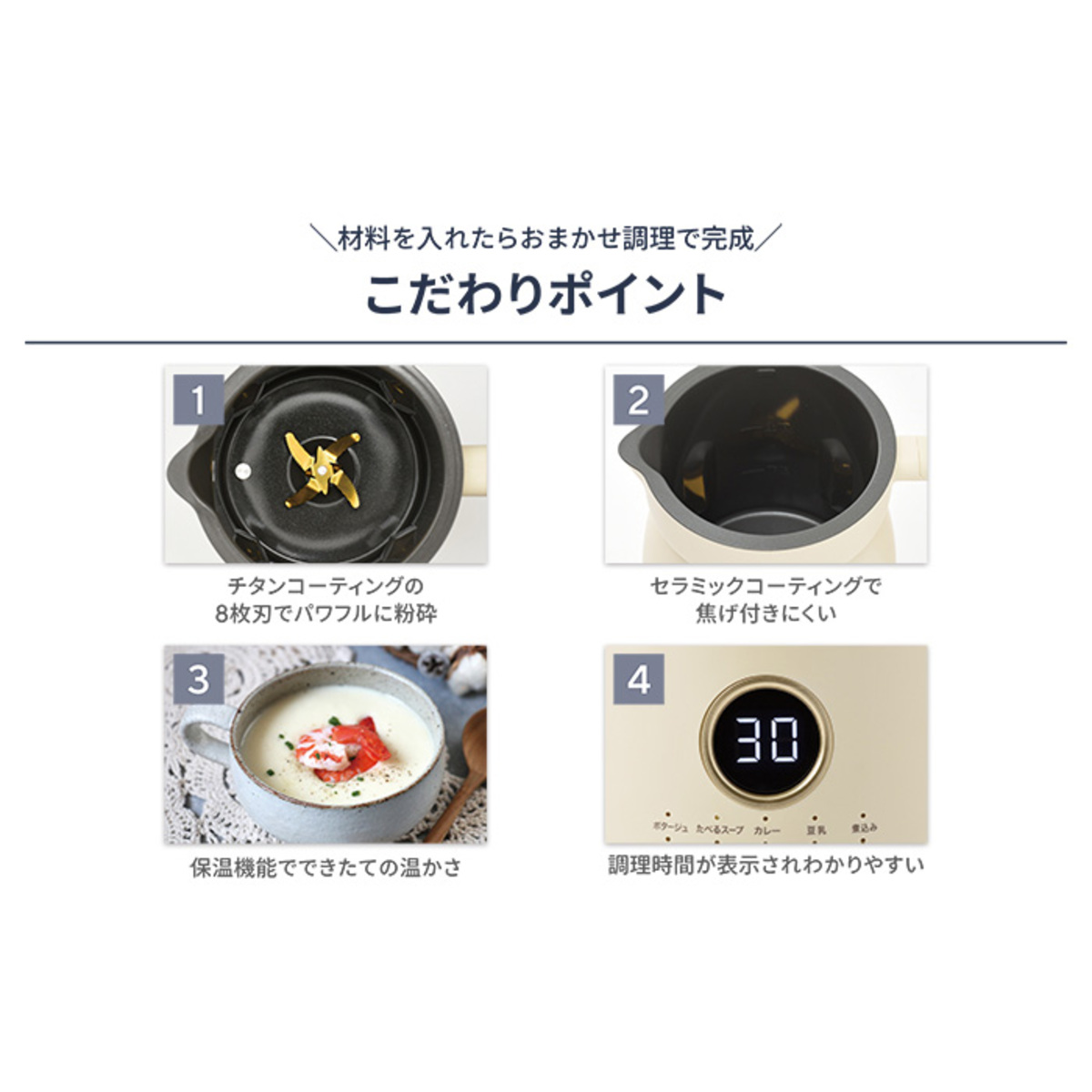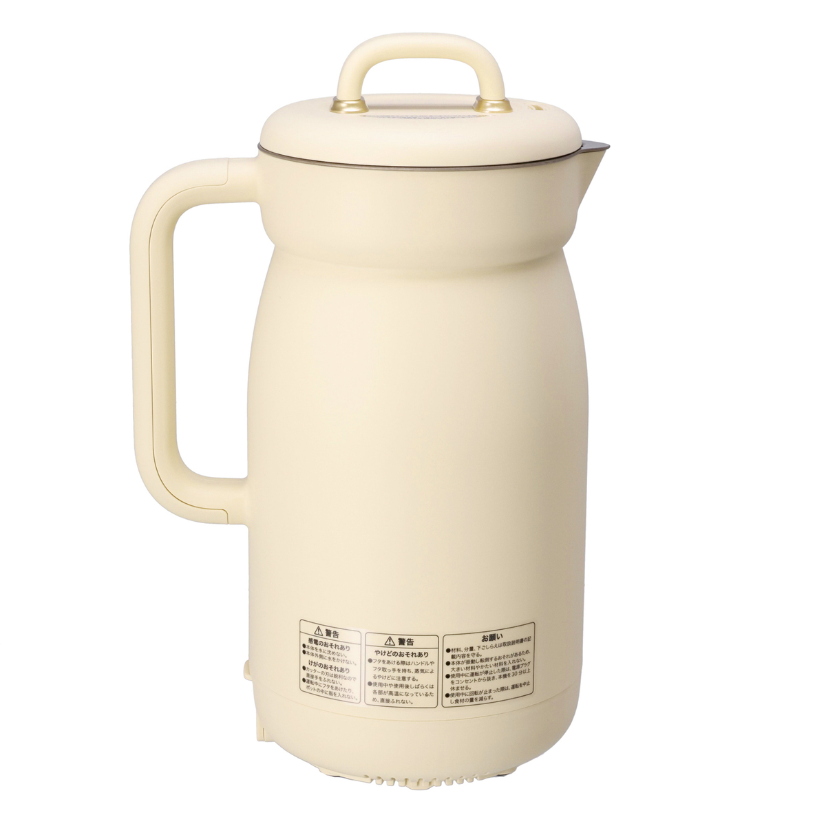 [商品内容] ・本体 ・お手入れブラシ ・電源コード ・計量カップ [サイズ] 約幅21.2×奥行15.5×高さ33cm [重量] 1900g [容量] 1000ml [コード長さ] 約1m [材質] 本体、フタ:ポリプロピレン ポット:ステンレス鋼(セラミックコーティング) カッター:ステンレス鋼(チタンコーティング) [消費電力] 500W(加熱) 250W(ミキサー) 【中国製】 [注意事項] ※使用不可:漂白剤、食器洗い機 [禁止材料] かたいもの:かつお節/朝鮮人参/コーヒー豆/穀類/スジ肉/だし昆布、煮干しなどの乾物/棒だら/冷凍食品/するめ/脂身の多い肉/乾燥したパン/干ししいたけ/市販の氷など 粘り気の強いもの:納豆/長芋/じねんじょ/つくね芋/いちょう芋/アロエなど ※氷を使うときは家庭用製氷機で作った氷(2.5cm 角以下)12~13 粒程度(130g 以下)を使用してください ※冷凍果物を使うときは半解凍し小さく切って(1.5cm 角以下)水分を入れて使用してください ※本体やポットの穴、すき間から異物を入れない ※強い衝撃を加えない ※カッターに強い力を加えない ※本体背面、底面の排気口をふさがない ※本体やポット、各部品に変形や破損などの異常があるときは使用しない ※お手入れの際は研磨剤入り洗剤、磨き粉、たわし、ナイロンや金属製のたわし、シンナー、ベンジン、アルコール類は使わない ※本体を火にかけたり、各部品は電子レンジ、食器洗浄機、食器乾燥機、冷蔵庫、冷凍庫で使用しない ※加熱中や加熱後しばらくは高温部にふれない ※他製品のカッターなどのアタッチメントを使用しない ※使用できない材料を使用しない ※水位線上限(1000ml)を超えて材料を入れない ※連続して長時間運転しない ※運転中に本機を移動しない ※フタを開ける際は蒸気に注意する ※業務用として使用しない ※調理や保温後、ポットに材料や調理物が入った状態で長時間放置しない ※ポットがカラの状態や、液体が水位線下限(480ml)未満での運転はしない ※ポットからの材料、調理物を取り出す際はレードルやヘラなどを使い、手で直接取り出さない。また、その際に金属製のレードルやヘラ、ナイフなどは使わない ※調理、保温以外の目的や本取扱説明書に記載の無い方法で使用しない ※ポットや本体は頻繁に清掃して清潔を保つ ※熱をもった材料はあら熱を取ってから入れる ※不安定な場所、振動のある場所、棚の上などの高所に設置しない ※屋外、水のかかる場所、濡れた台の上で使用しない ※子供や介助の必要な方だけで使用させたり、乳幼児の手の届くところで使用、保管しない ※室内でペットを飼っている場合は、本機や電源コードを傷めないようご注意ください ※濡れた手で電源プラグをさわらない ※高温多湿、直射日光のあたる場所で使用しない ※専用の電源コード以外は使用しない ※電源コードを本機以外の製品に使用しない ※ご使用時以外は電源プラグをコンセントから抜く ※運転が停止していることを確認してから電源プラグの抜き差しをする ※必ず電源プラグを持ってコンセントから抜く ※電源コード、電源プラグ、器具用プラグが破損、故障した場合はただちに使用を中止しお買い上げになった販売店、もしくはお客様相談窓口に修理、交換をご依頼ください ※本体に材料を入れ、フタをセットしてから電源プラグをコンセントに差し込む ※本体外側や、電源コードに水をかけたり、水に沈めない