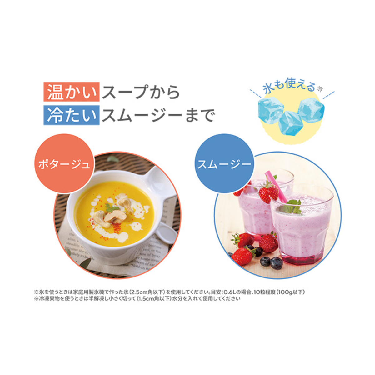 ※氷を使うときは家庭用製氷機で作った氷(2.5cm 角以下)12~13 粒程度(130g 以下)を使用してください