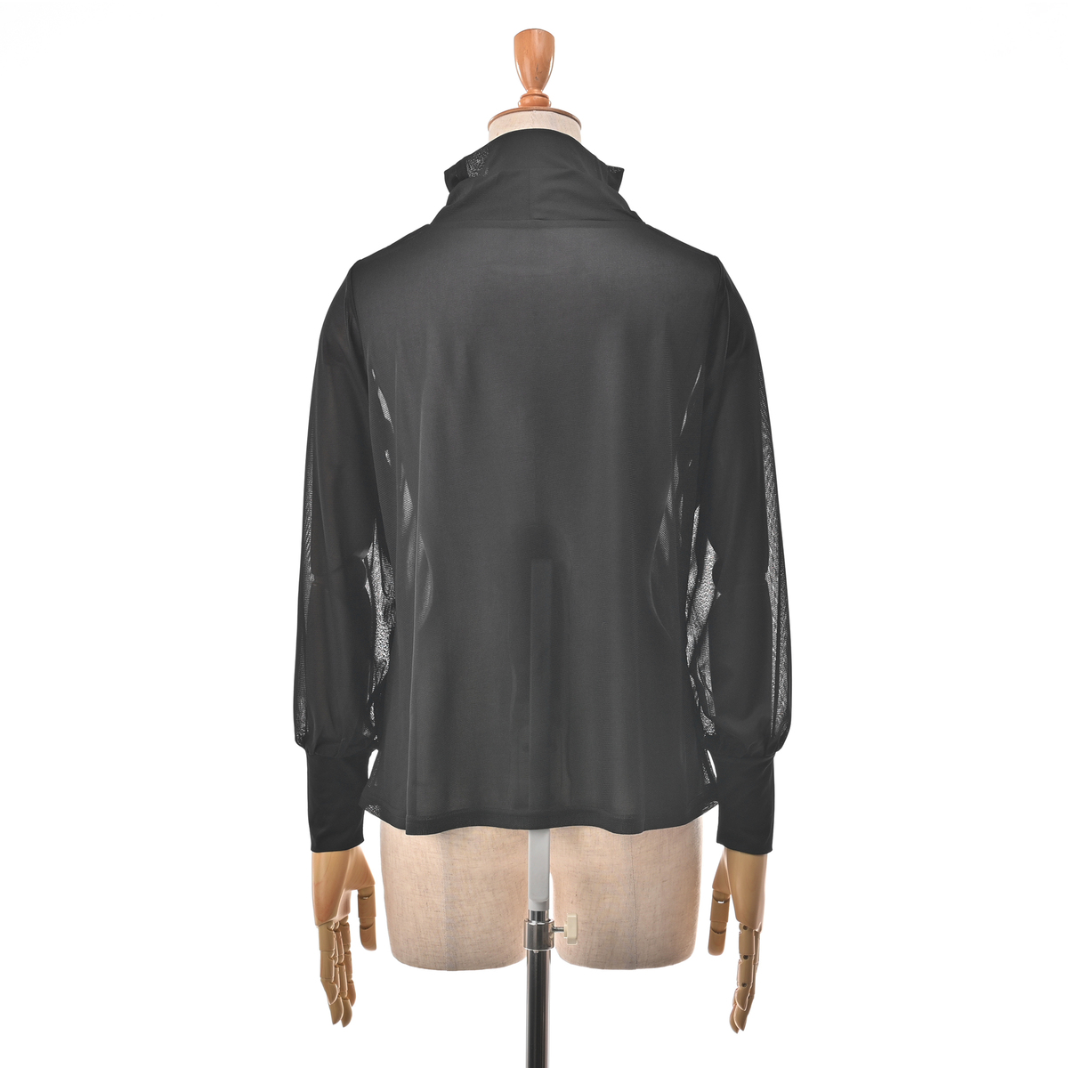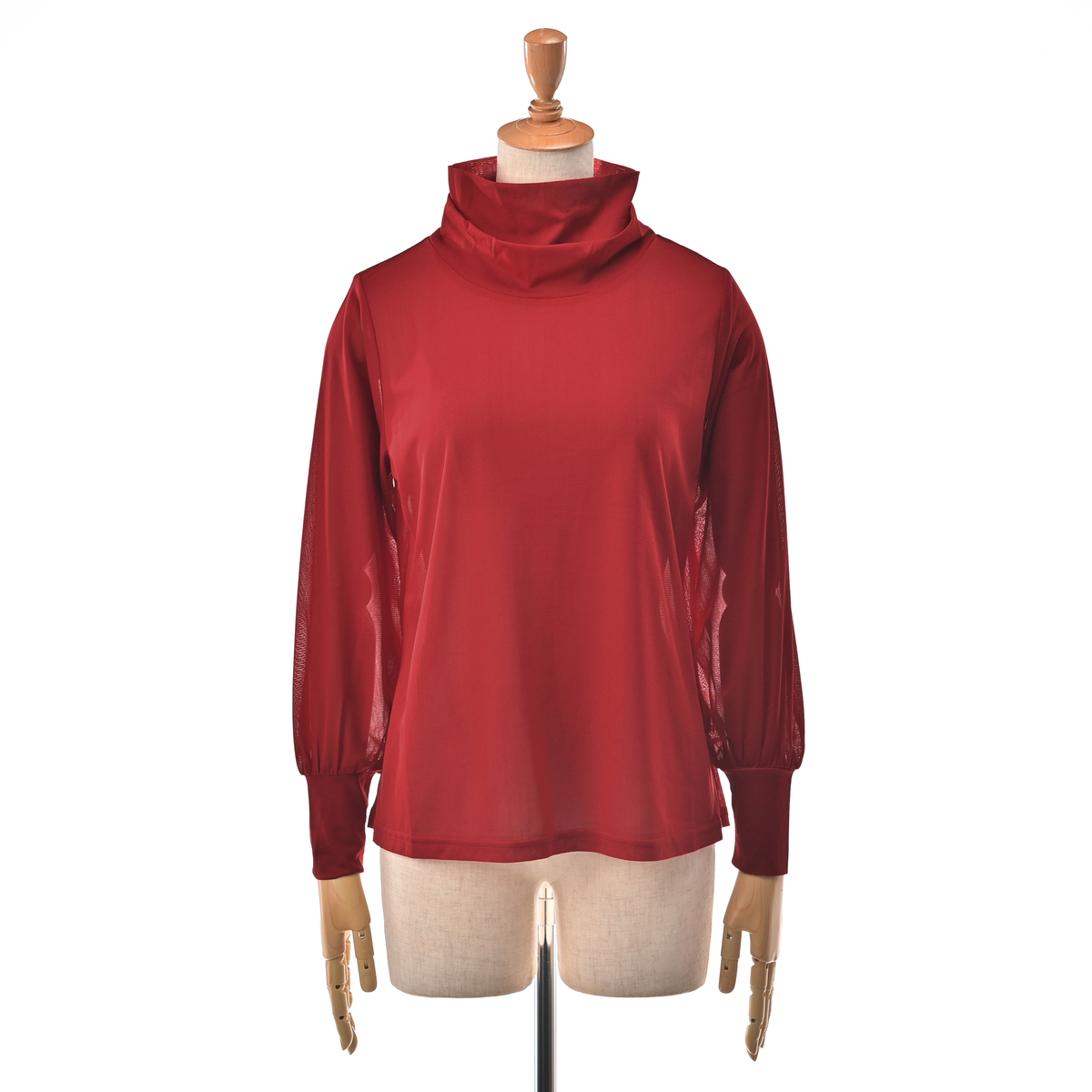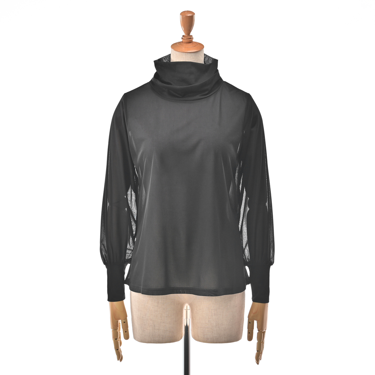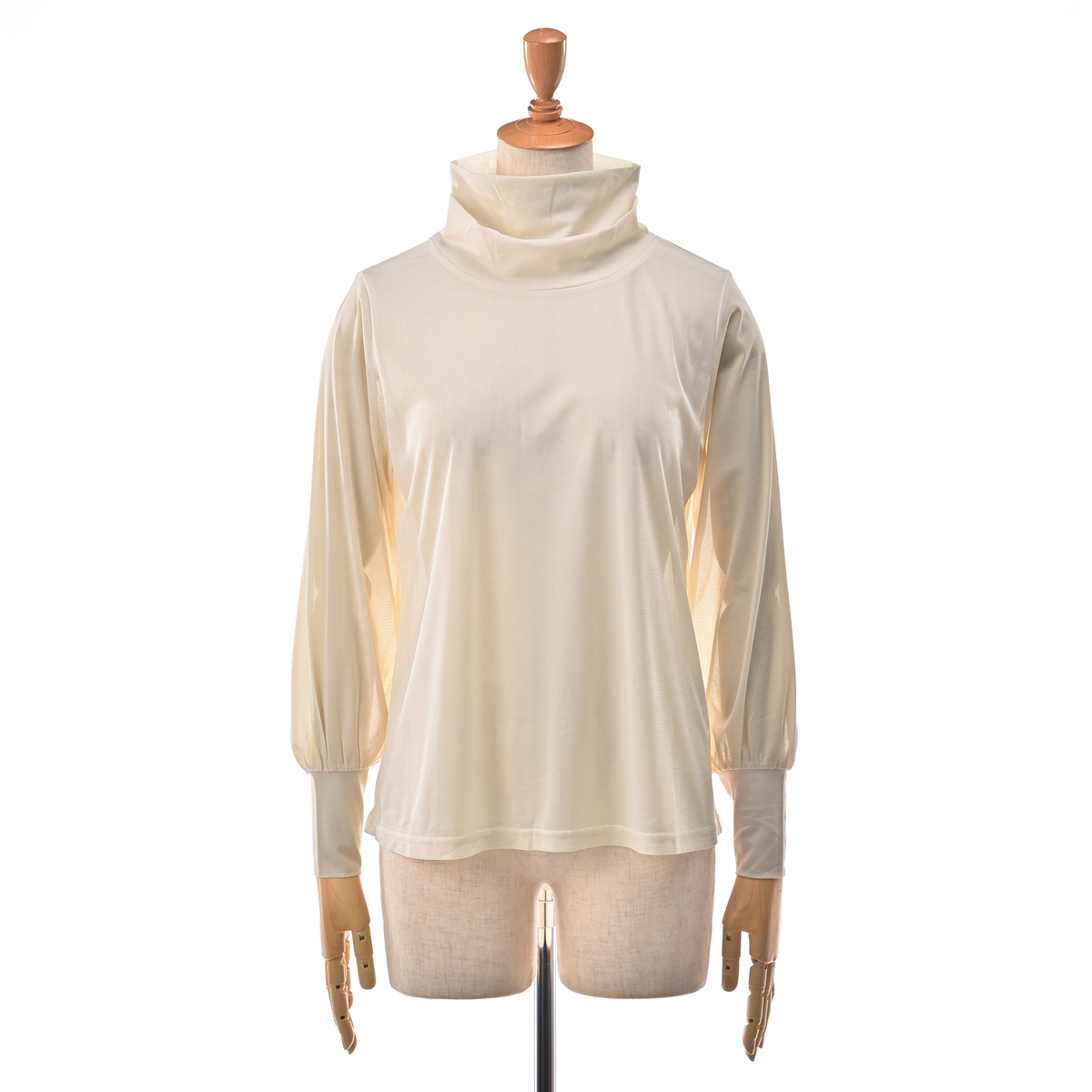 二重になったハイネックにモードなニュアンスが漂うデザイン。ゆとりある袖幅で、袖口部分は少し長めのカフスで手首を細く見せ、袖口の切り替えにギャザーを寄せたふんわり袖に。アウターを脱いだ際もスタイリッシュに決まります