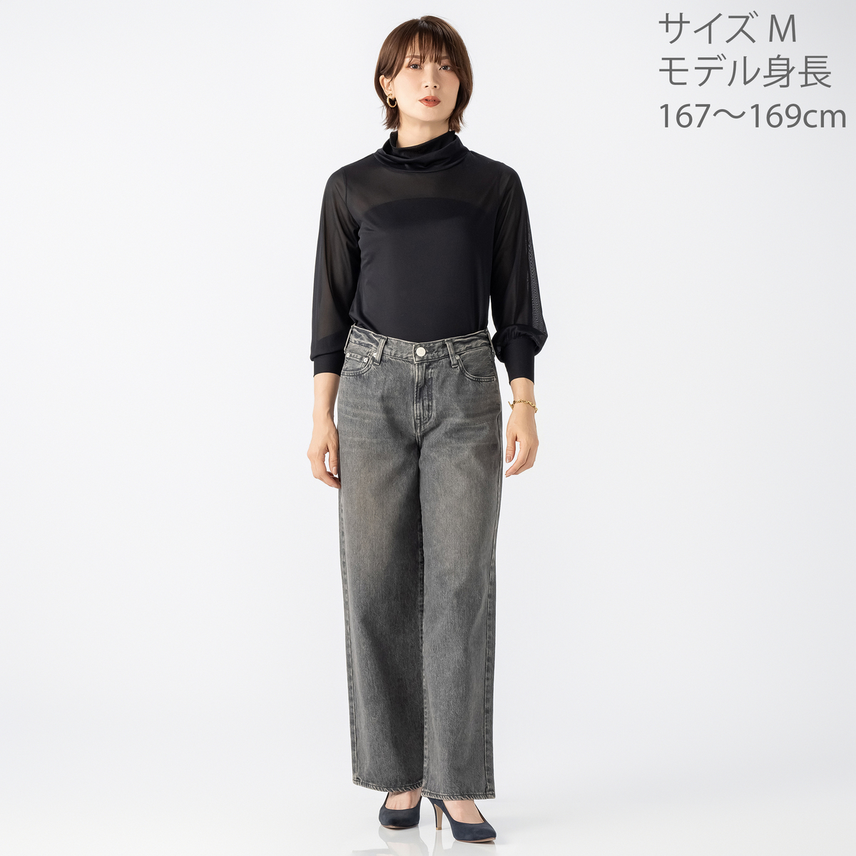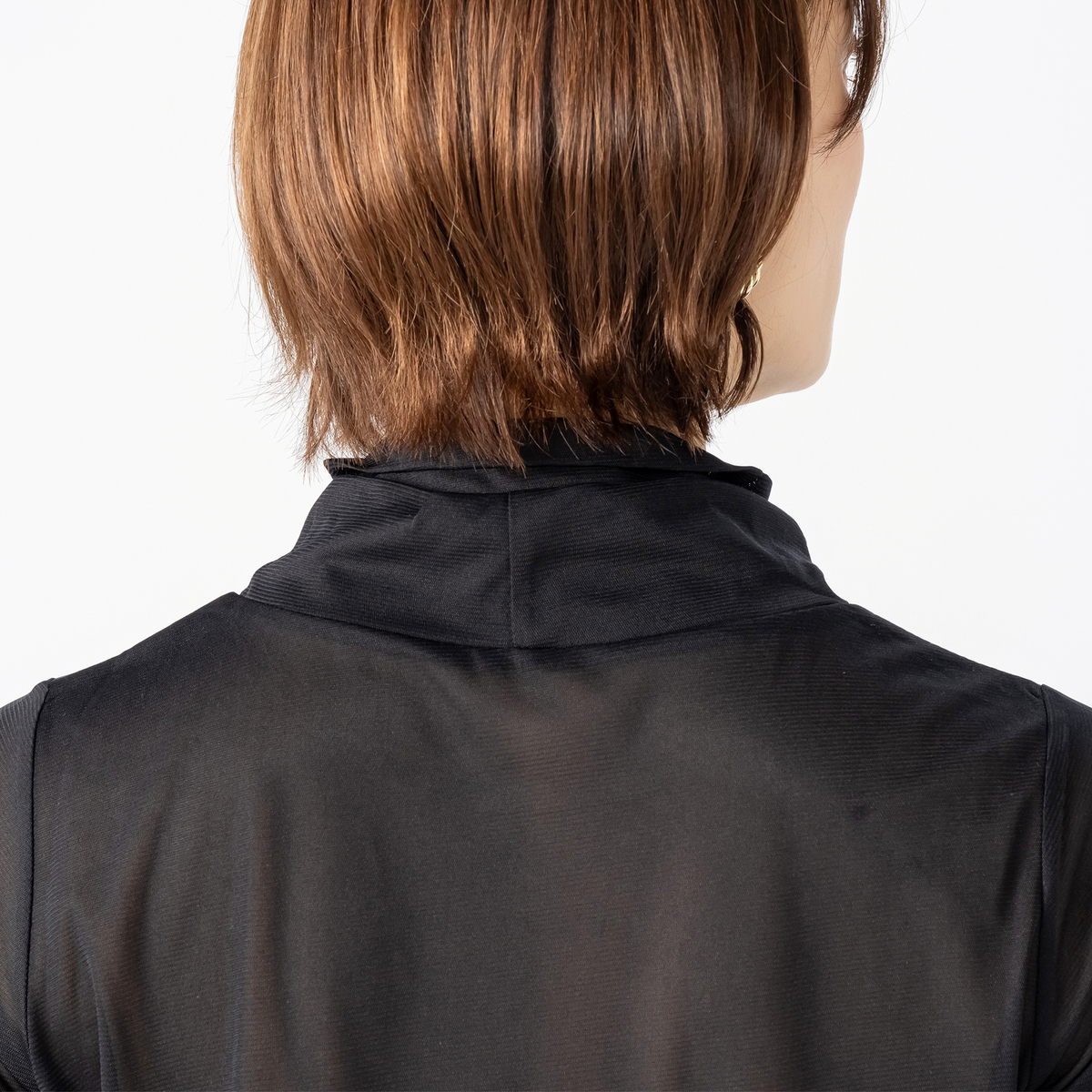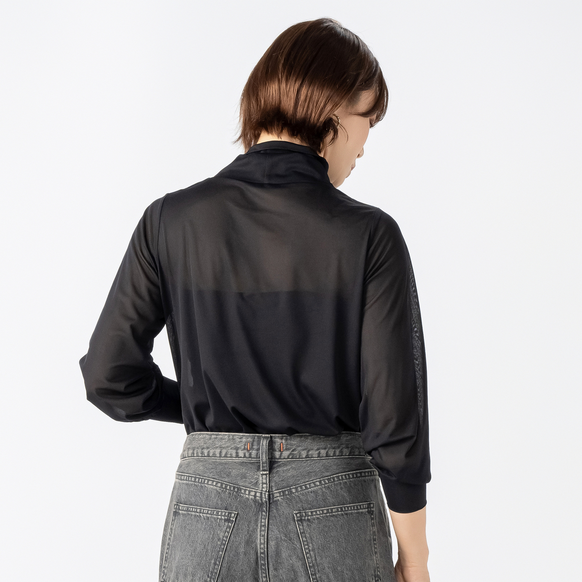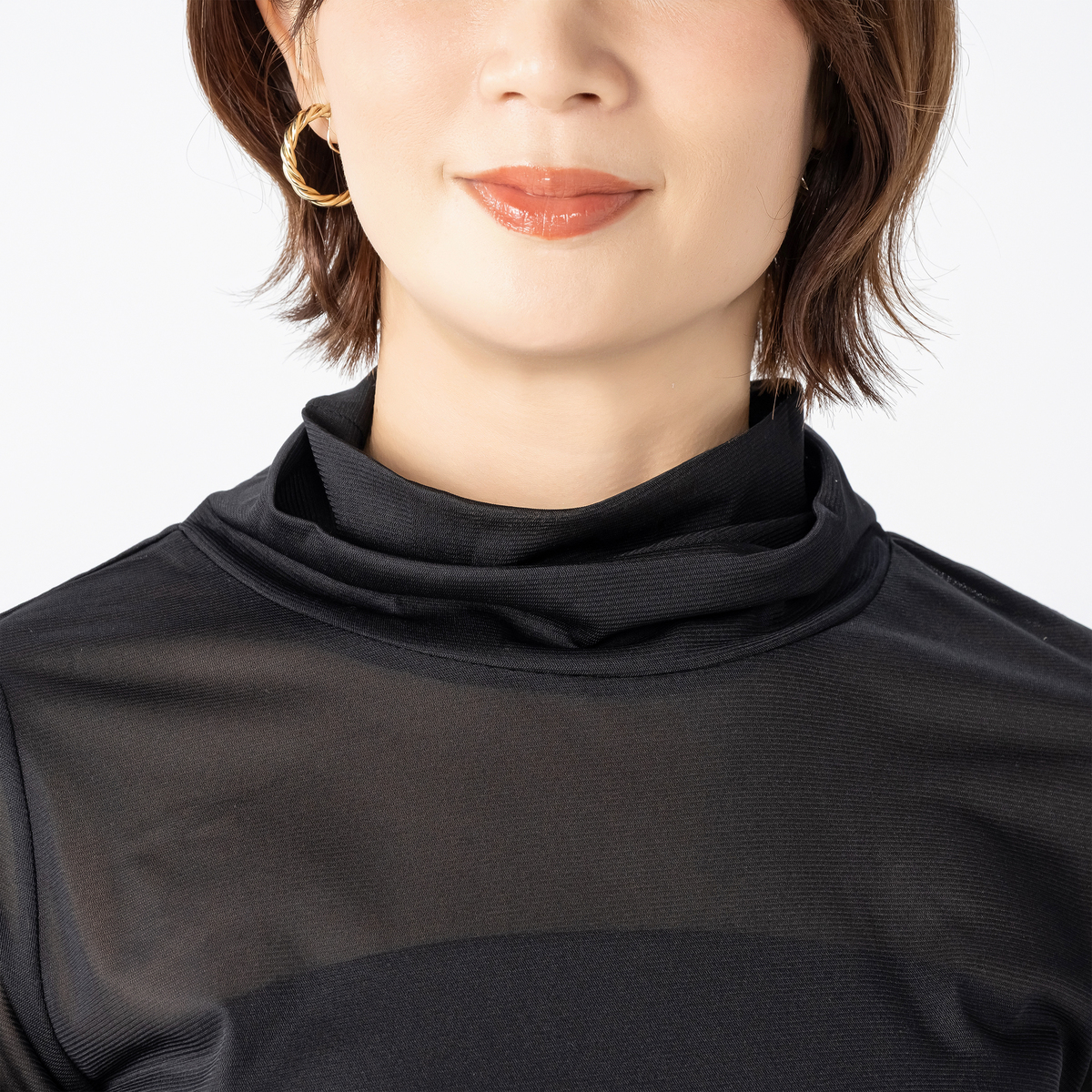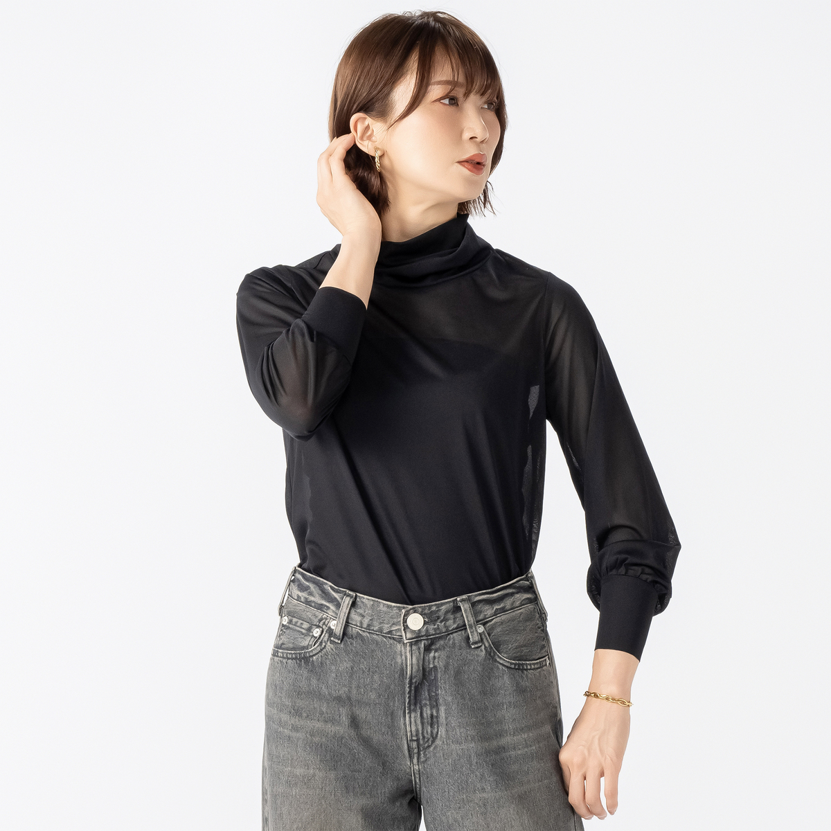 二重になったハイネックにモードなニュアンスが漂うデザイン。ゆとりある袖幅で、袖口部分は少し長めのカフスで手首を細く見せ、袖口の切り替えにギャザーを寄せたふんわり袖に。アウターを脱いだ際もスタイリッシュに決まります