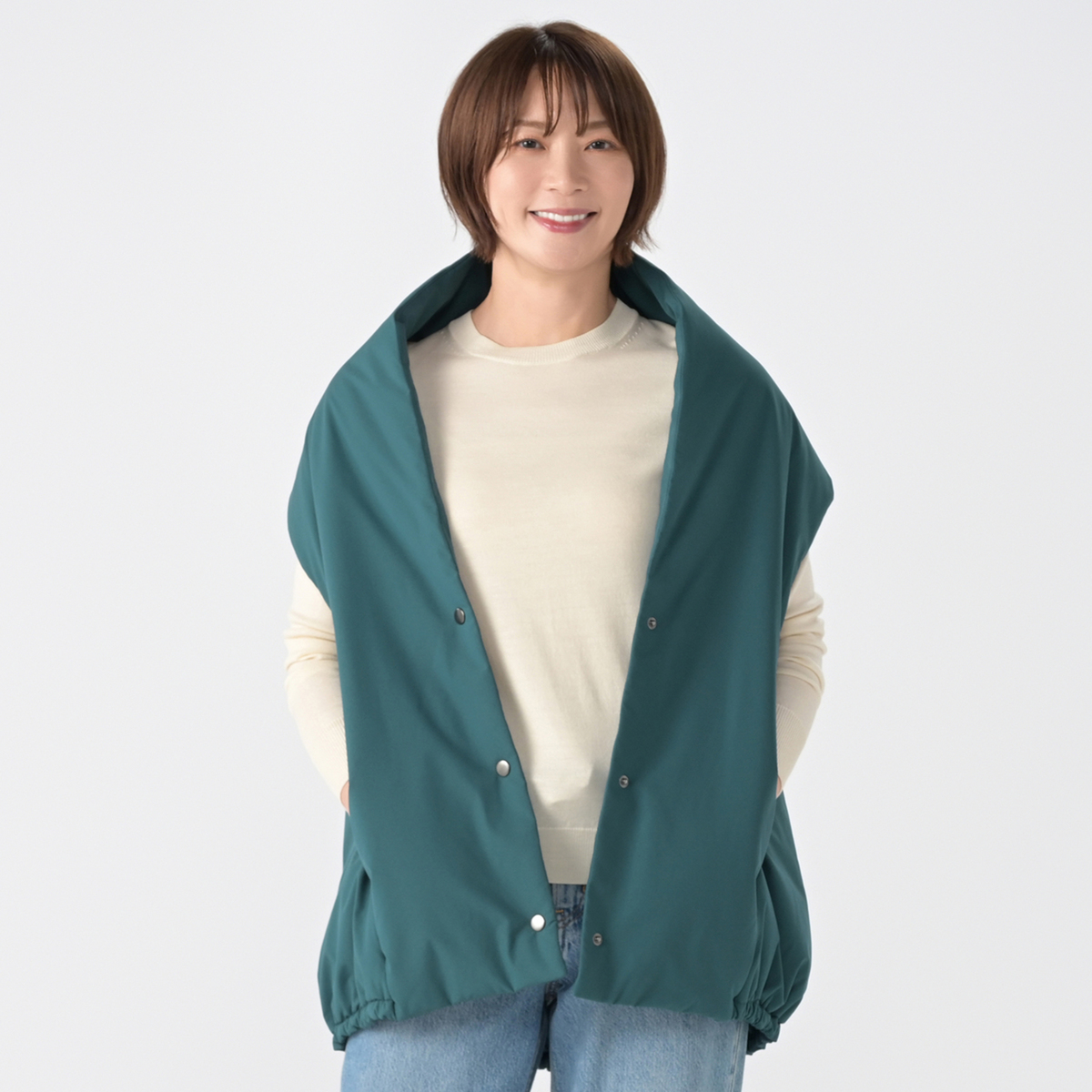 前のドットボタンを留める位置によって、首元のニュアンスやお顔まわりの雰囲気が変化。抜き襟風や首元を包むスタイルなど、その日の気分やシーンに合わせてアレンジできます