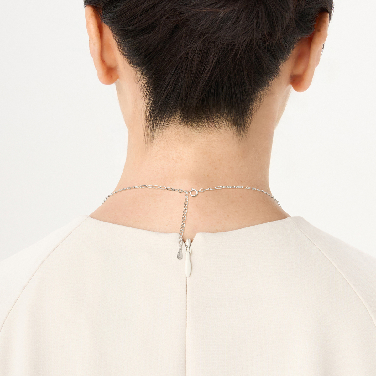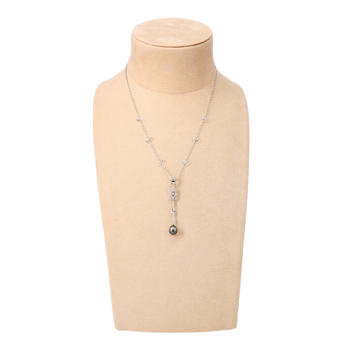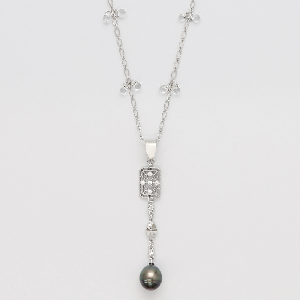 黒蝶真珠が揺らめくネックレス。縦長効果を意識したデザインがコーディネートになじみ、シンプルな装いにも静かな華やぎを与えてくれます