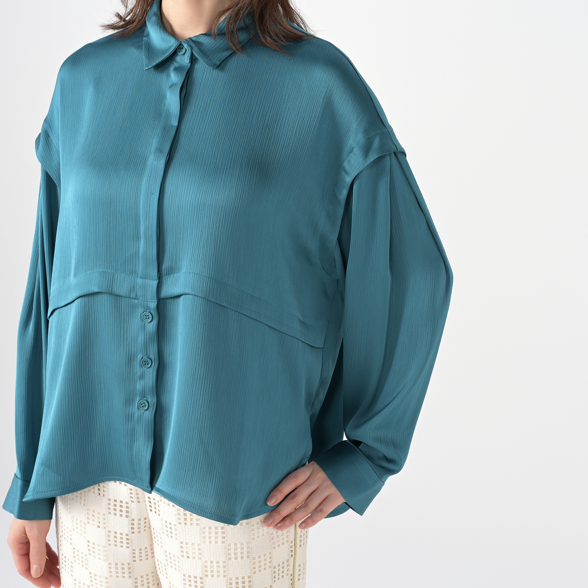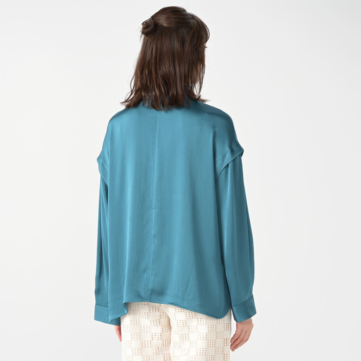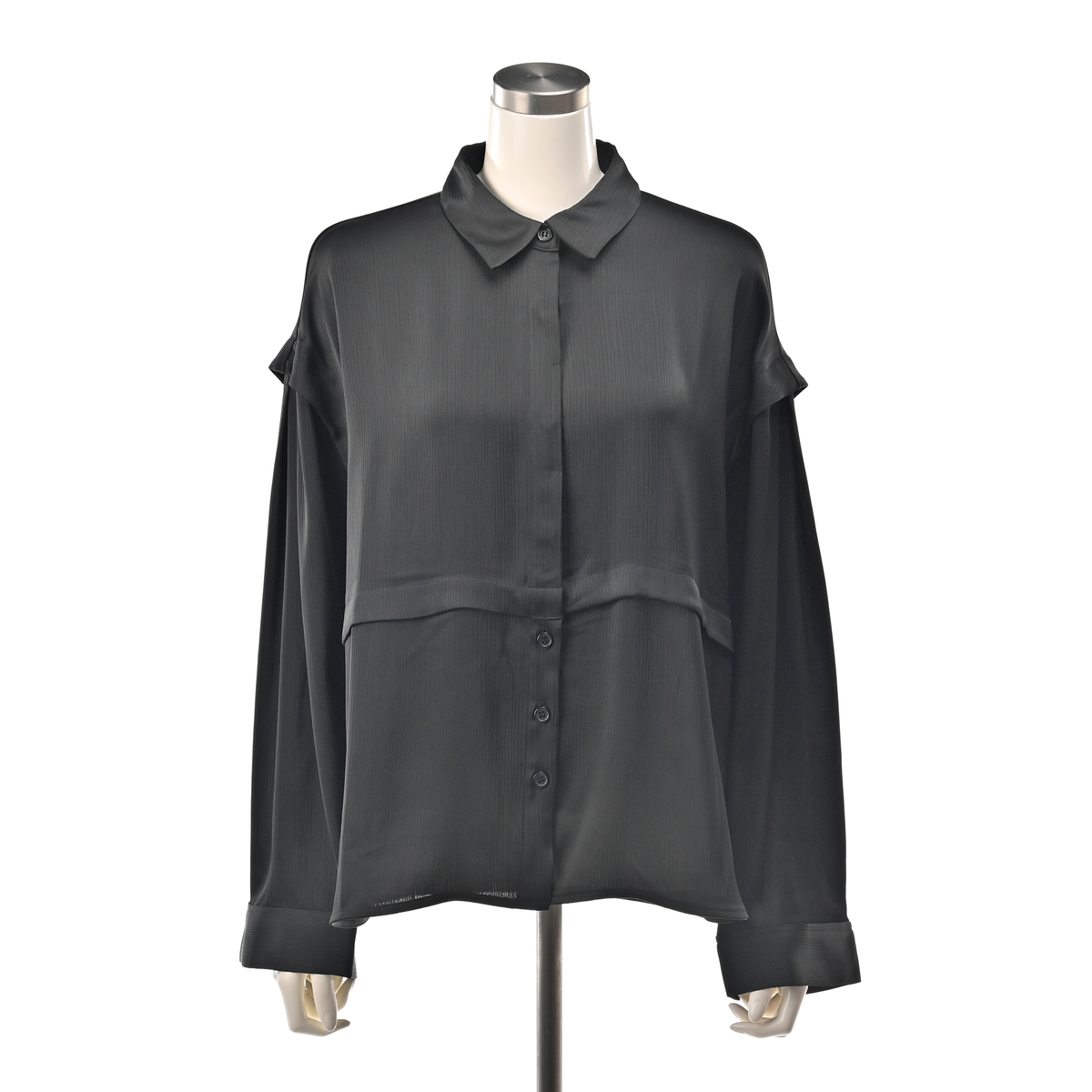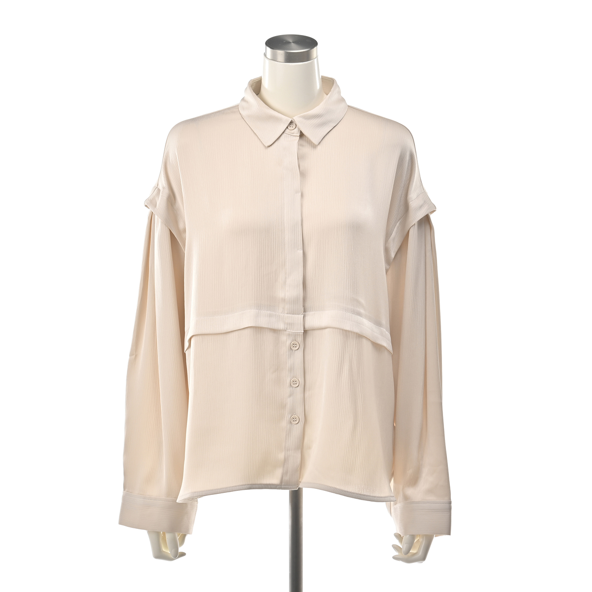 ポリエステルのやや光沢のある楊柳生地を使ったブラウス。ウエスト上と肩にタックを入れ、シャツの上にもう1枚ジレを着ているかのようなデザインに。袖山にもインバーテッドタックをいれ、袖の分量を出し動きやすさを追求しました