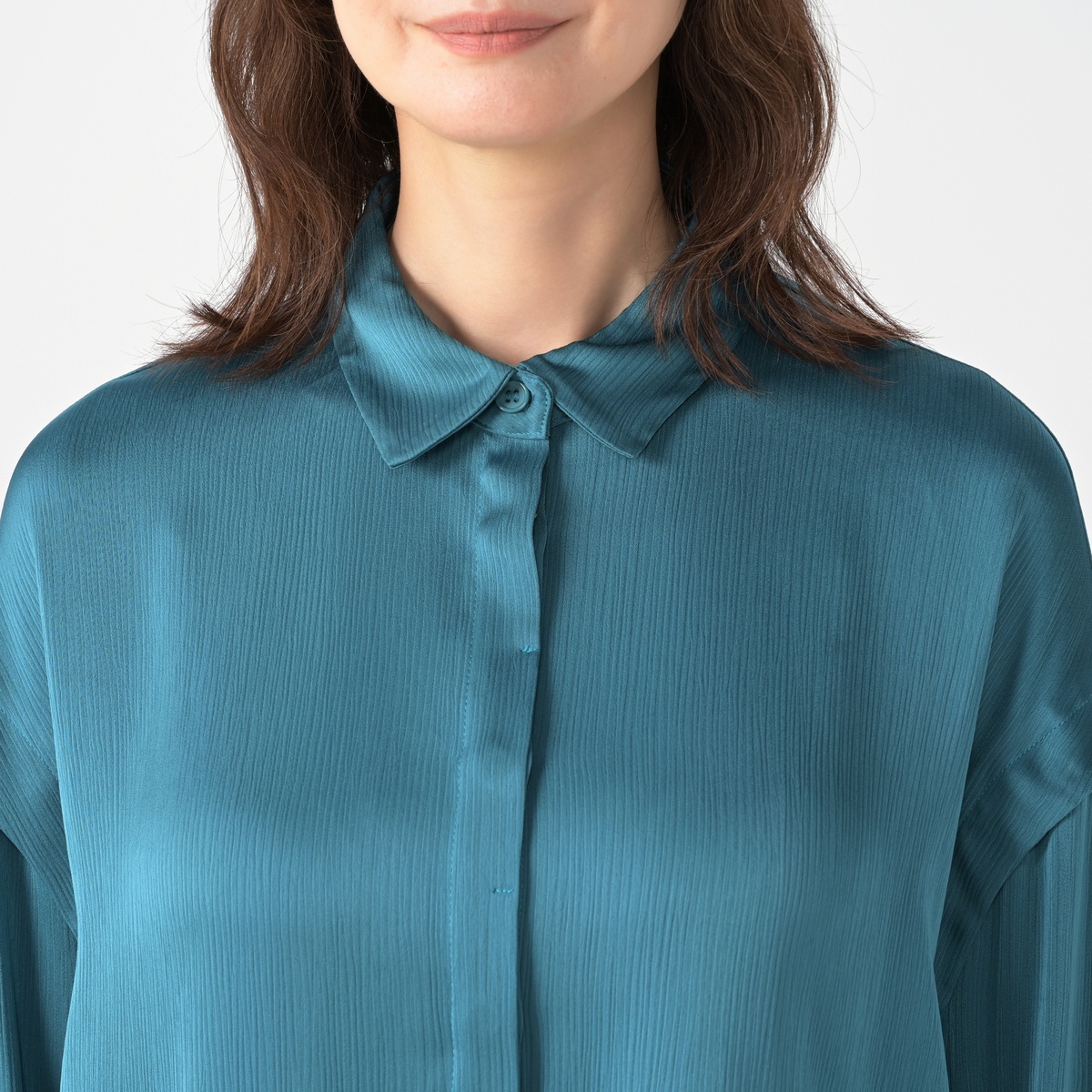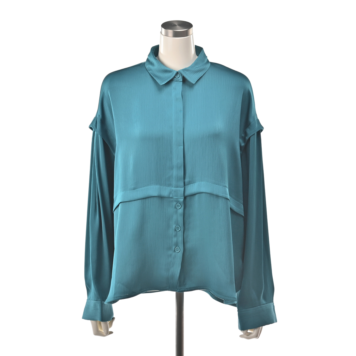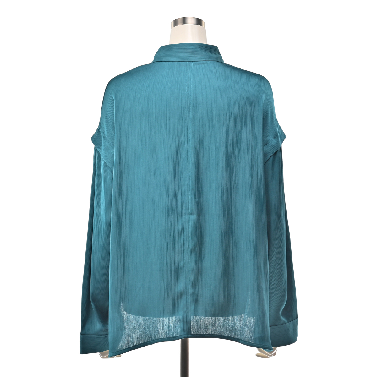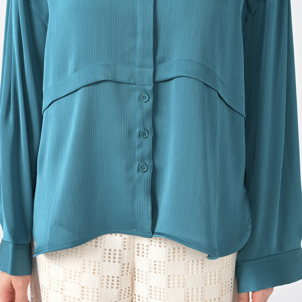 ポリエステルのやや光沢のある楊柳生地を使ったブラウス。ウエスト上と肩にタックを入れ、シャツの上にもう1枚ジレを着ているかのようなデザインに。袖山にもインバーテッドタックをいれ、袖の分量を出し動きやすさを追求しました