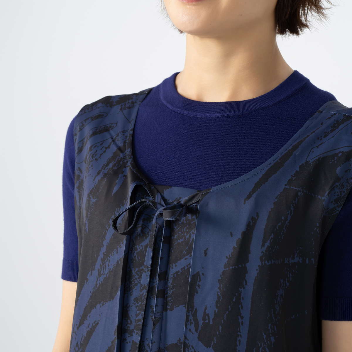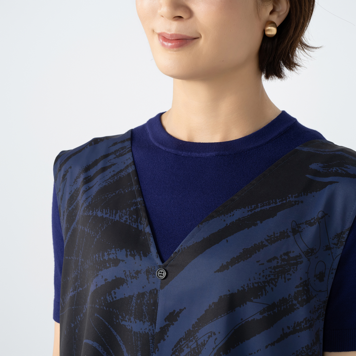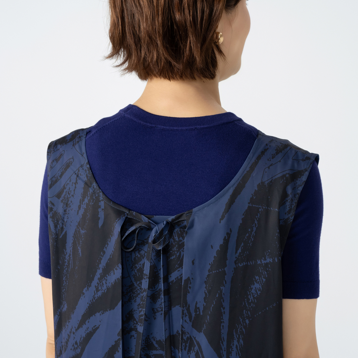 裾にスリットがありクールなイメージのVネックと、共布テープをリボン結びして少し柔らかいイメージの丸首の2WAY仕様。秋冬にはニットの上からでも着ることができ、インナーを変えて長い期間楽しめます