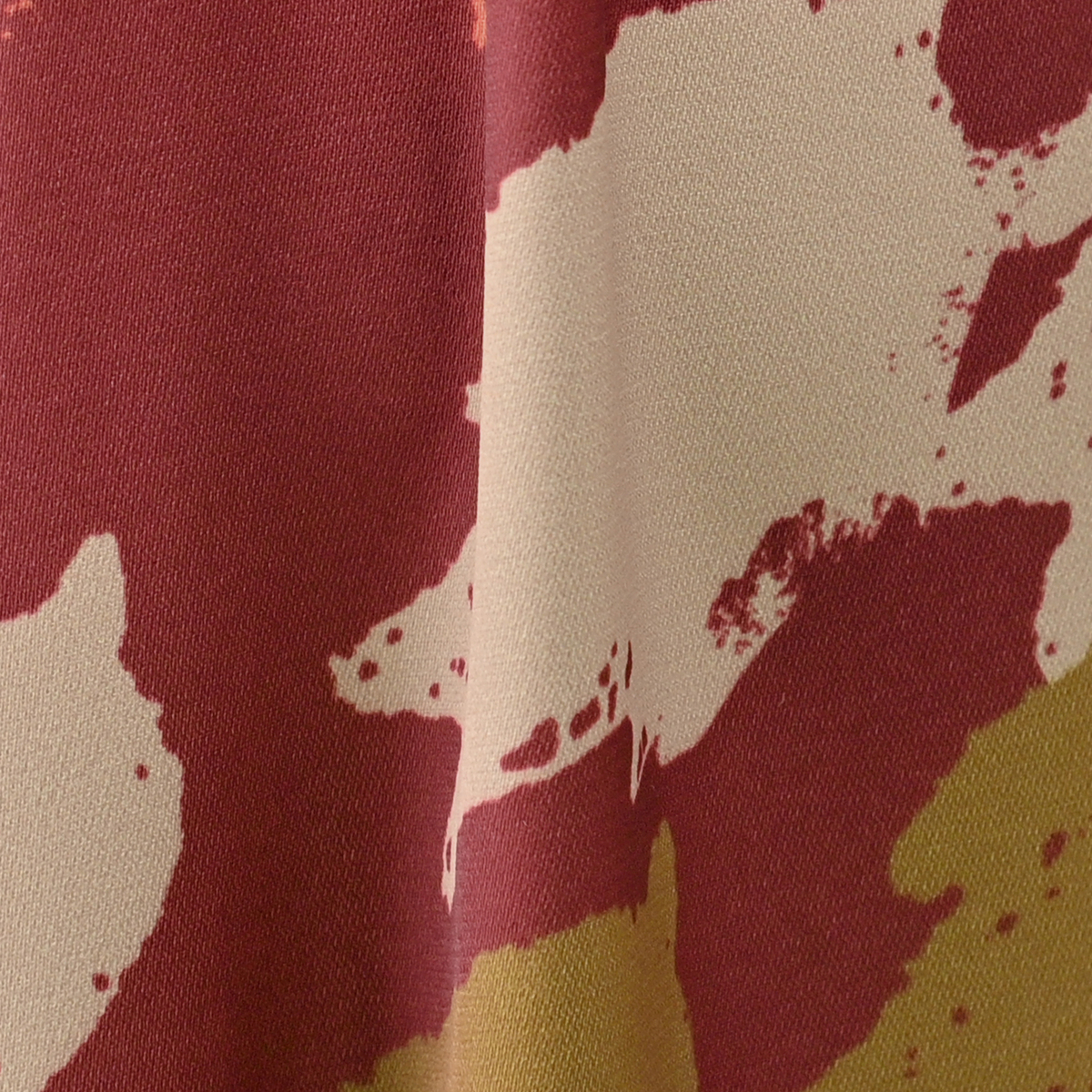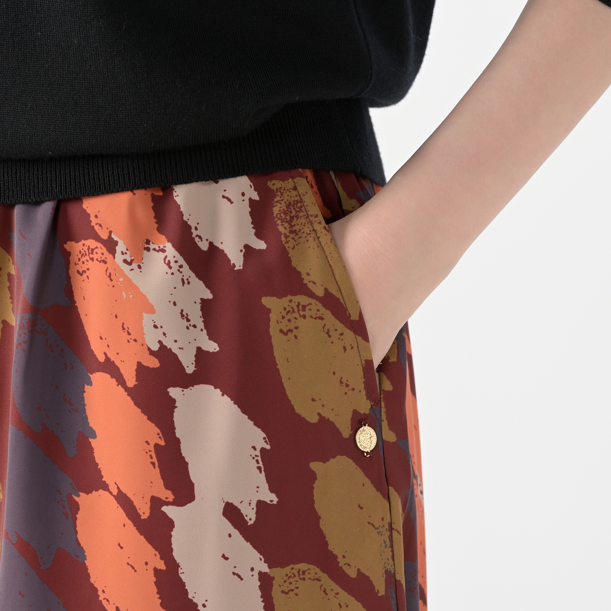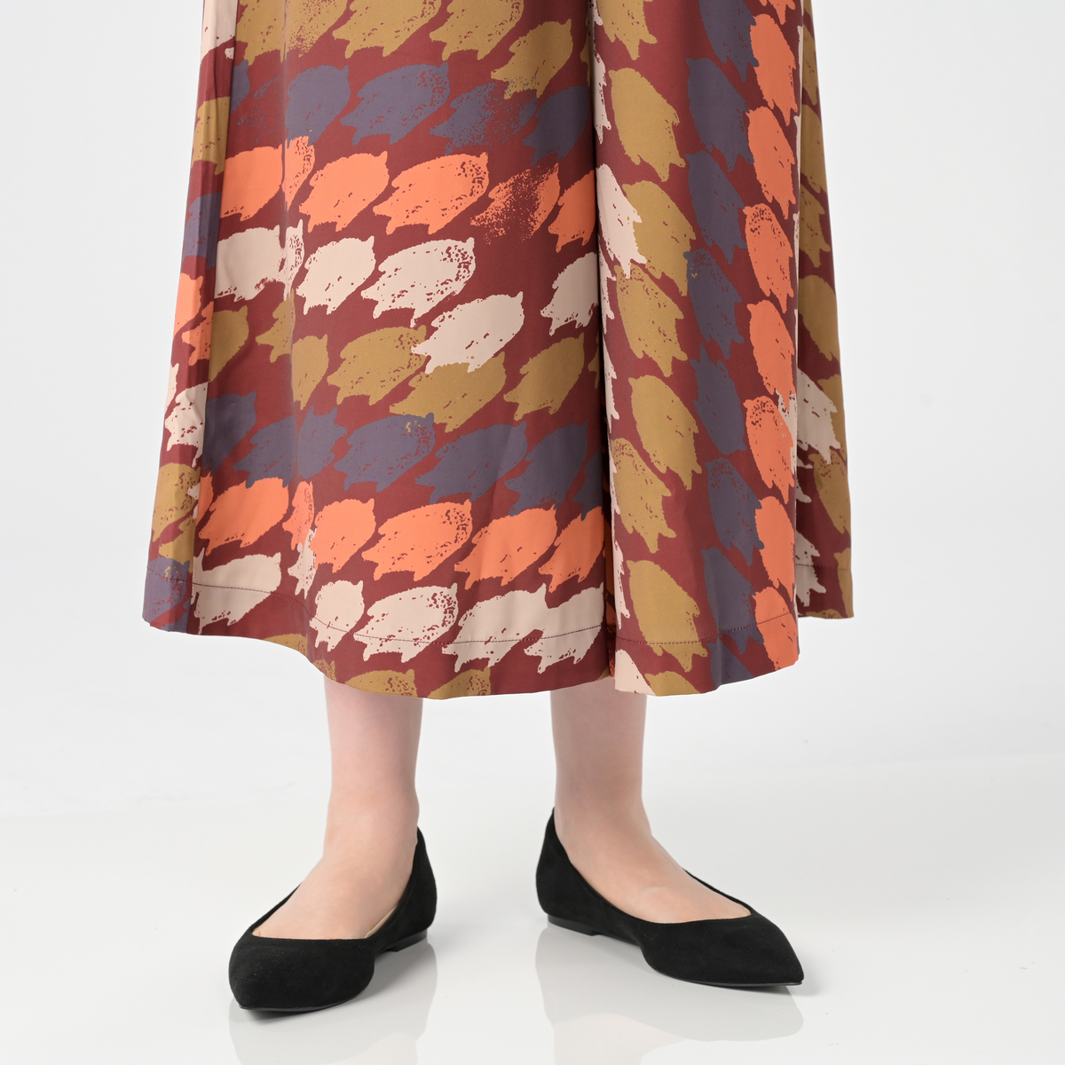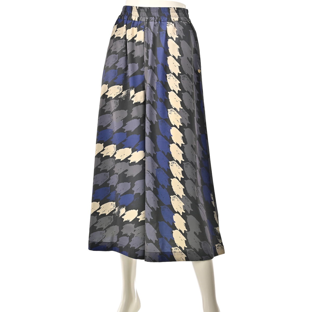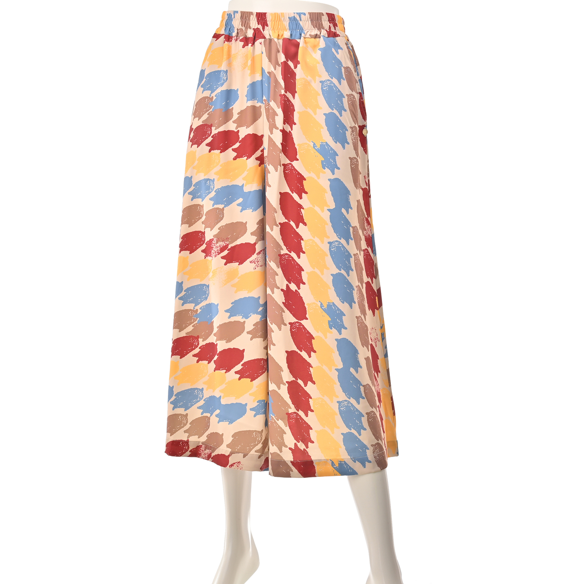 モダンアート風の千鳥プリントをあしらったガウチョパンツ。左右で柄の向きを変え、大きなグレンチェックの一部のようなデザインに。左脚は縦ラインが際立ち脚長効果を期待できます。一つ一つの千鳥柄を少しずらしたり、かすれさせたり、重なったり、反対を向かせたりと遊び心を感じるデザインです